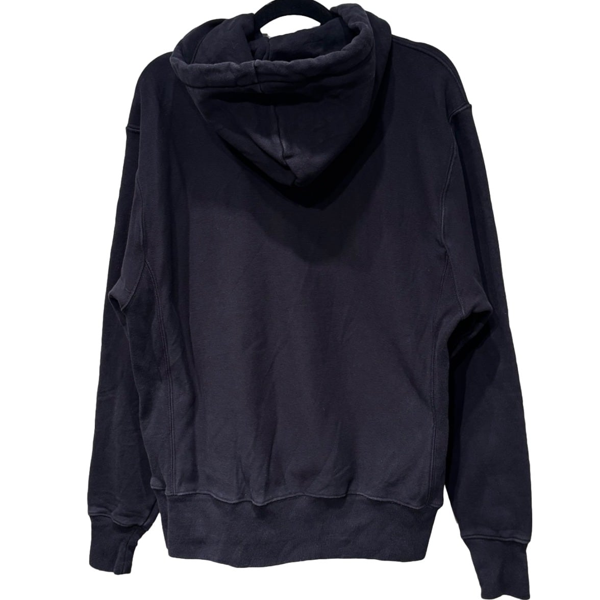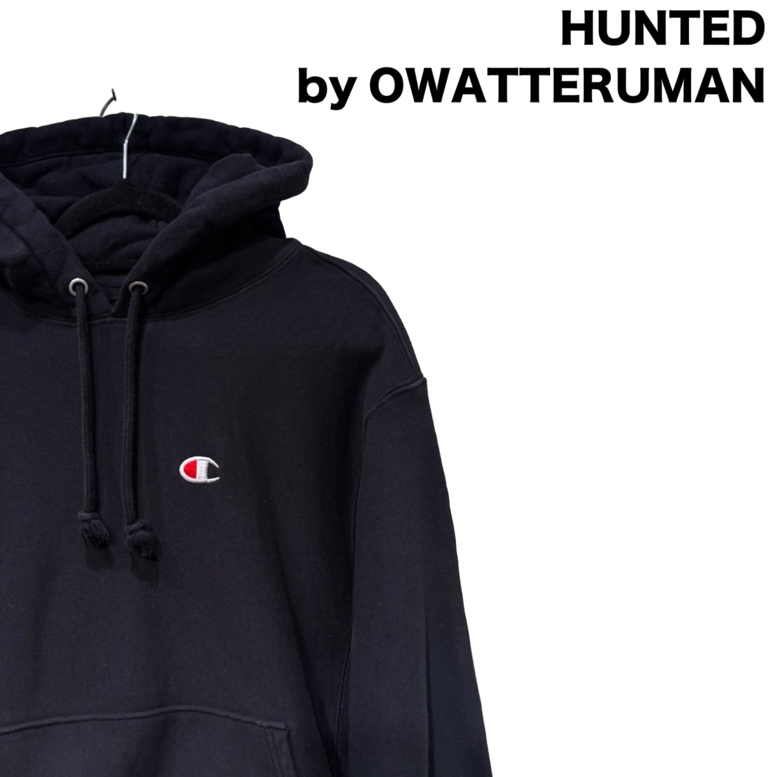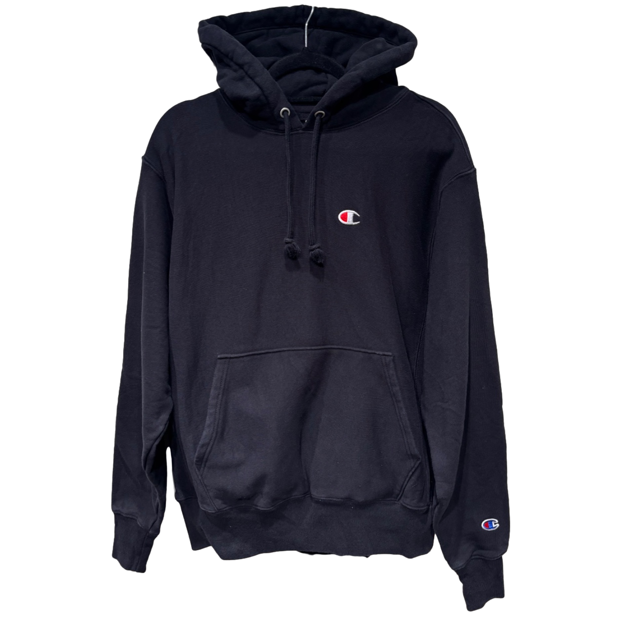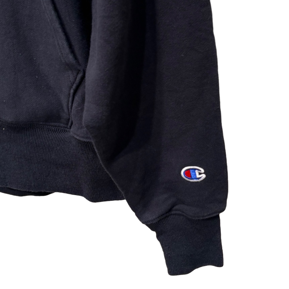 しっかりとした肉感の裏起毛スウェット生地で、フードは厚みがあり収納感のある作り。肩はややドロップした位置にステッチが入っており、身幅にゆとりがあるボックスシルエット寄りのサイズ感です。胸と袖口に入る小さめのChampion “C” 刺繍がワンポイントで効いていて、主張しすぎないミニマルさが使いやすい。カンガルーポケットとリブのテンションは程よく、ルーズに着てもだらしなくならないバランスです。
