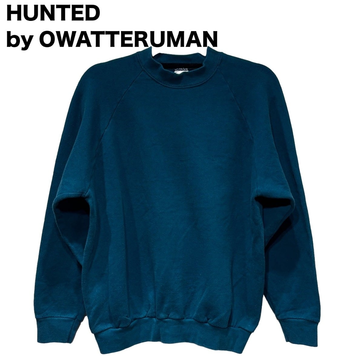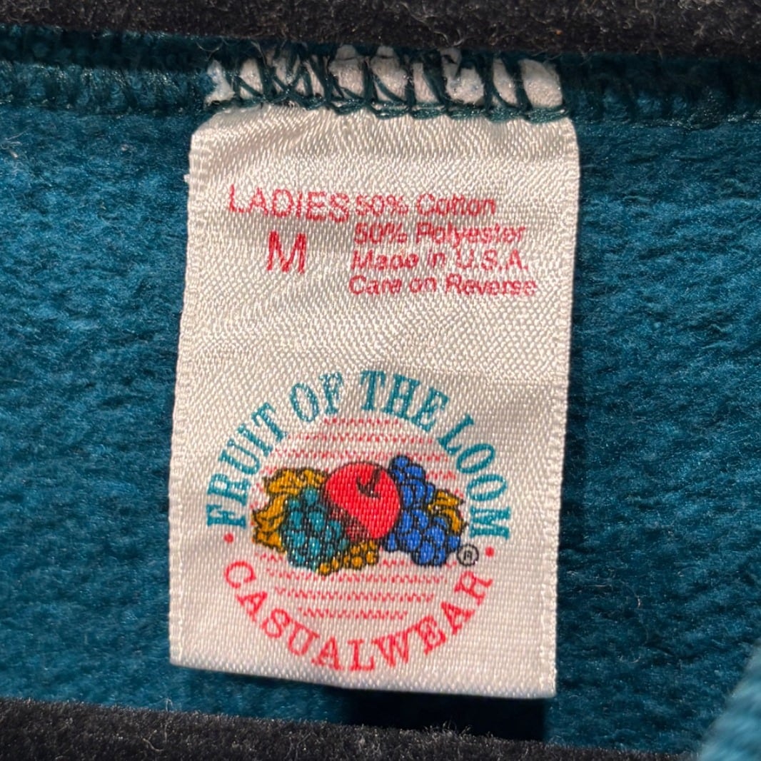 この個体は無地のクルーネック・ラグランスウェットで、タグに「FRUIT OF THE LOOM」「CASUALWEAR」「Made in U.S.A.」の表記、素材表記が50% Cotton 50% Polyesterであることから、アメリカのカジュアルウェアとして日常的に使われてきた1枚と判断できる。50/50混紡の裏起毛ボディは80〜90sに多く見られる仕様だが、タグ表記のみが根拠のため年代は推定(90s)としている。