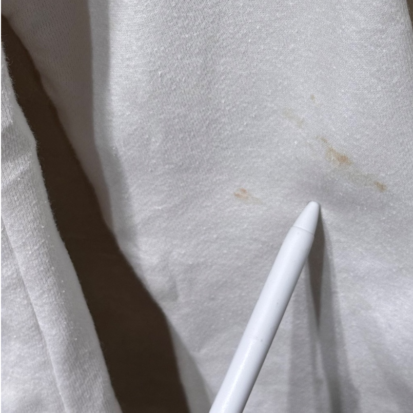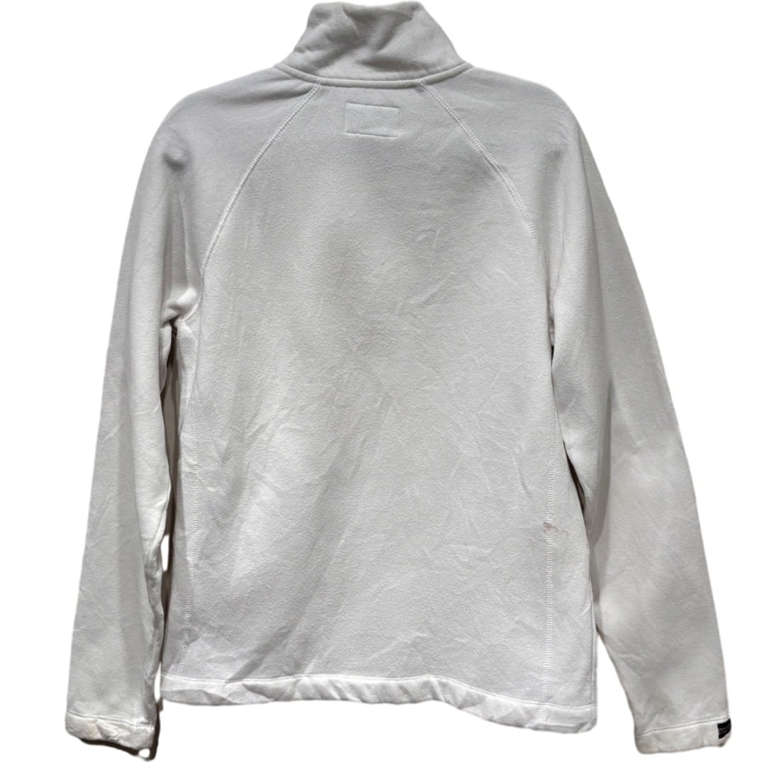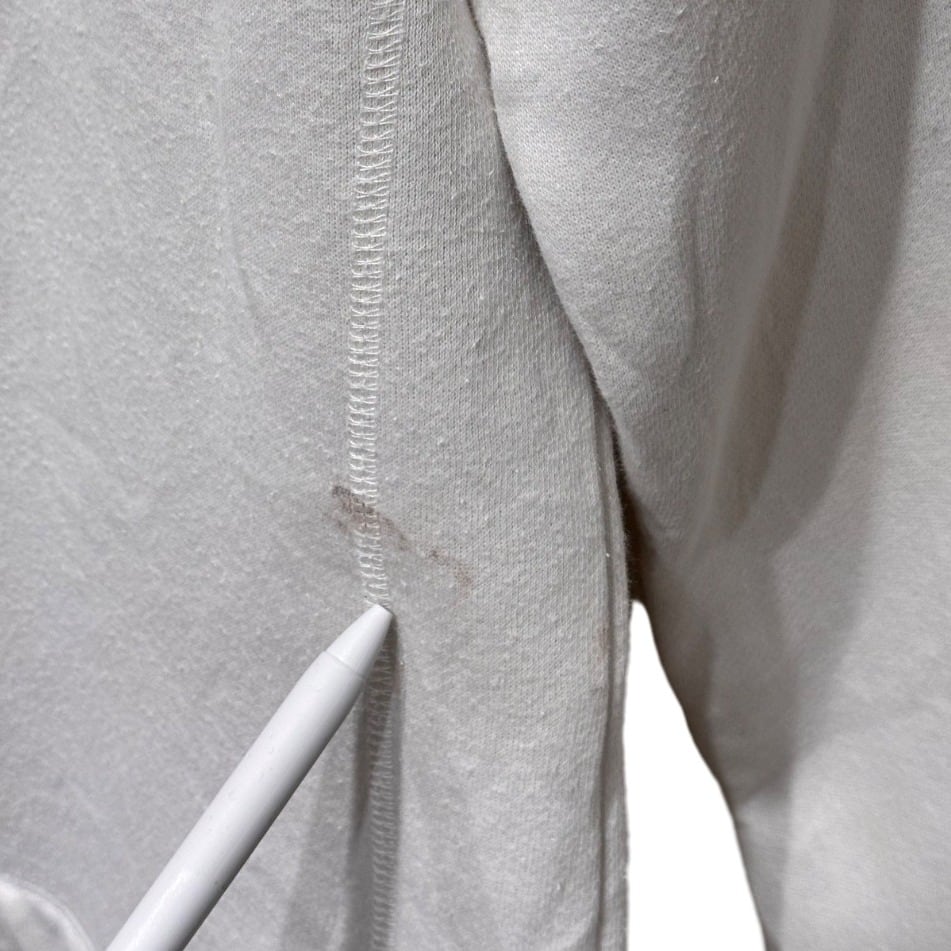 ラグランスリーブとハイネックのハーフジップで、首元の調整がしやすい設計。裏はループパイルに近い起毛が見られ、コットン混の柔らかさとポリエステルの軽さが両立した生地感で、厚すぎないのでインナーにもアウターにも使いやすい。胸のBUCKNELL刺繍はワンポイントで主張がありつつも大げさにならないサイズ感。裾の小さなJansportピスネームなどブランドのディテールも残る一枚。画像で確認できるように右脇付近と右袖に茶色いシミが複数あり、裾や袖口にも使用による汚れ・スレが見られるためコンディションは使用感ありと判断できる(目立つ穴や大きな破れは確認できない)。