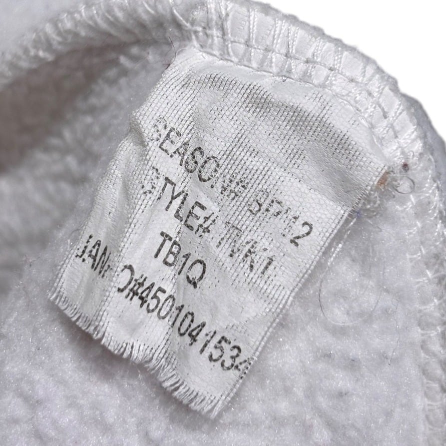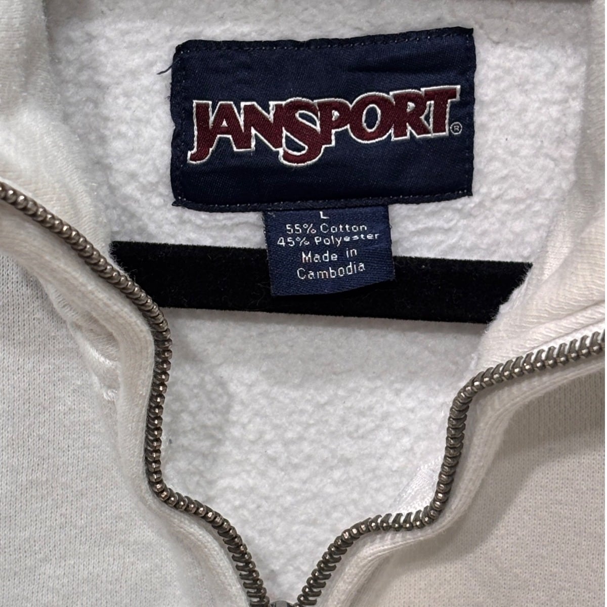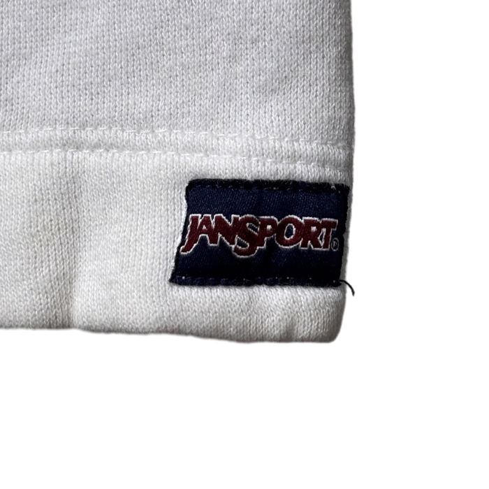 カレッジロゴを胸に配したハーフジップスウェットは、アメリカの大学アイテムを日常着に落とし込む定番の一枚。今回の個体はJANSPORTのネームと「Made in Cambodia」「55% Cotton 45% Polyester」の混紡表記が確認でき、製造国表記から2000年代以降の量産期モデルと推定される(推定の根拠:タグの生産国と混紡比)。ラグランスリーブ+ハーフジップの仕様で、カレッジアイテムらしい肩周りの動きやすさを重視した作りになっています。