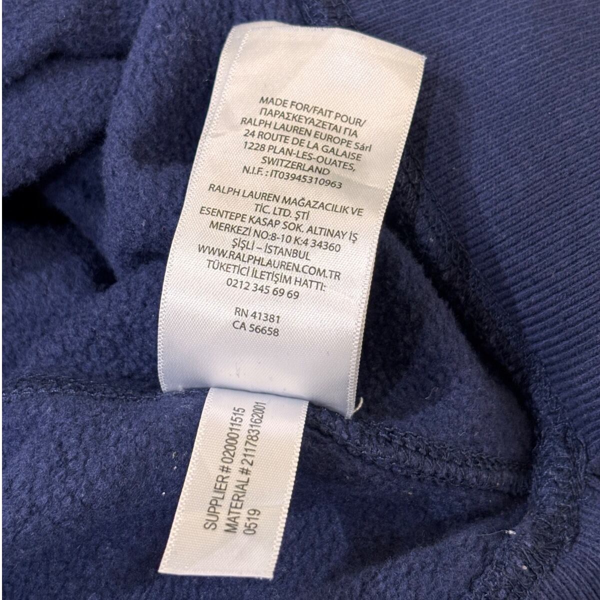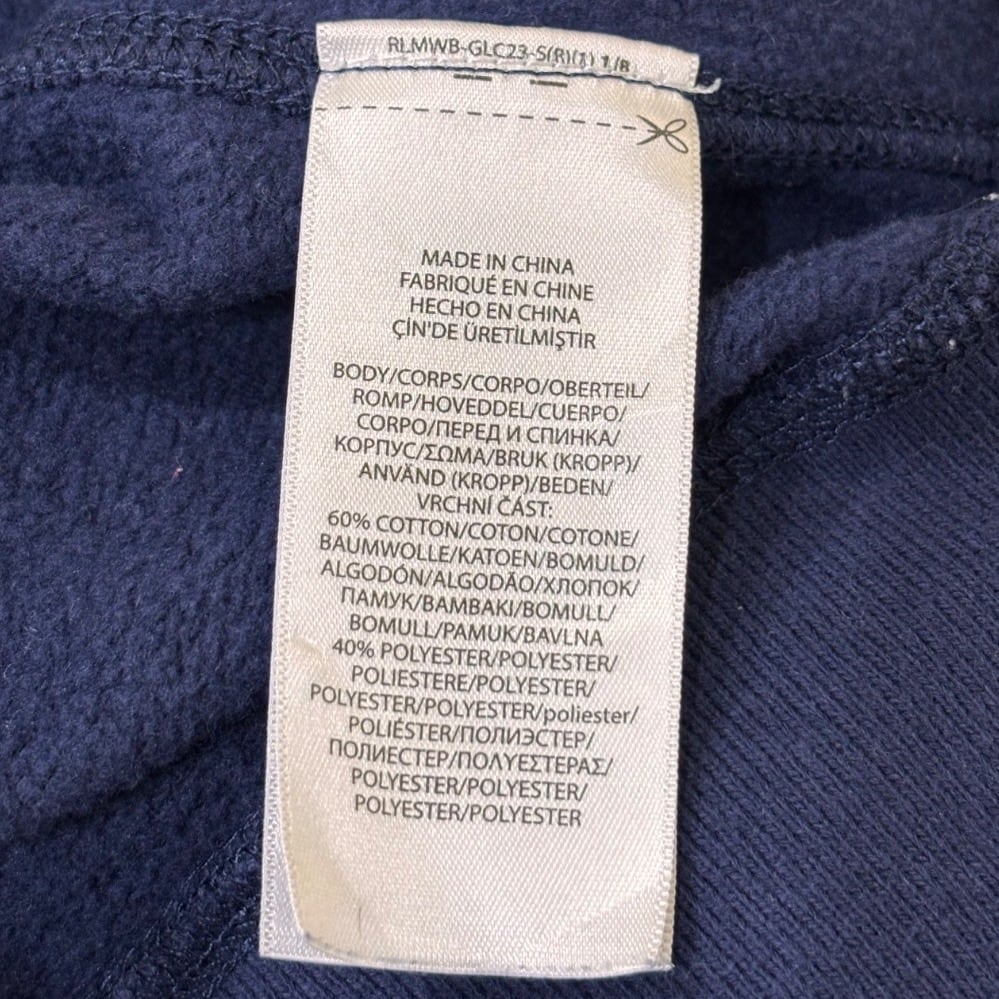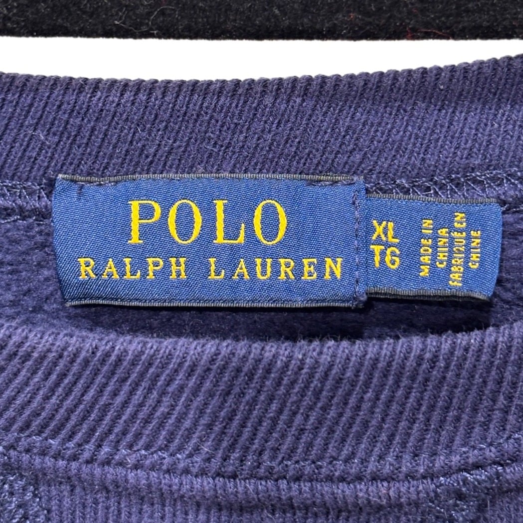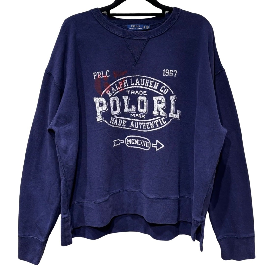 クルーネックスウェットはアメリカのカレッジ/ワークウェア由来の定番アイテムで、Poloのこうしたグラフィックは「ヘリテージ」を示す演出として用いられます。本品はネイビーボディに大ぶりのクラックプリント(POLO RL MADE AUTHENTIC等)を配した仕様で、プリントのひび割れ表情でヴィンテージ風のルックを出しています。タグは青地に黄色のPOLO RALPH LAUREN刺繍ラベル、素材タグは60%綿/40%ポリエステル、さらにサプライヤータグに"0519"表記が見られることから、工場生産による近年品(2010年代後半と推定)であると判断しています。