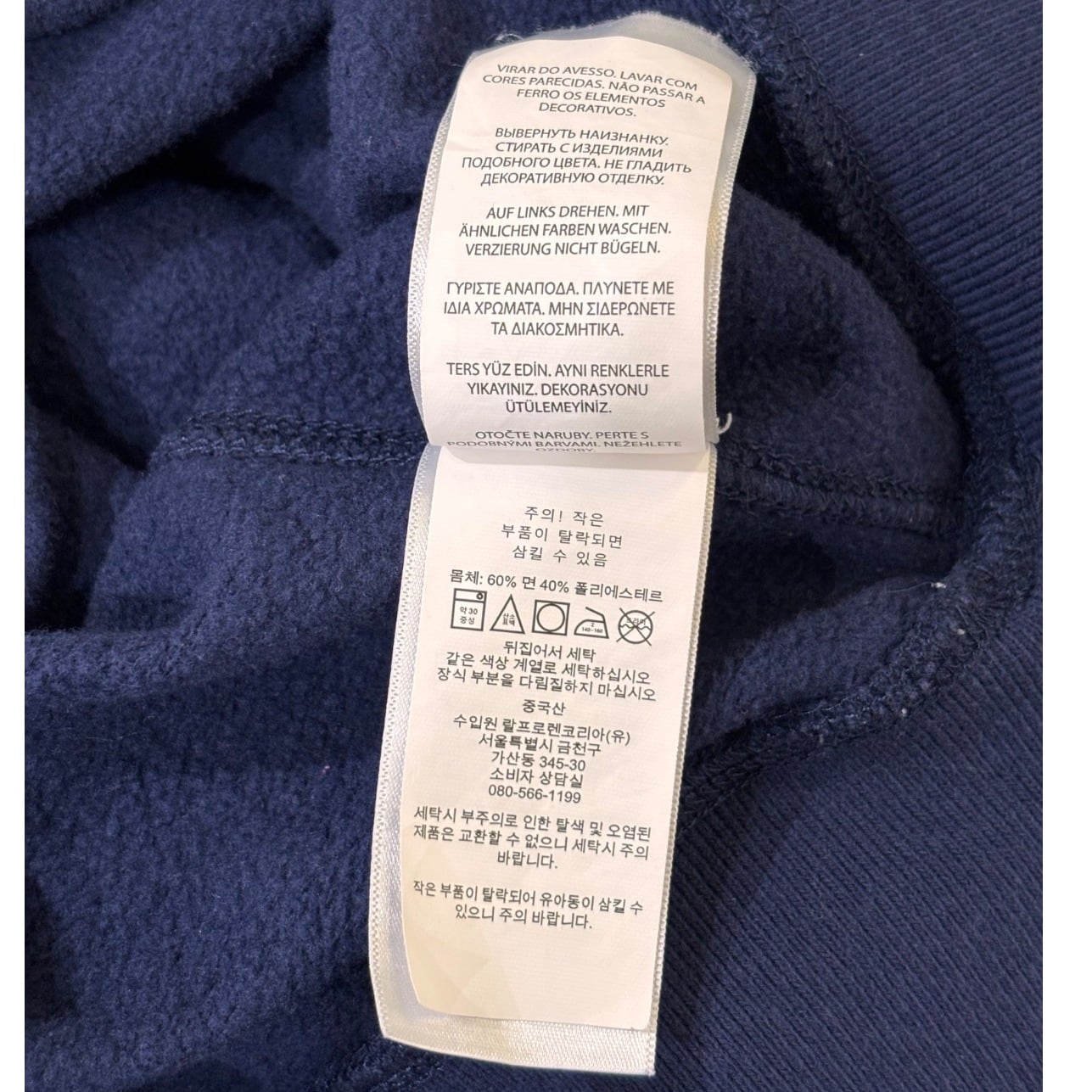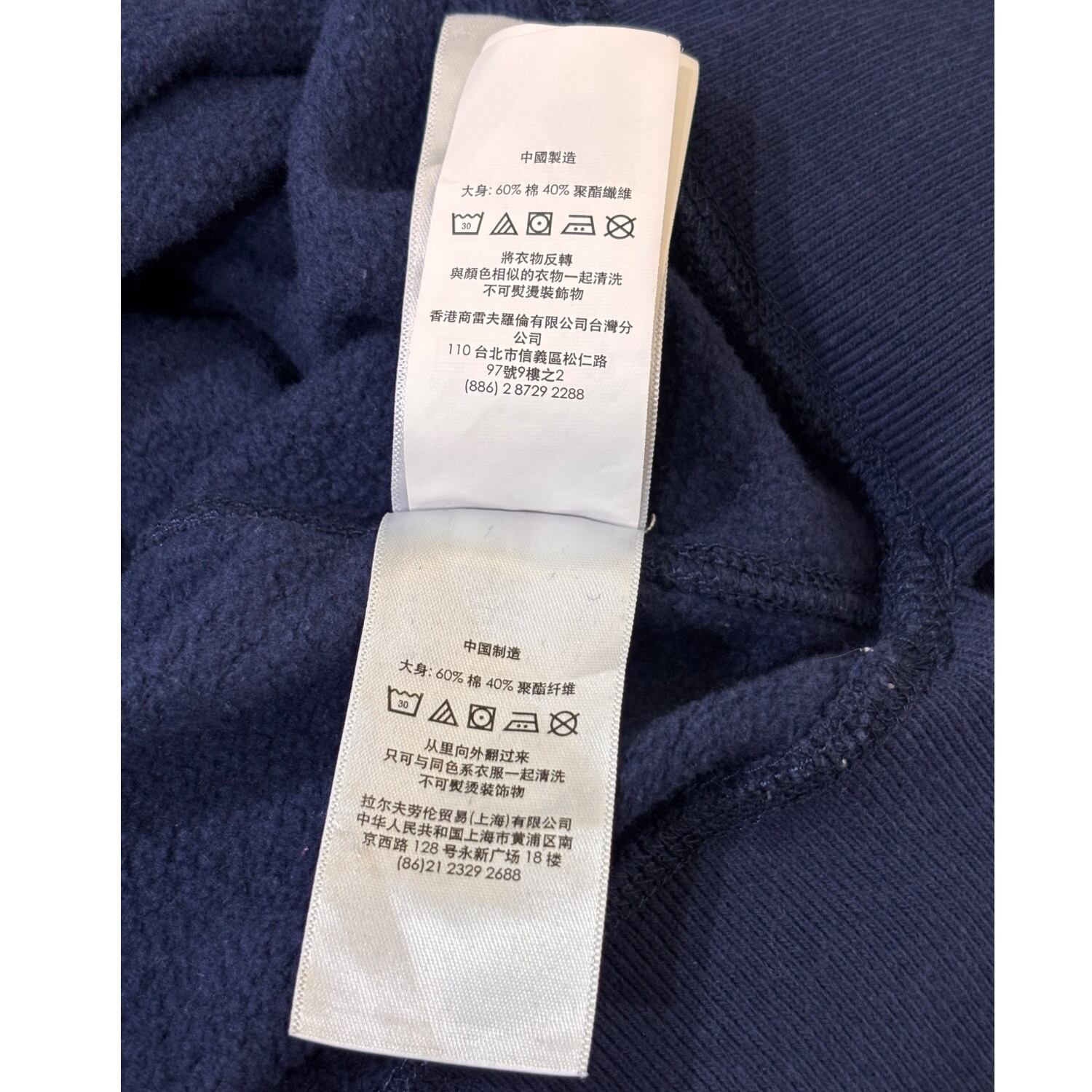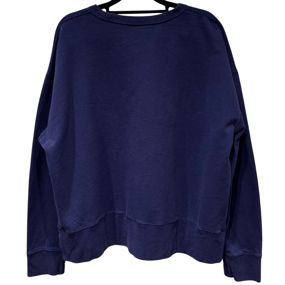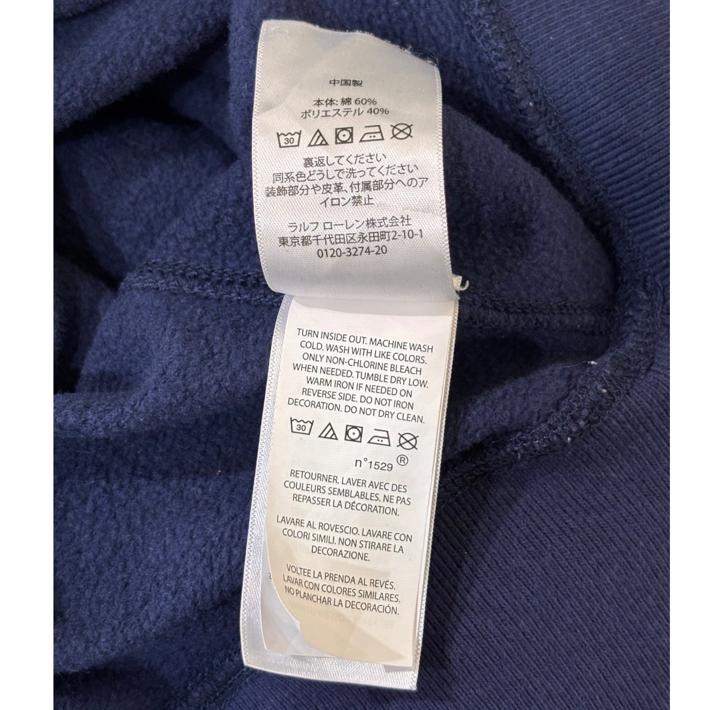 クルーネックスウェットはアメリカのカレッジ/ワークウェア由来の定番アイテムで、Poloのこうしたグラフィックは「ヘリテージ」を示す演出として用いられます。本品はネイビーボディに大ぶりのクラックプリント(POLO RL MADE AUTHENTIC等)を配した仕様で、プリントのひび割れ表情でヴィンテージ風のルックを出しています。タグは青地に黄色のPOLO RALPH LAUREN刺繍ラベル、素材タグは60%綿/40%ポリエステル、さらにサプライヤータグに"0519"表記が見られることから、工場生産による近年品(2010年代後半と推定)であると判断しています。