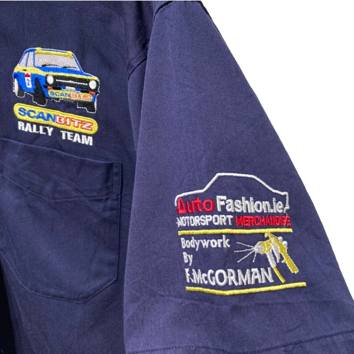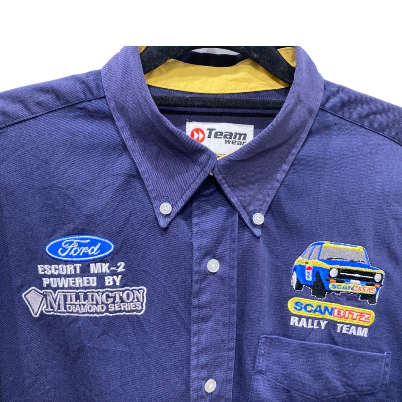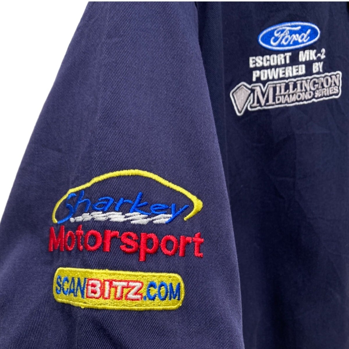 Fordの"ESCORT MK-2"表記や車両・スポンサー刺繍(SCANBITZ / Millington など)が前後と袖に入る、モータースポーツのチームシャツ寄りのデザインです。タグに"GT shirt"やStyle no. TT392、さらにケアタグの"03-2006"表記があるため2006年製の可能性が高く、00sのモータースポーツ系プロモ・ユニフォームとして作られたモデルと推定できます。サーキット/ラリーチームのピット着用を模したアイテムで、ロゴ刺繍主体の見た目が特徴です。