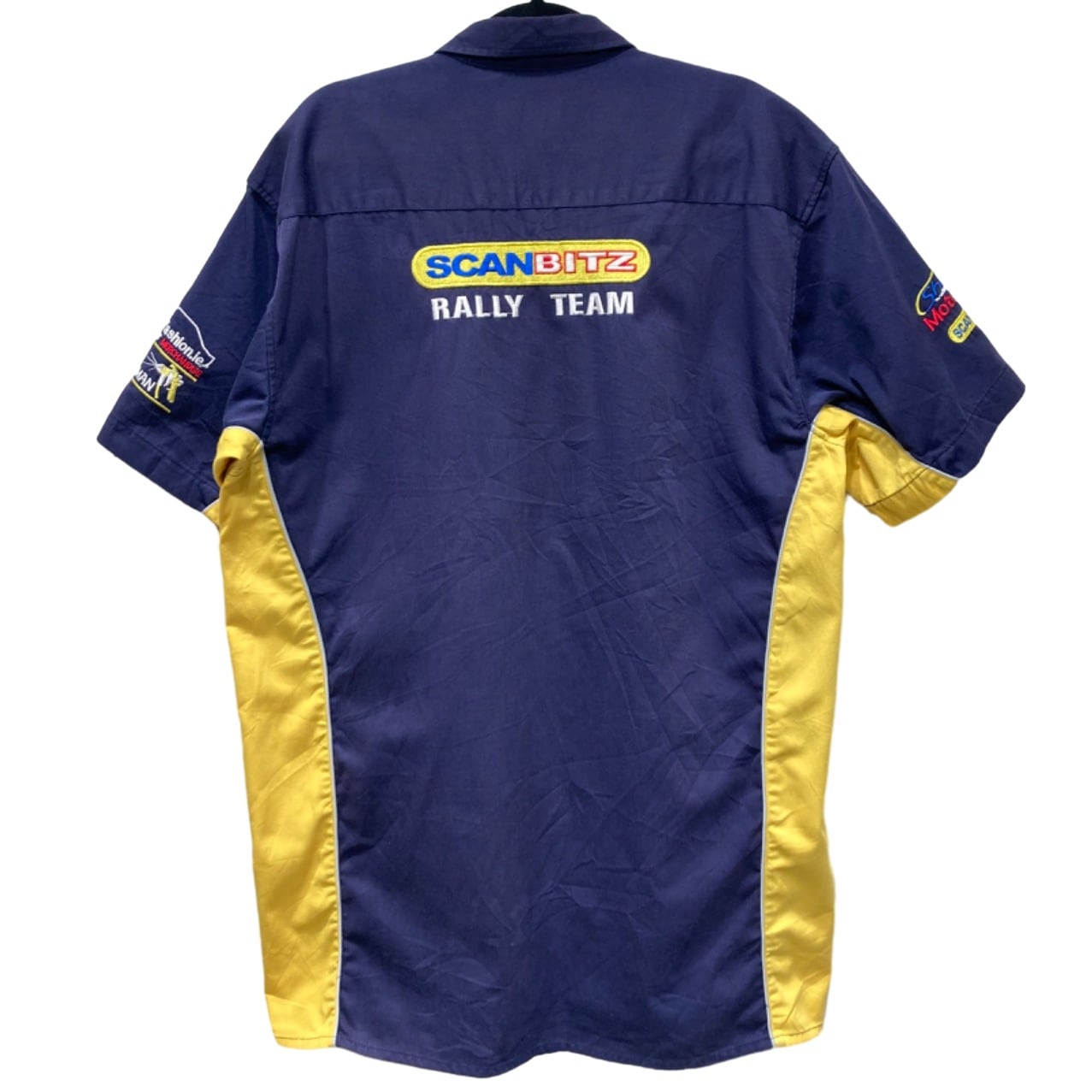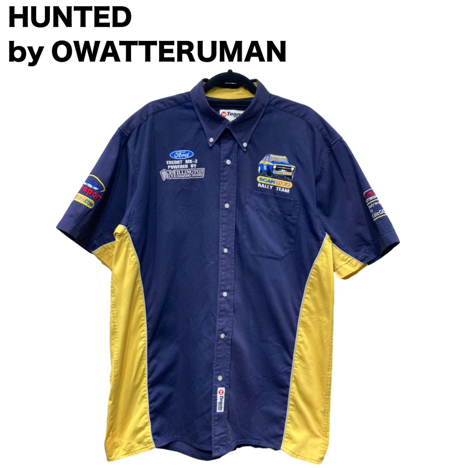 ボタンダウンカラー、胸ポケット付きの半袖ワーク/ユニフォーム型シャツ。前面・背面・袖に入る刺繍ワッペンが主役で、左右のイエロー切替がウエスト周りに軽い立体感を出しています。ポリエステル混の平織り生地で、耐久性があり皺になりやすいが着込むほど雰囲気が出るタイプ。肩幅55cm・身幅52cmとゆとりのあるサイズ感で、Tシャツの上からラフに羽織っても窮屈さが出にくい作りです。