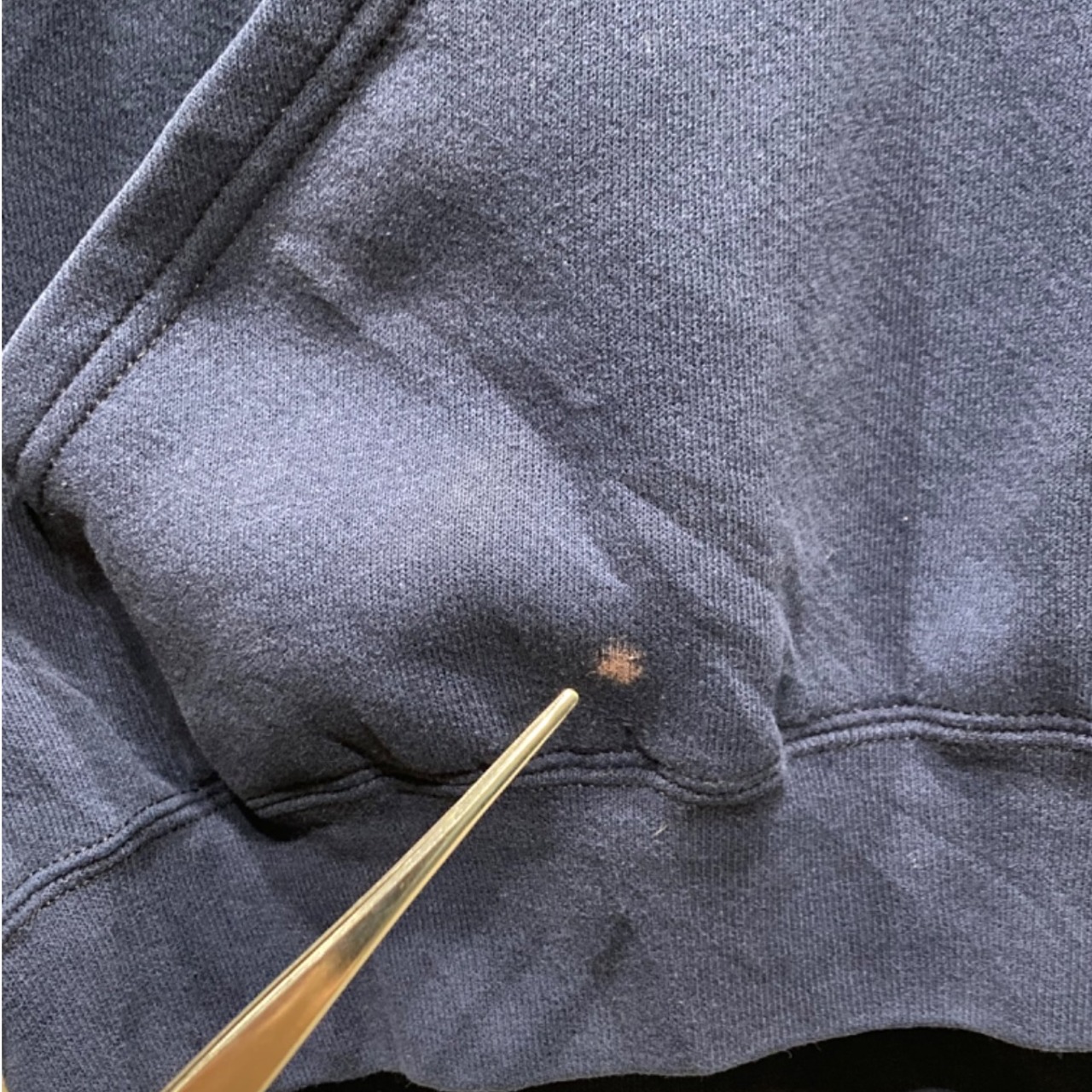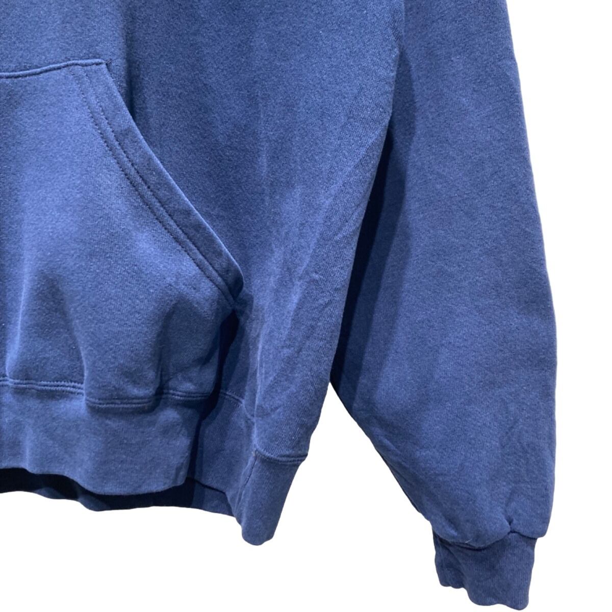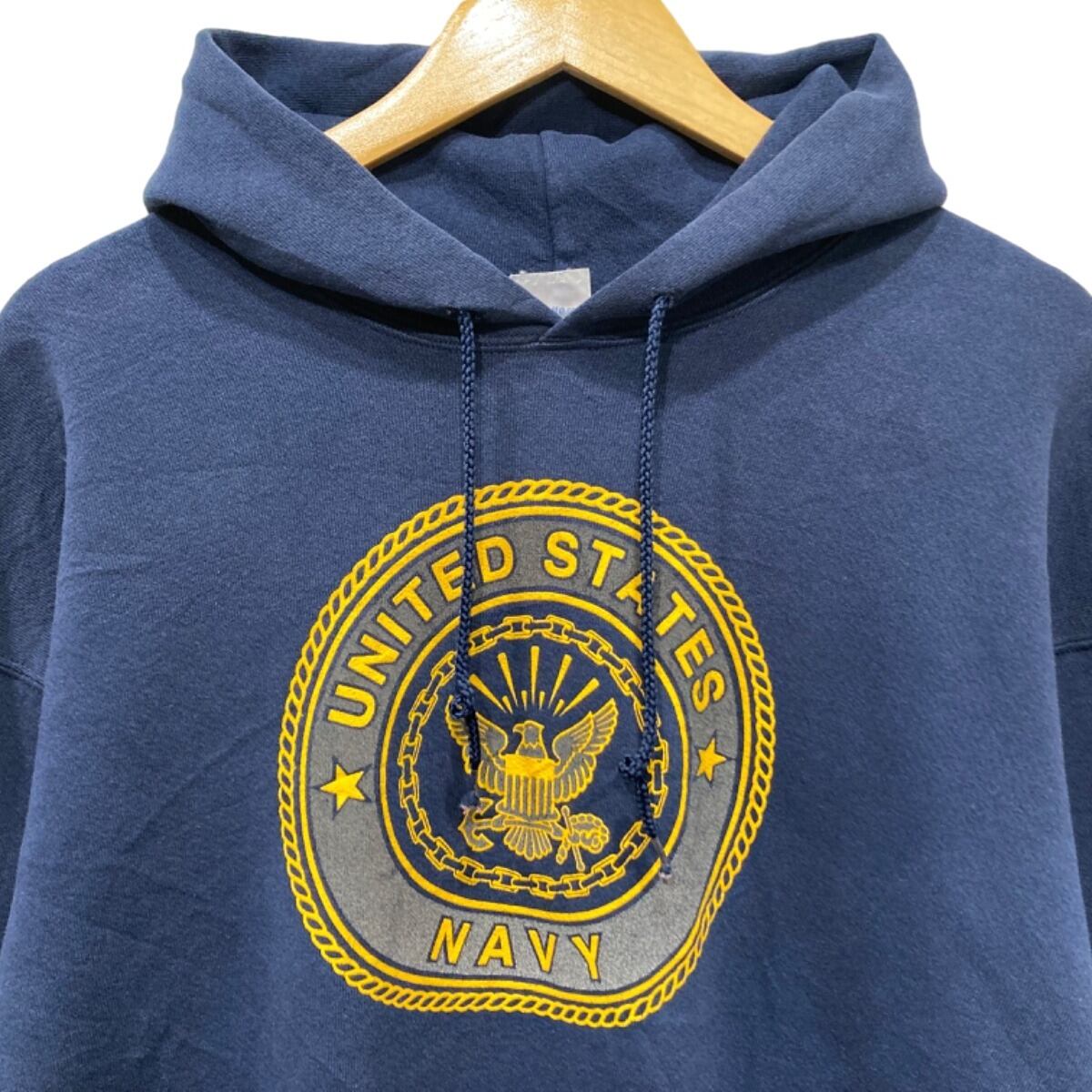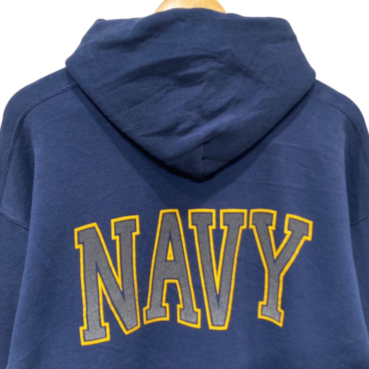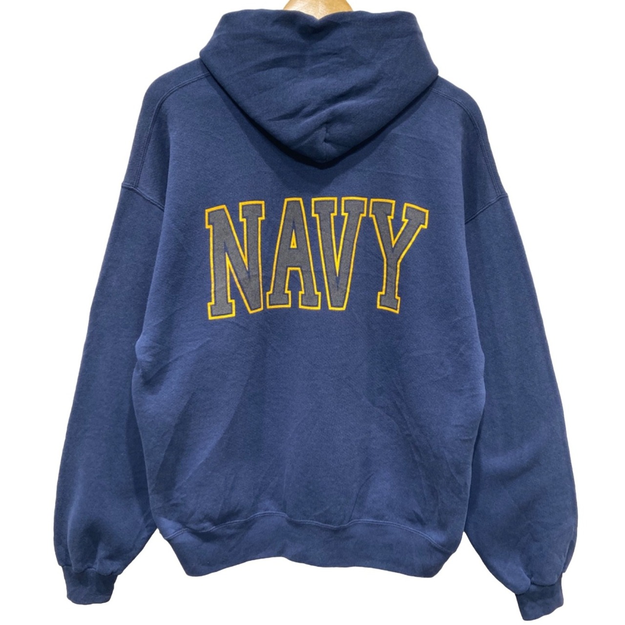 肩が落ちるドロップショルダーで身幅に余裕のあるボックス気味のシルエット。裏起毛の混紡生地で厚手すぎない中肉のボディ感、着込まれたフェードによるムラ感が雰囲気を出しています。フロントは円形のシールドプリント、バックは大きな"NAVY"文字で後ろ姿に存在感が出る構成。フロントポケット付近に小さな穴(または色抜けのような箇所)と、ドローコードのほつれが見られるなど使用感あり。それ以外はリブの伸びも大きくなく、プリントは概ね残っている状態です。