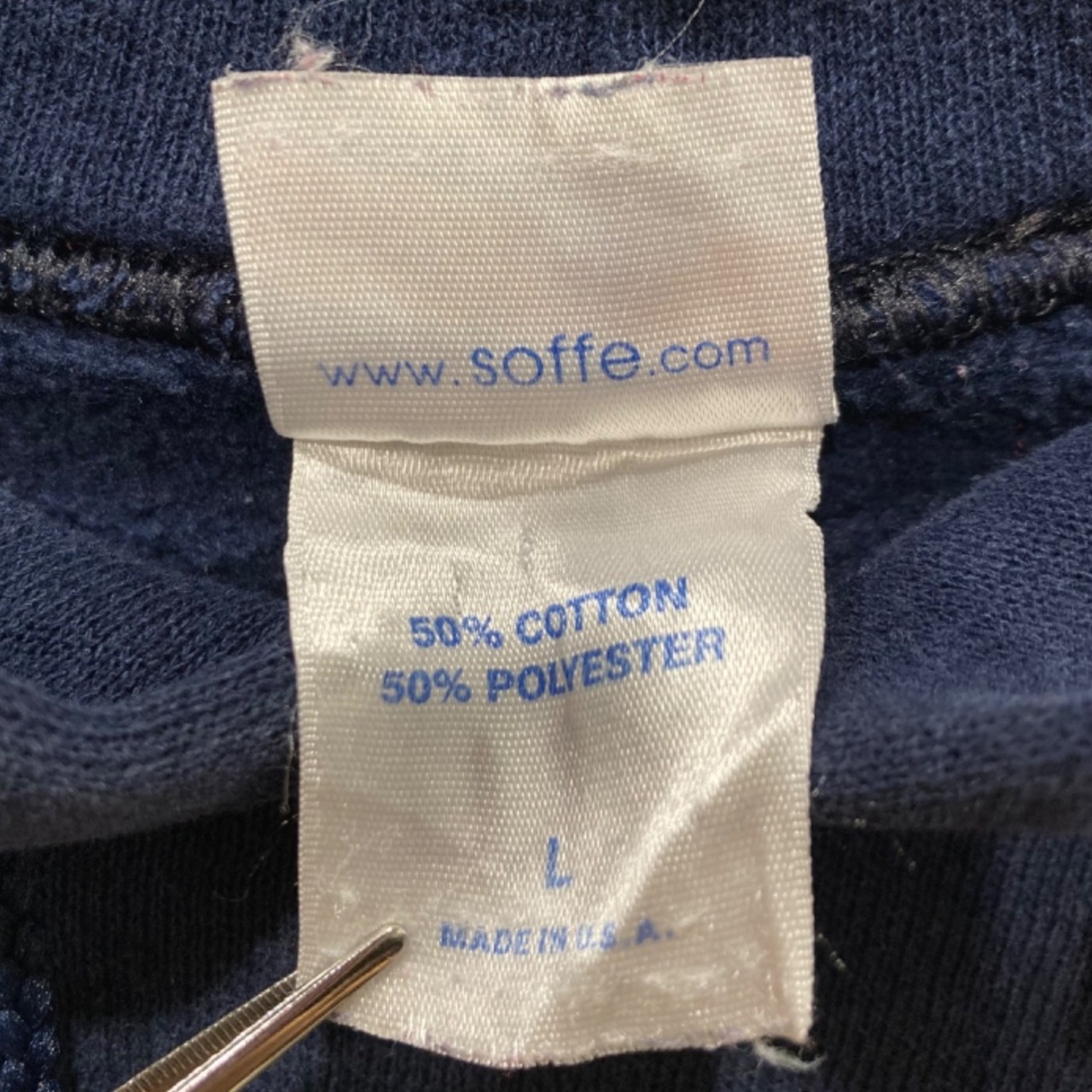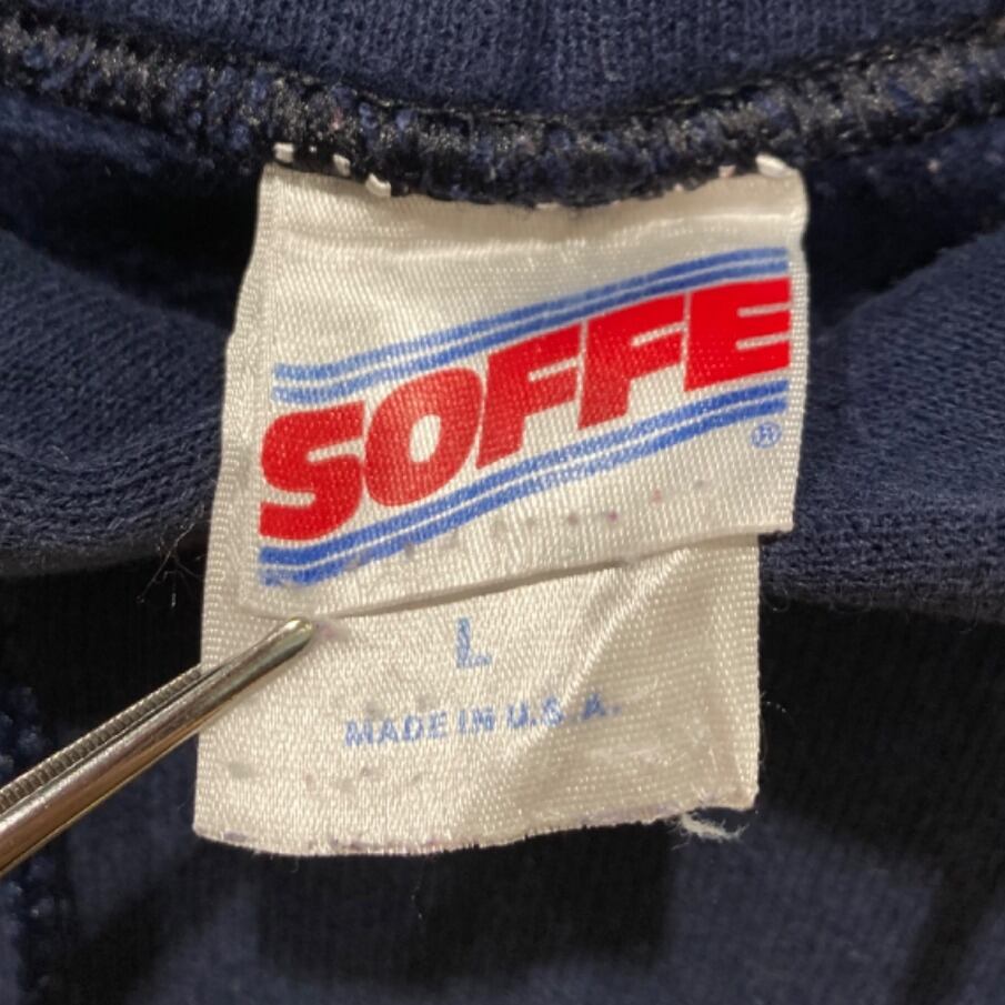 米軍・軍モチーフのプリントを配したパーカーは、アメリカのスクール/ミリタリーカルチャーとストリートが交差する定番アイテム。今回の個体は首元のSOFFEタグに「MADE IN U.S.A.」「50% COTTON 50% POLYESTER」の表記があり、タグのロゴデザインや混紡素材の仕様から90s〜2000s初期のアメリカ生産期の流れを引く個体と推定。この手のNAVYプリントはフロントにシールド、バックに大判のカレッジロゴという定番レイアウトで、ミリタリー由来ながら普段着で使いやすい見た目が特徴。