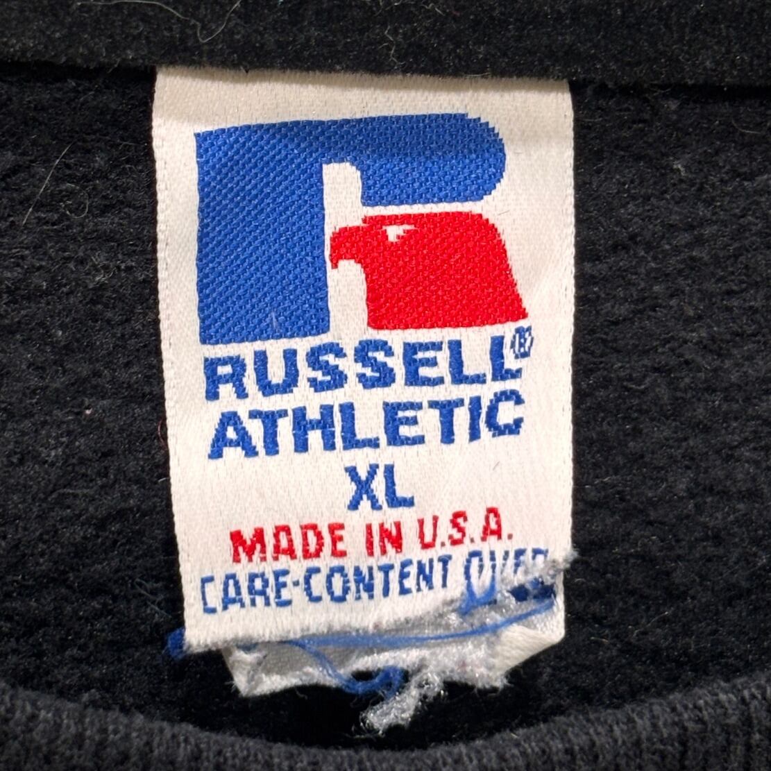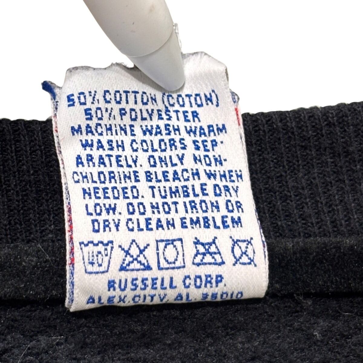 本品は首元タグに大きなRロゴと"MADE IN U.S.A."表記、ケアタグにAlex City, ALのRussell Corp表記、素材表記が50%COTTON/50%POLYESTERであることから、90s頃のRussell Athletic製と推定しています。
