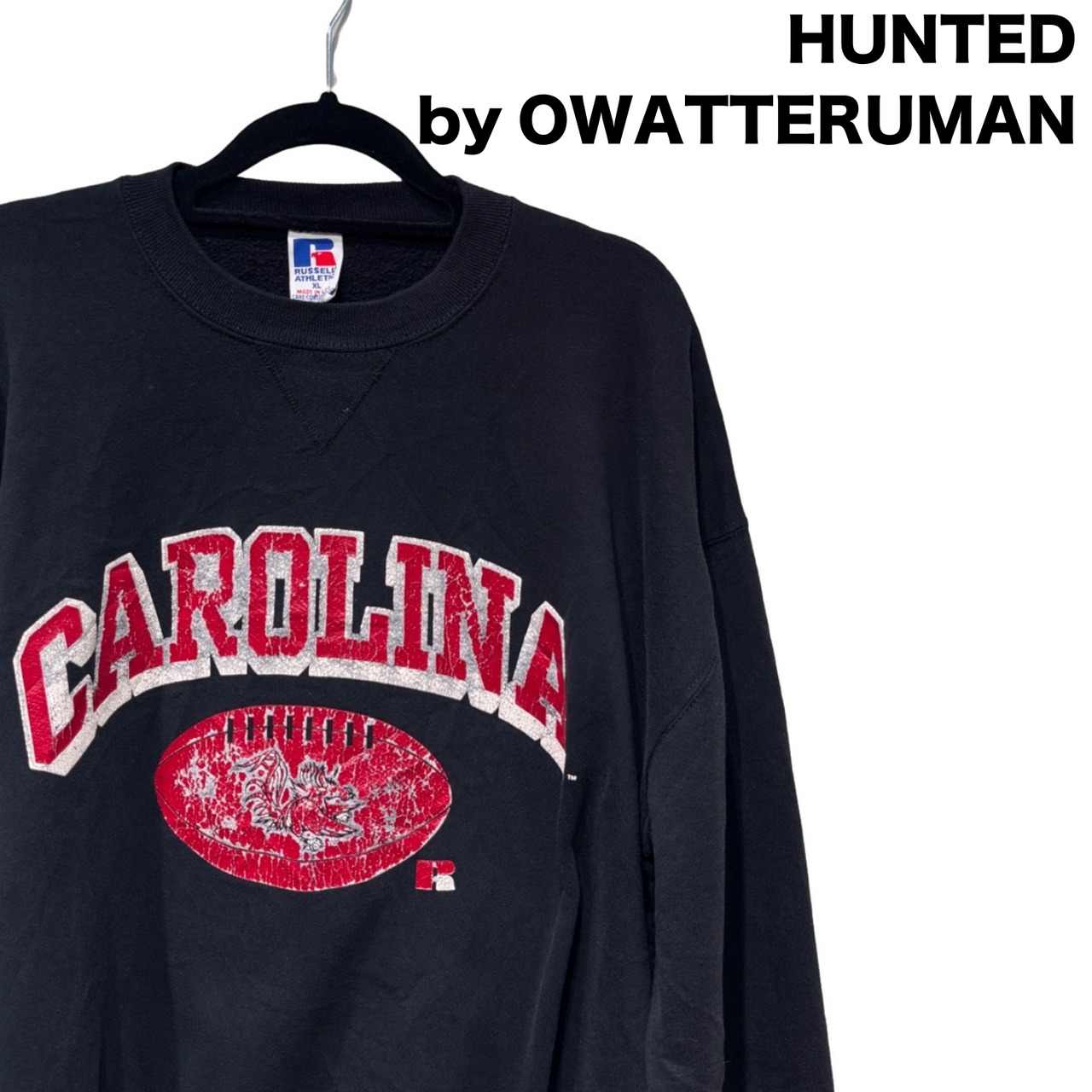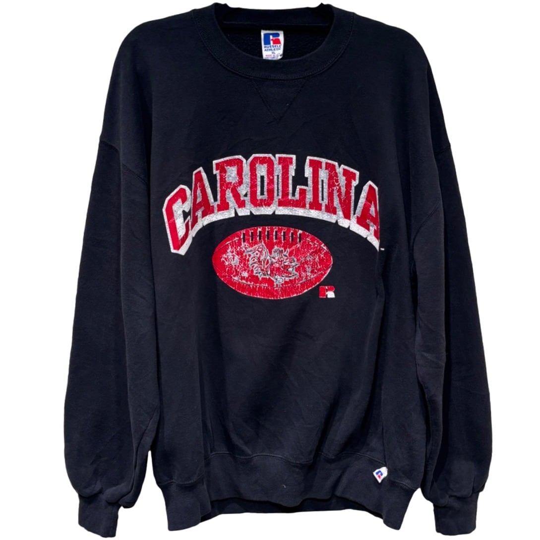 フロントの大きな"CAROLINA"アーチロゴとフットボールモチーフは、カレッジ系の定番グラフィックで、経年によるひび割れ(クラック)が入って古着らしい表情になっています。