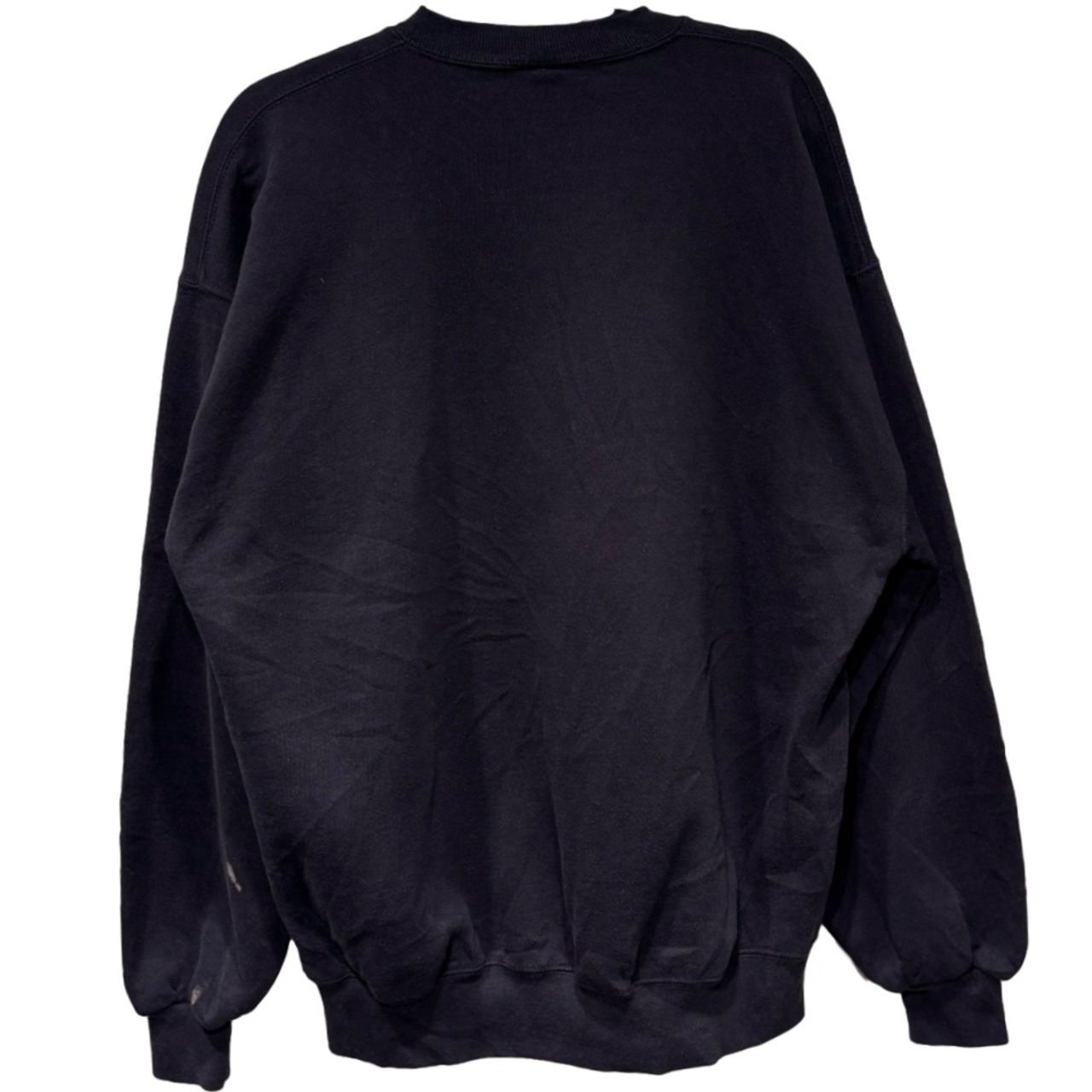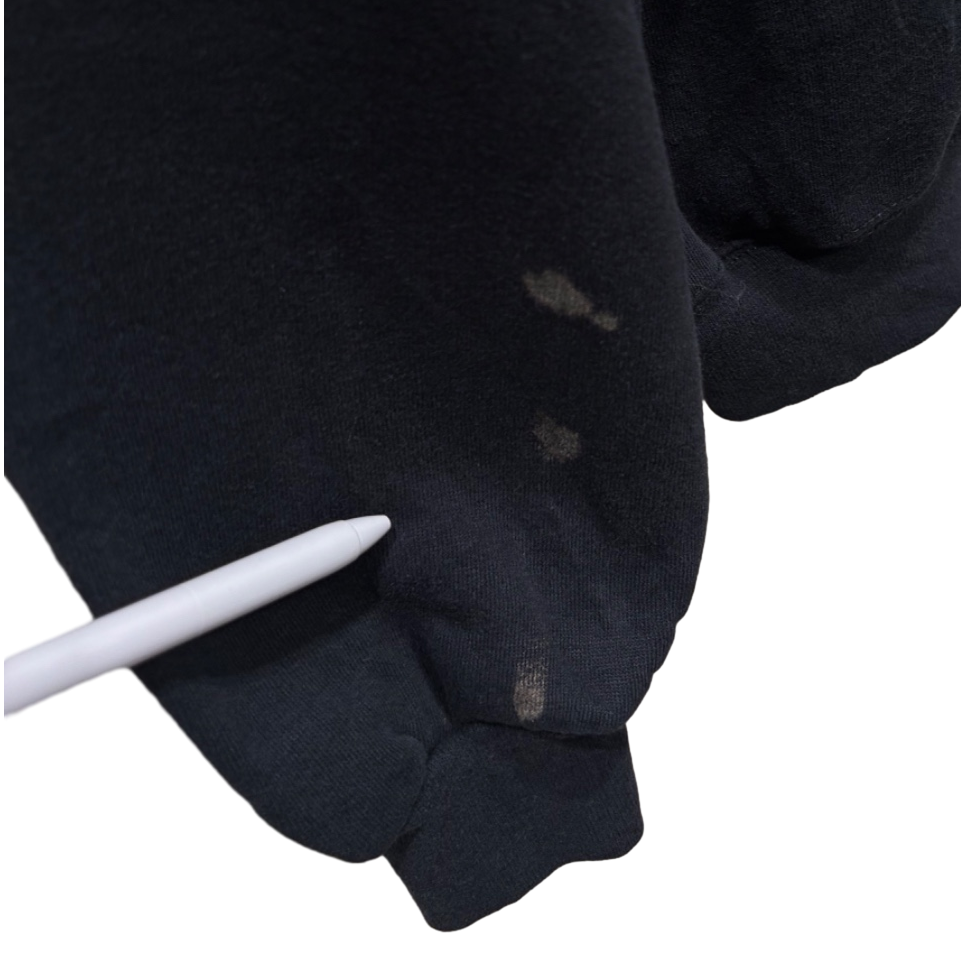 フロントのカレッジプリントは経年でクラックが広がり、着古した味が出ている一方、袖に数カ所薄い点状の変色(画像参照)とタグ周りのほつれが見られます。全体的にはゆったりめのシルエットでレイヤードに合わせやすい一枚。