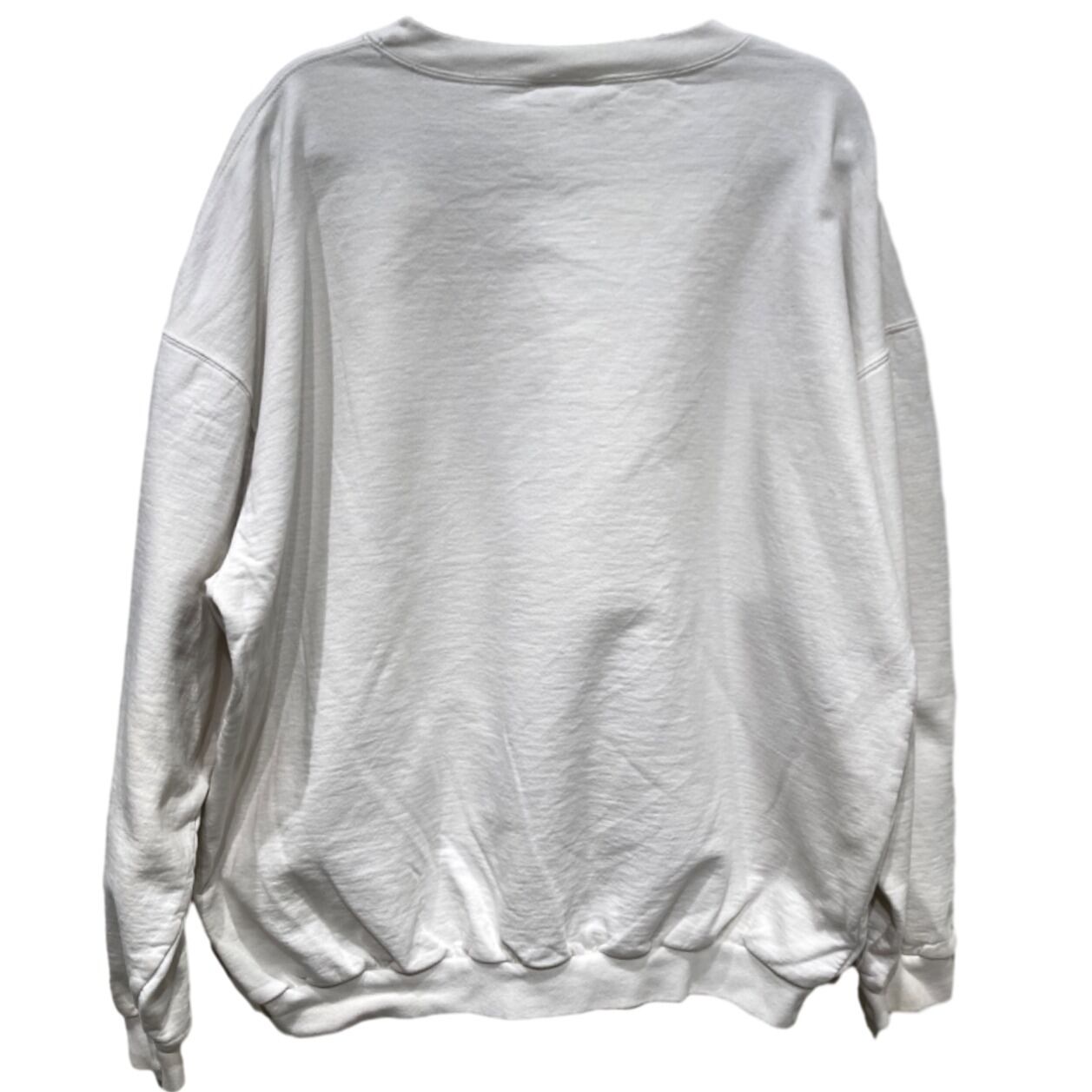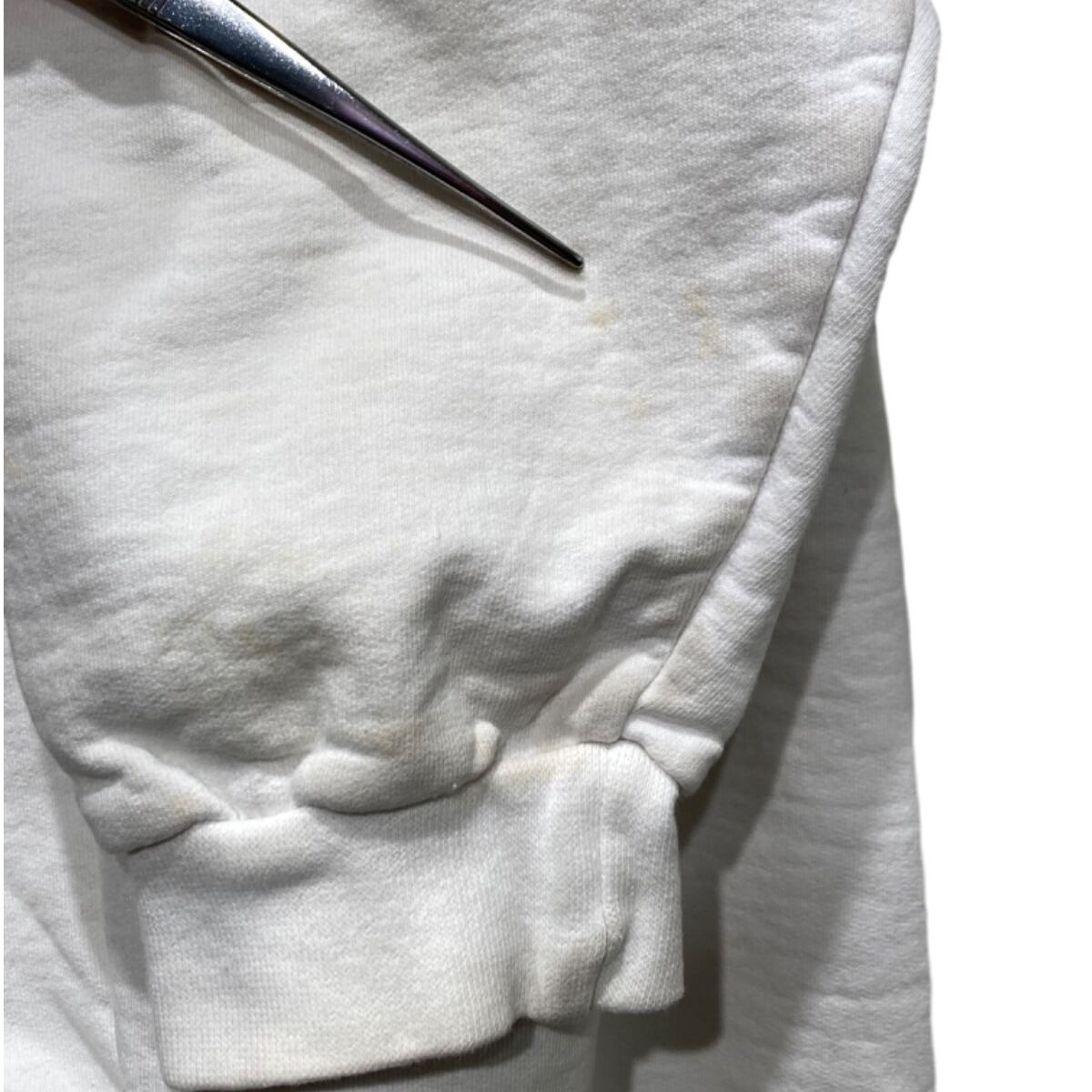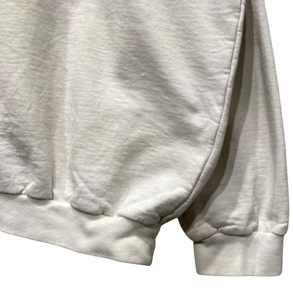 ドロップショルダー寄りの大きめシルエットで、身幅・肩幅にゆとりがありレイヤード向きの作り。生地は中肉のループバック風で、表面は柔らかく着馴染みが出てくるタイプ。胸元の灯台プリントは淡い色味でアート寄りの表現、主張が強すぎずコーデに落とし込みやすい。画像で確認できる通り、プリント周辺と袖に薄い黄ばみ汚れが複数あり、全体に使用感(毛羽立ちややあり)が見られるため、コンディションを了承のうえカジュアル使い・洗いやリメイクでの活用がおすすめ。