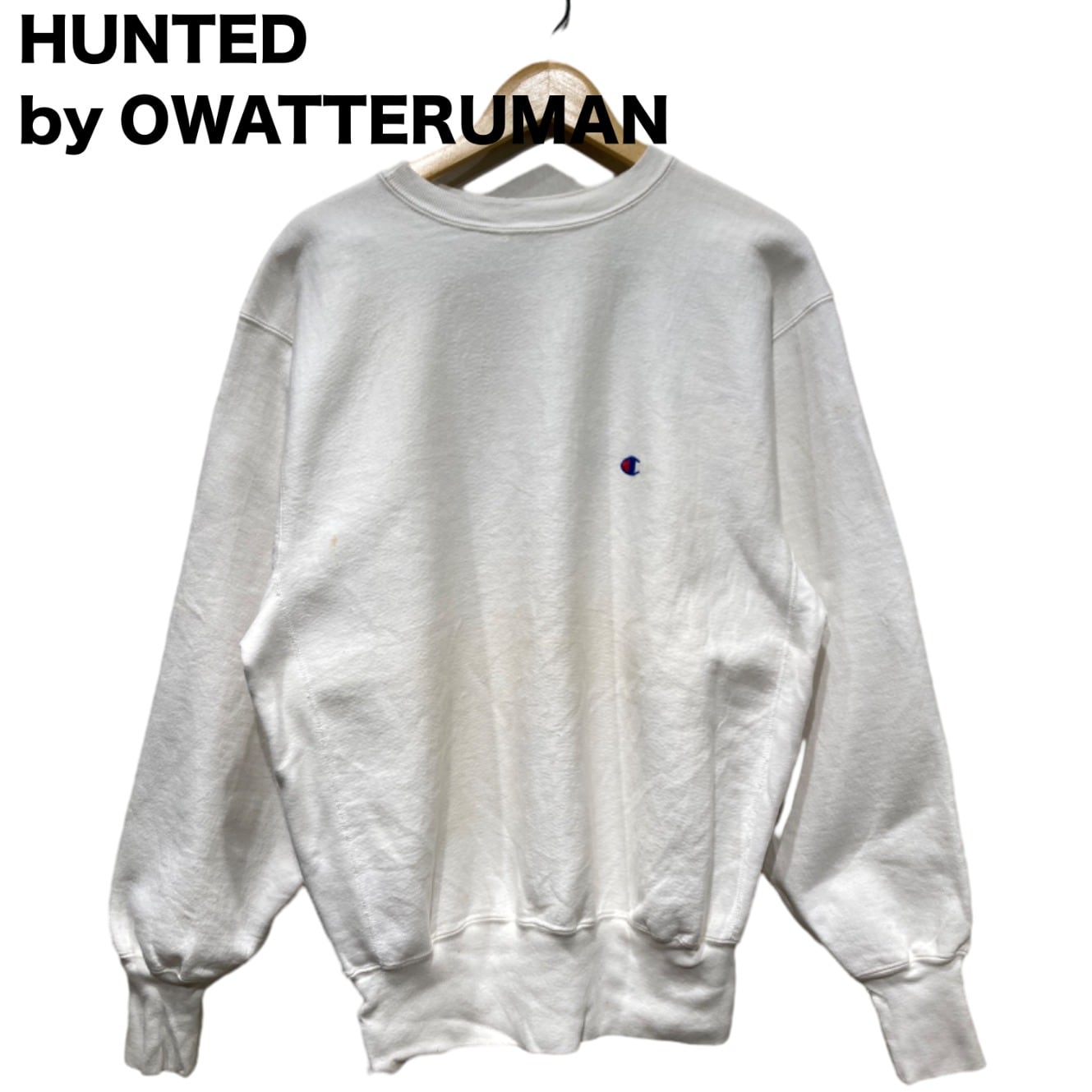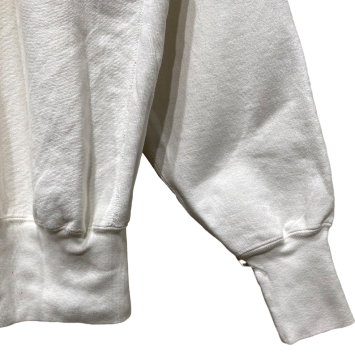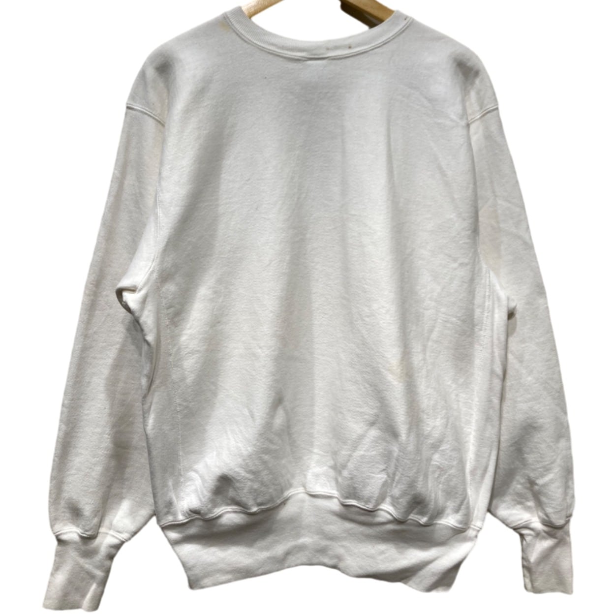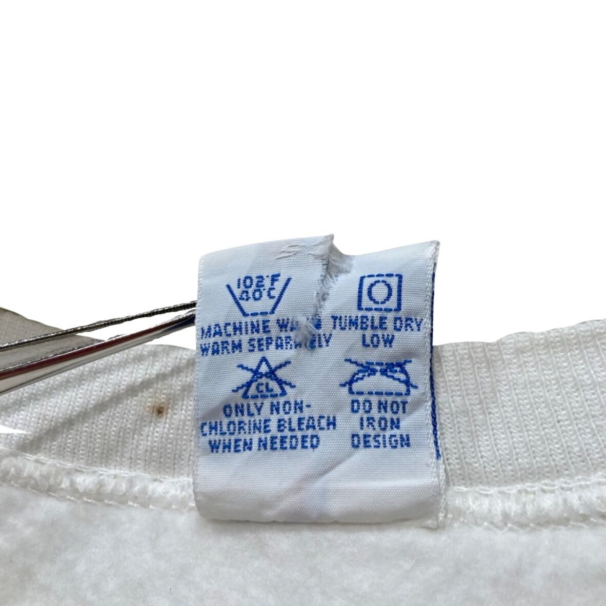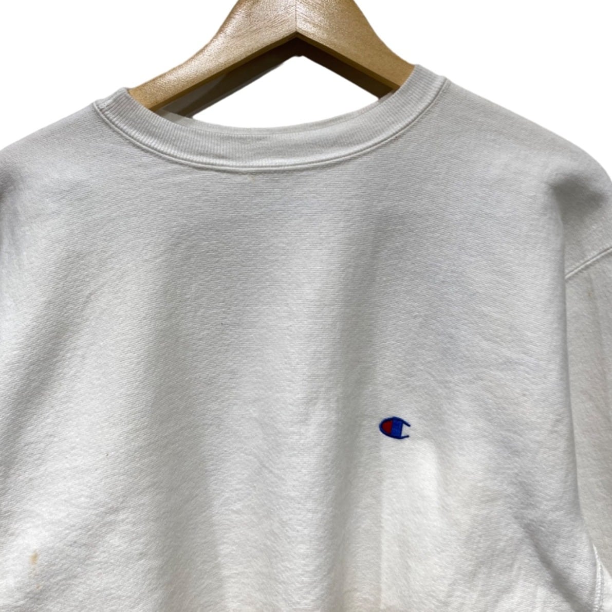 Championの『Reverse Weave』は、競技用・トレーニングウェアからストリートの定番へと移行したモデル。今回の個体はタグに「REVERSE WEAVE」「MADE IN U.S.A.」「X-LARGE」と表記があり、裏起毛の生地感や首元タグのデザイン(赤いREVERSE WEAVE表記+青いChampionロゴ)が90sの生産期に多く見られる仕様であることから、90s推定としています。胸の小さなC刺繍はチャンピオンの象徴で、主張しすぎないワンポイントとして古着でも人気のディテールです。