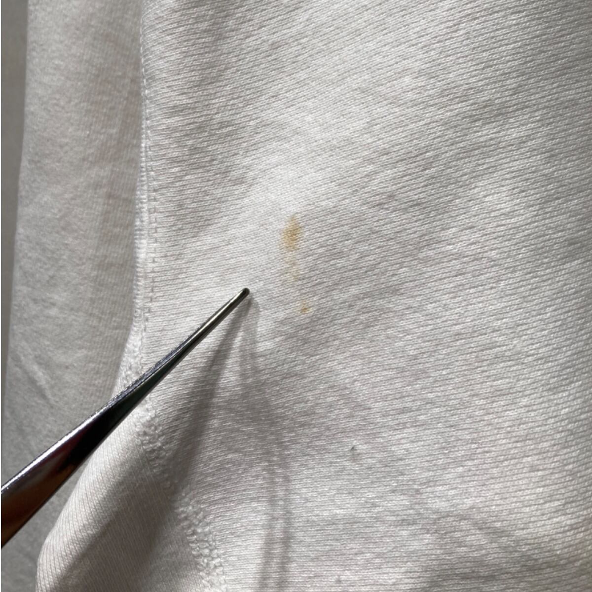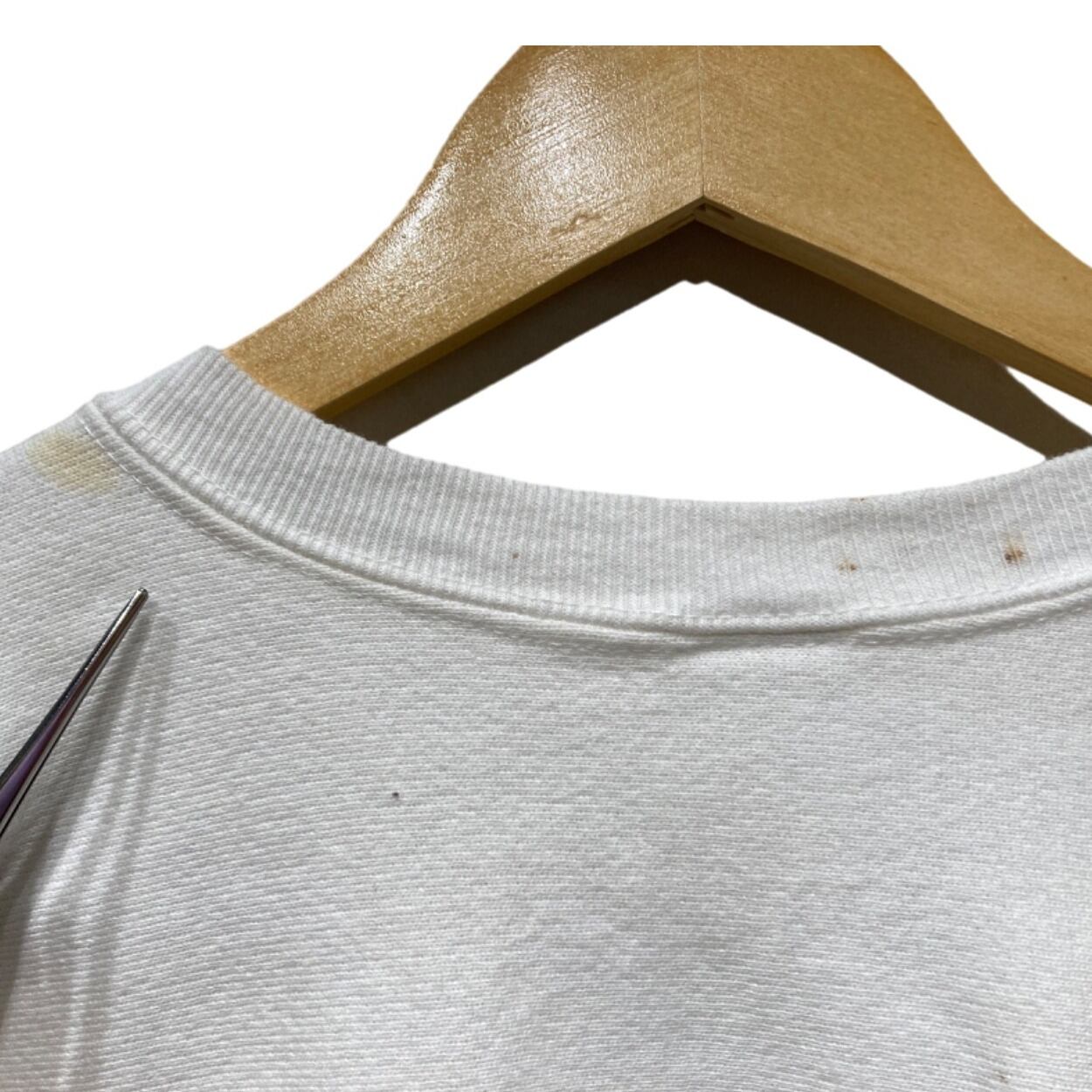ドロップショルダー寄りのゆったりめシルエットで、身幅にゆとりがありつつ裾リブで腰回りが収まる作り。裏起毛の厚手ボディで保温性があり、首リブや袖リブにテンションの残る状態なので着用時にズレにくい印象。胸のワンポイントC刺繍は小さく効いていて、無地中心のコーデに差し込みやすいデザイン。目立つダメージはないが、前面腰あたりと襟元に小さな茶系のシミ(写真参照)が複数あり、古着慣れした方向けのコンディションとなる。