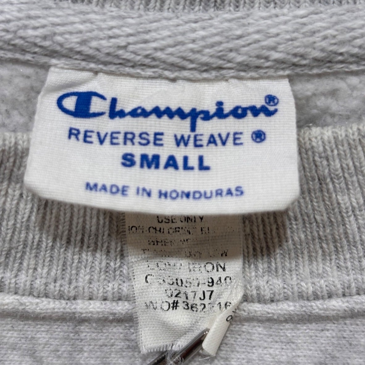 本品はネックの白地タグに青のスクリプトロゴと「REVERSE WEAVE」「MADE IN HONDURAS」が記載されており、このタグ仕様と生産国表記から2000年代頃の流通個体と推定しています。