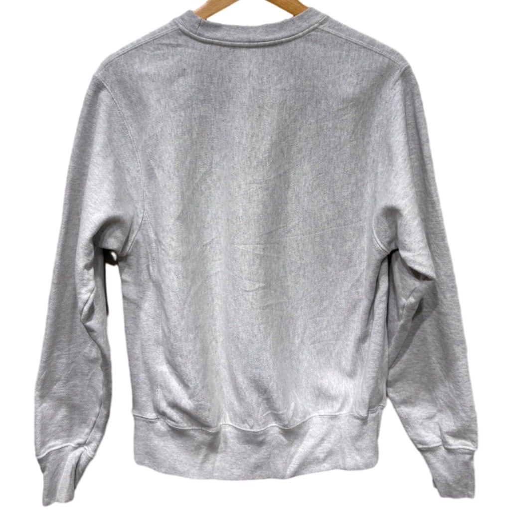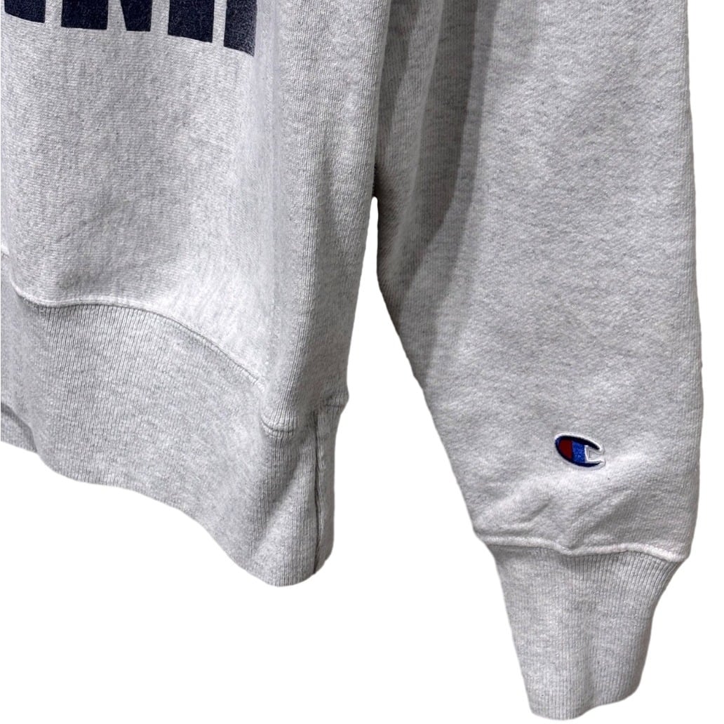 フロントのネイビーアーチロゴはフェルトもしくはフロッキー系の起毛感があり、カレッジものらしい存在感を出してくれる一枚。袖口のChampion「C」刺繍がさりげないアクセントになっています。
