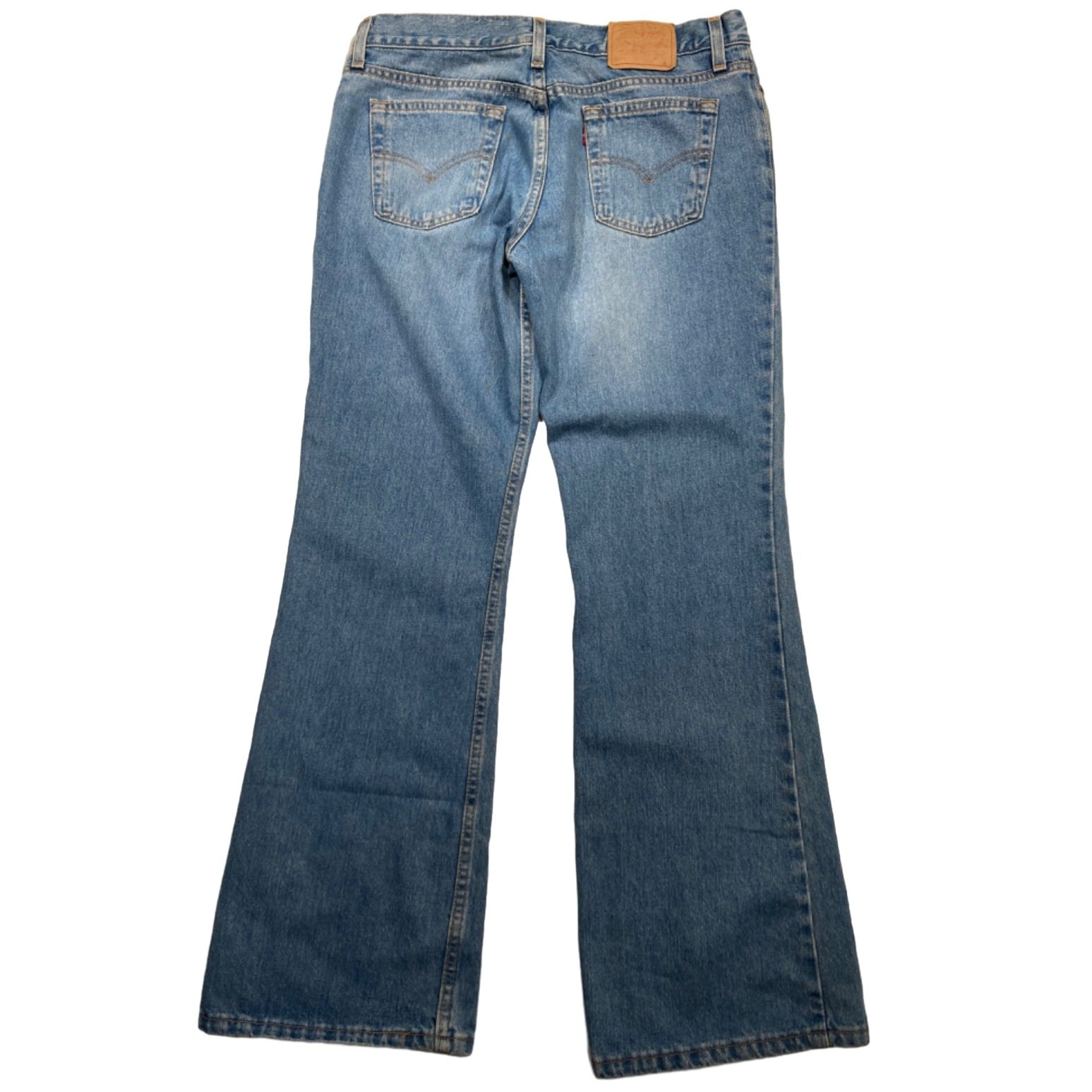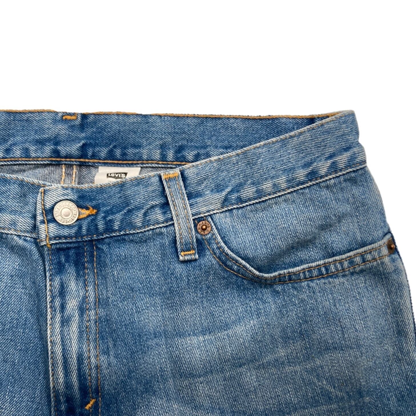 股上が24cmと浅めに設定されたスーパーロウ仕様で、腰位置が低めの着用感を作る作り。裾幅26cmとしっかり広がるフレアシルエットで、下半身にボリュームを出した90sライクなバランス。生地は綿100%のしっかりしたデニムで、膝下からの自然な色落ちとユーズド感が出ています。フロントはブラスジッパー(LEVI'S刻印)+刻印ボタン、バックにはレザーパッチと赤タブが備わり、ディテールはオーセンティック。股下79cmと長めなので、シューズや裾のアレンジで見え方を変えやすい一本です。