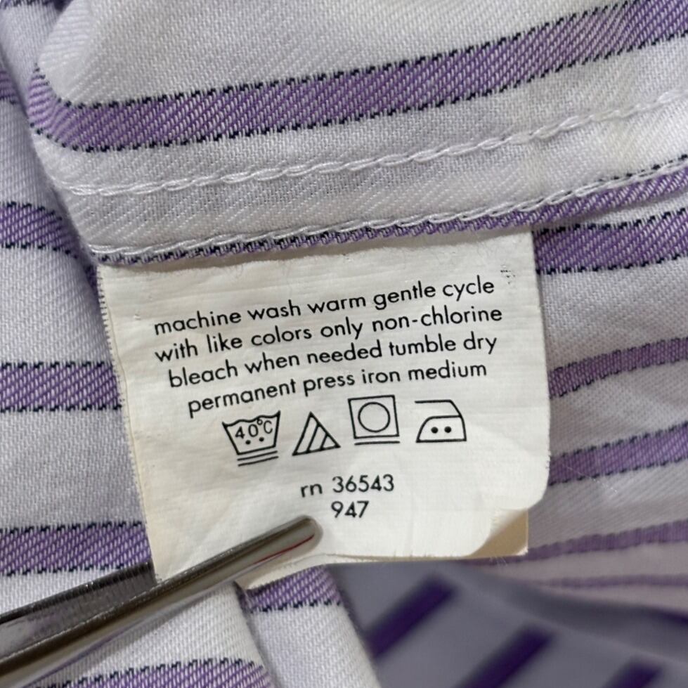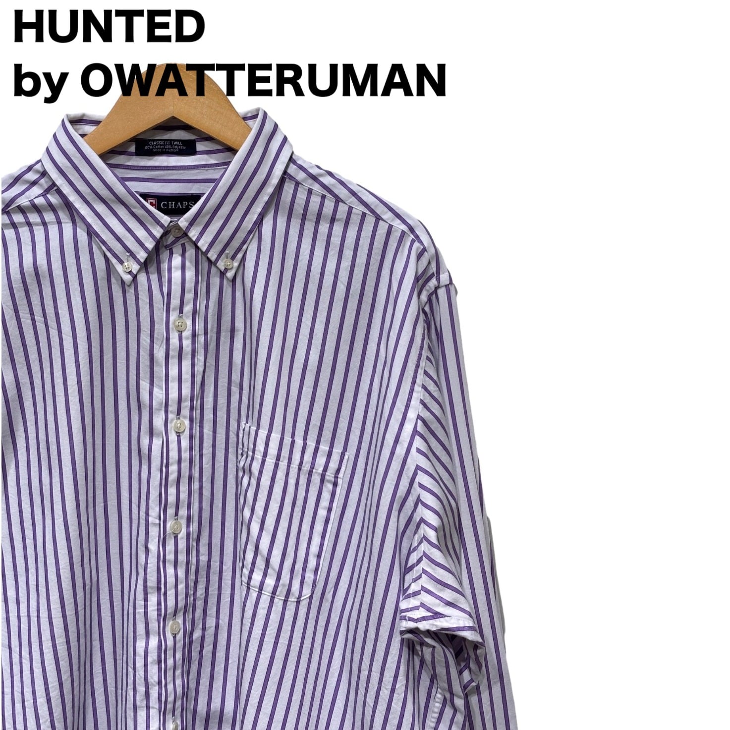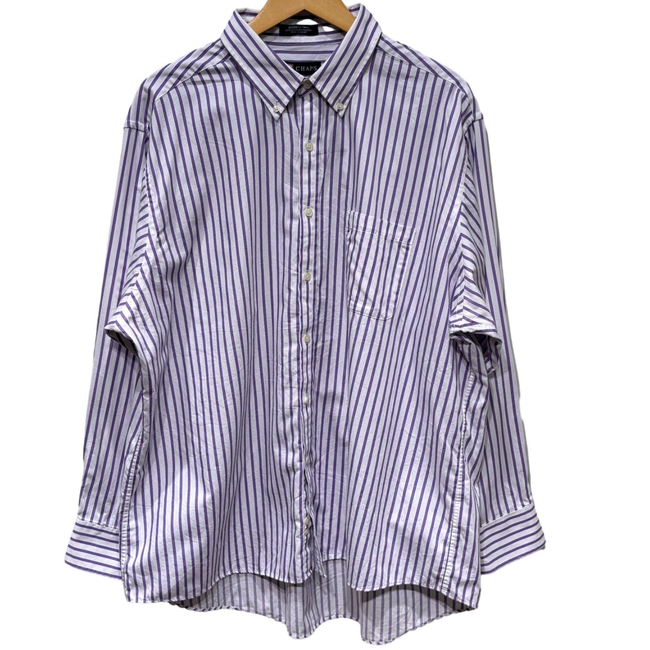 ボタンダウンのレギュラードレスシャツは、元々はスポーツシャツ由来のカジュアルなドレスウェアとして発展してきたアイテムです。この個体はタグに「CLASSIC FIT TWILL」「WRINKLE FREE」「60% Cotton 40% Polyester」「Made in Vietnam」と記載されており、量産期の定番仕様であることが読み取れます。これらの仕様と縫製の作りから、2000年代以降の流通品、つまり00s〜の推定が妥当です。ブランドはCHAPS、マス向けのクリーンなドレスシャツとして日常使いに落とし込みやすい作りです。