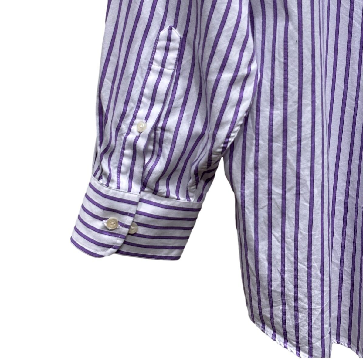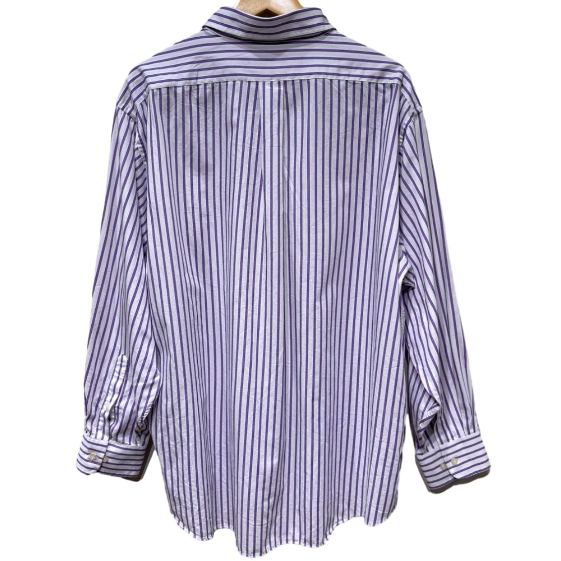 ゆったりめのレギュラーフィットで、肩幅54cm・身幅62cmと余裕のあるシルエット。ボタンダウンカラーと胸ポケット付きの王道ディテールで、裾はラウンドカット(カーブヘム)なのでタックイン・アウトどちらでも使える汎用性。ツイル織りの60/40混紡生地で適度なハリがあり、タグのWRINKLE FREE表記通りシワになりにくい加工が施されている点も日常使いで扱いやすいポイント。袖はカフスにツーボタン仕様、ガセットやボタン配置から見ると量産期の安定した縫製です。視認できる範囲では目立つ汚れや穴はなく、着用感は軽め〜中肉の印象です。