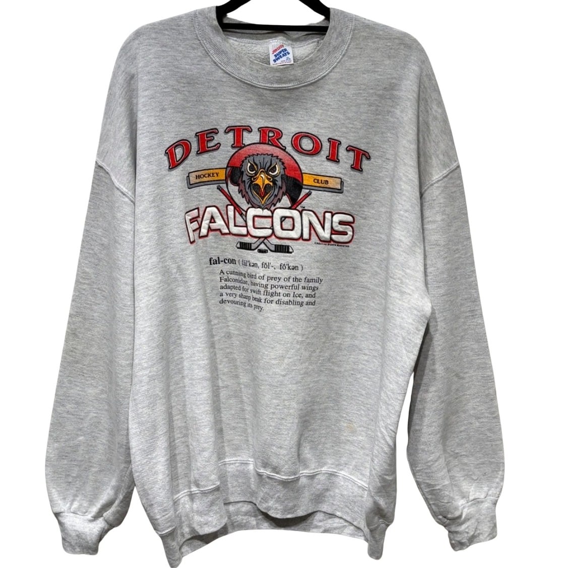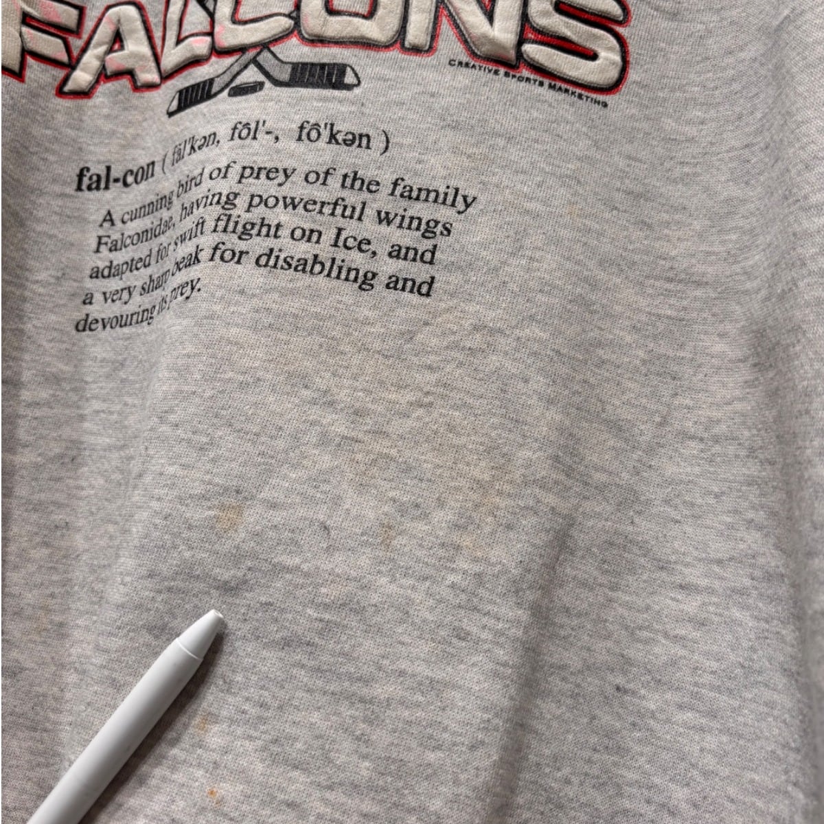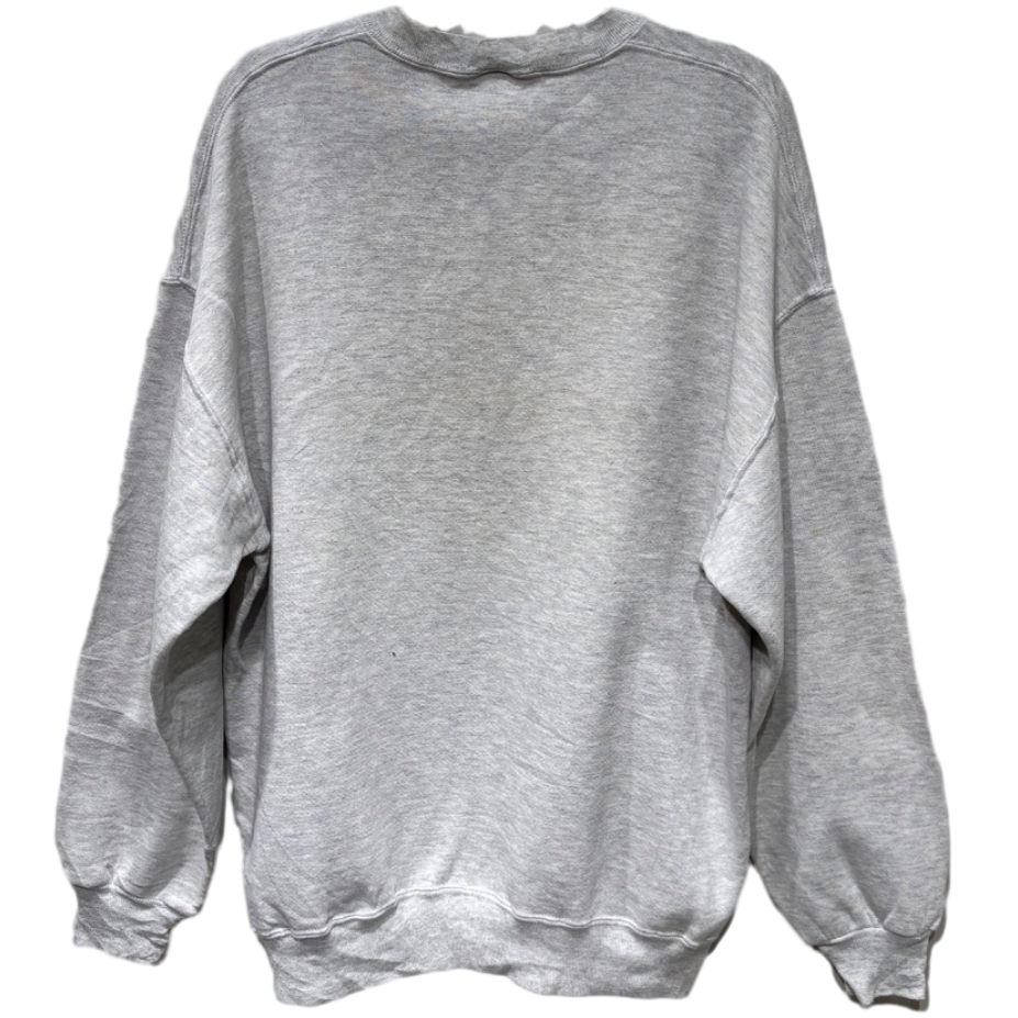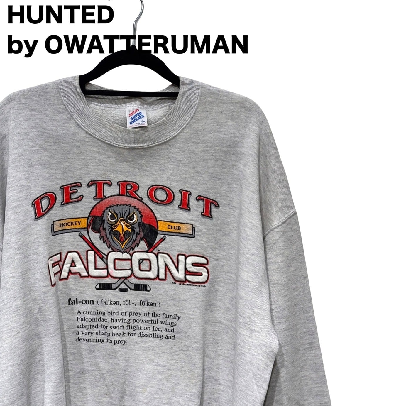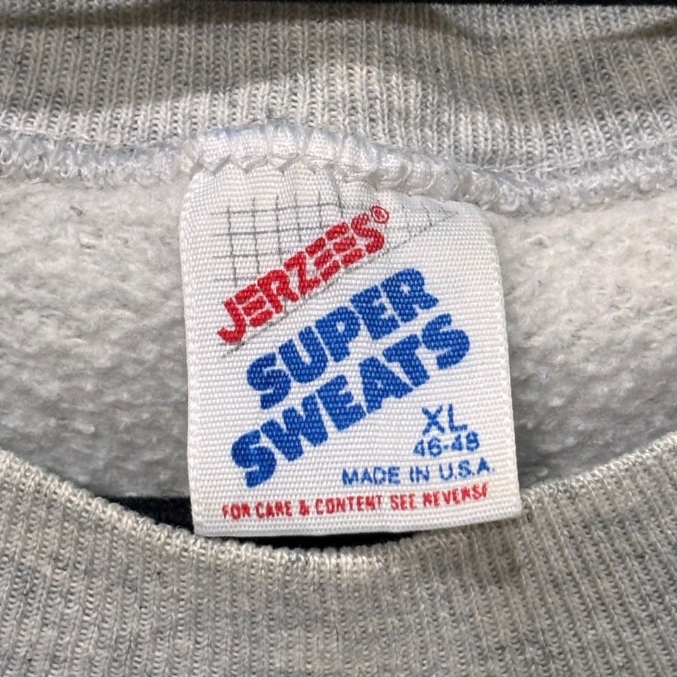 フロントの鷹のヘッドとクロスしたホッケースティック、左右に入る“Hockey Club”のバナーから、スポーツチーム向けのプロモーショナルなデザインであることが読み取れます。首元タグはJerzeesの「SUPER SWEATS」、ケアタグにはRussell Corp/Alexander City表記、素材が50% cotton / 50% polyesterと記載されていることから、アメリカ国内生産の量産スウェットを用いたチーム系アイテムで、タグ仕様や素材感から推定で90s製と判断しています。プリント下に入る小さなクレジット(CREATIVE SPORTS MARKETING)も、当時のスポーツマーケティング向けアイテムである根拠になります。