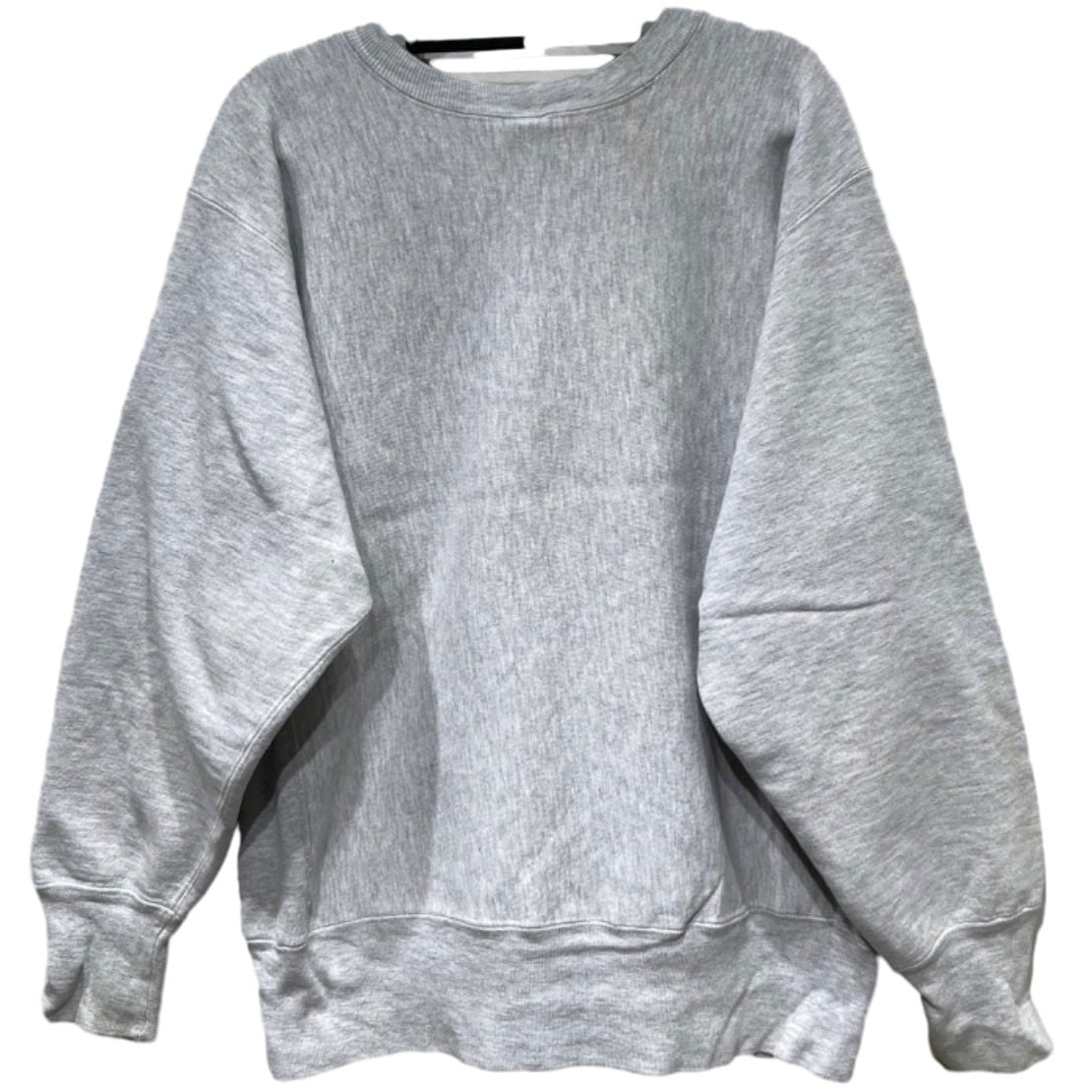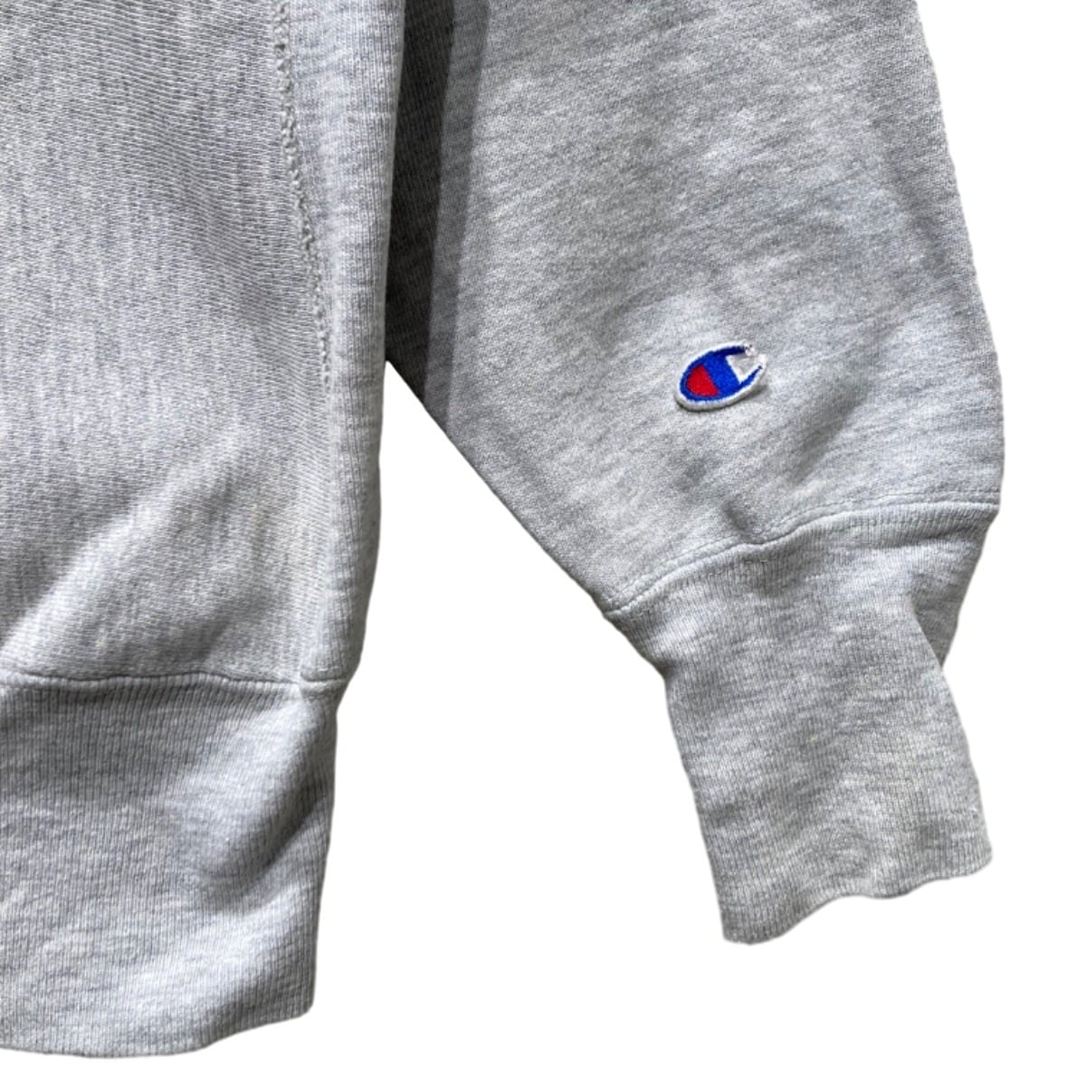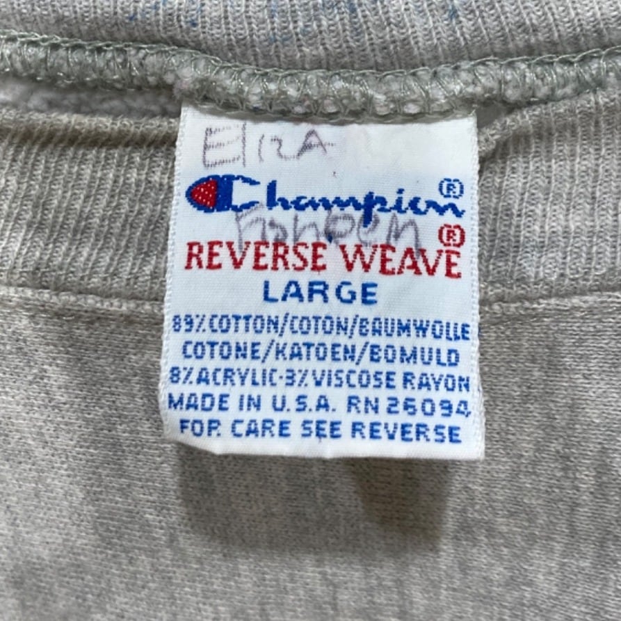Championの『REVERSE WEAVE』はカレッジウェアとして広く流通した定番仕様で、アーチ状のチェニール(フェルト/パッチ)ロゴは大学名やスクール系アイテムでよく見られるディテール。この個体はタグに『REVERSE WEAVE』『MADE IN U.S.A.』と素材表記(89% COTTON / 8% ACRYLIC / 3% VISCOSE)が残っており、袖の小さなCロゴ刺繍も確認できるため、オリジナルのChampionリバースウィーブ製品であることが読み取れる。タグの仕様や素材表記から推定年代は90sと記載するが、年代判断はタグ情報に基づく推定である点はご留意ください。