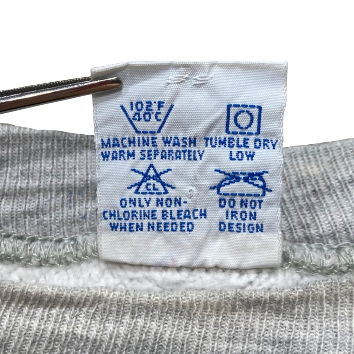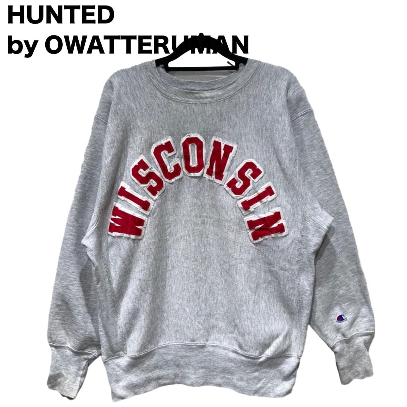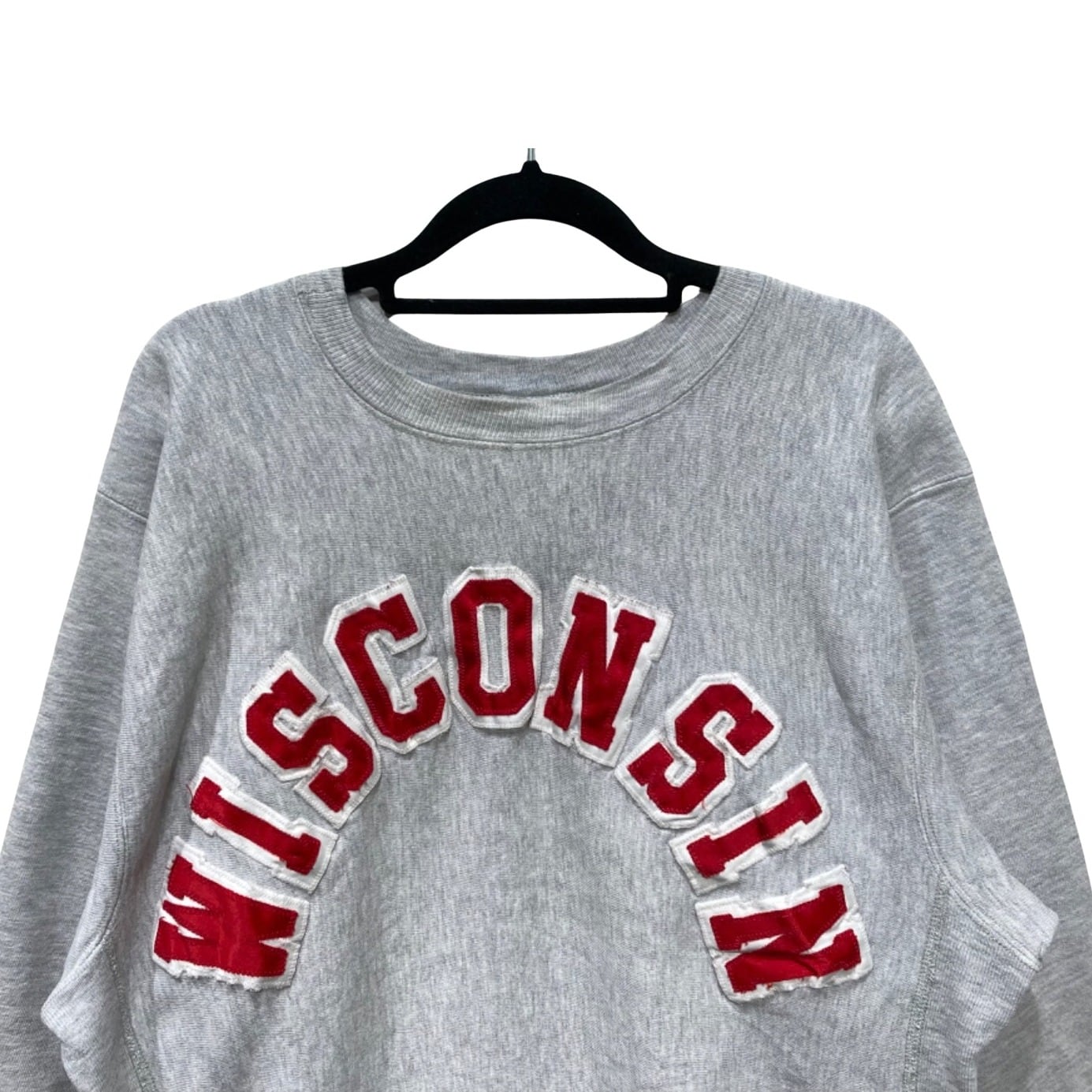 Championの『REVERSE WEAVE』はカレッジウェアとして広く流通した定番仕様で、アーチ状のチェニール(フェルト/パッチ)ロゴは大学名やスクール系アイテムでよく見られるディテール。この個体はタグに『REVERSE WEAVE』『MADE IN U.S.A.』と素材表記(89% COTTON / 8% ACRYLIC / 3% VISCOSE)が残っており、袖の小さなCロゴ刺繍も確認できるため、オリジナルのChampionリバースウィーブ製品であることが読み取れる。タグの仕様や素材表記から推定年代は90sと記載するが、年代判断はタグ情報に基づく推定である点はご留意ください。
