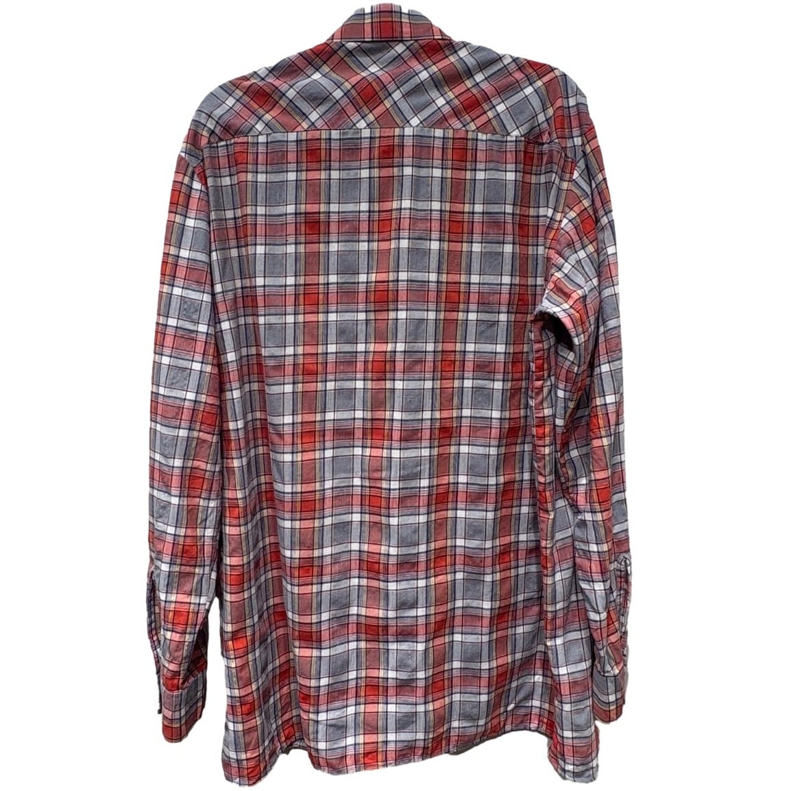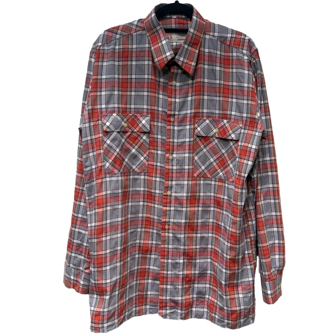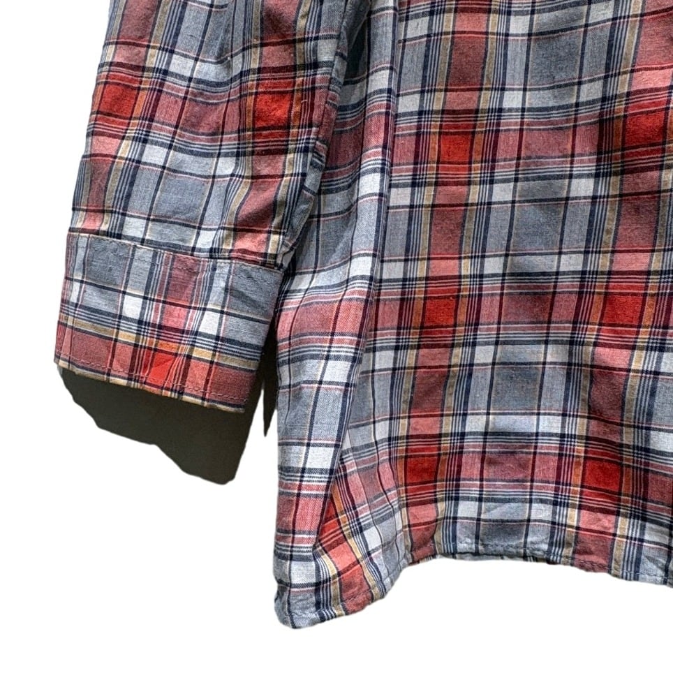 胸ポケットにフラップ付き、後身頃に切り替えのある定番的なワーク/ユーティリティ寄りのチェックシャツ。タグの表記にSIGHISOARA ROMANIAとあること、縫製仕様やディテールから東欧生産期に流通した個体と考えられる。推定年代は90sだが、タグ表記と仕様からの推定に留まるため断定はできない。