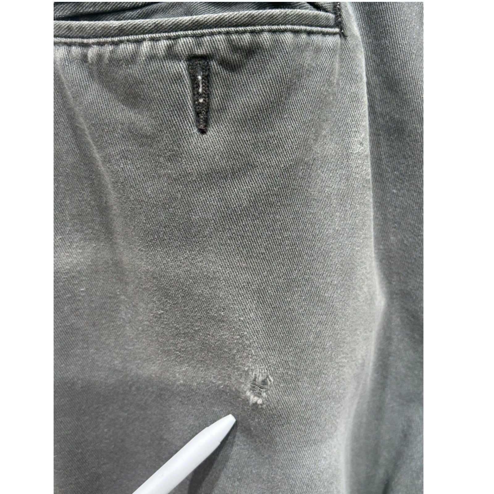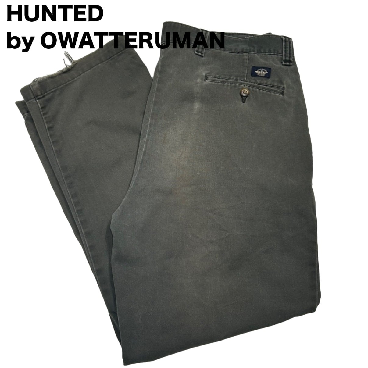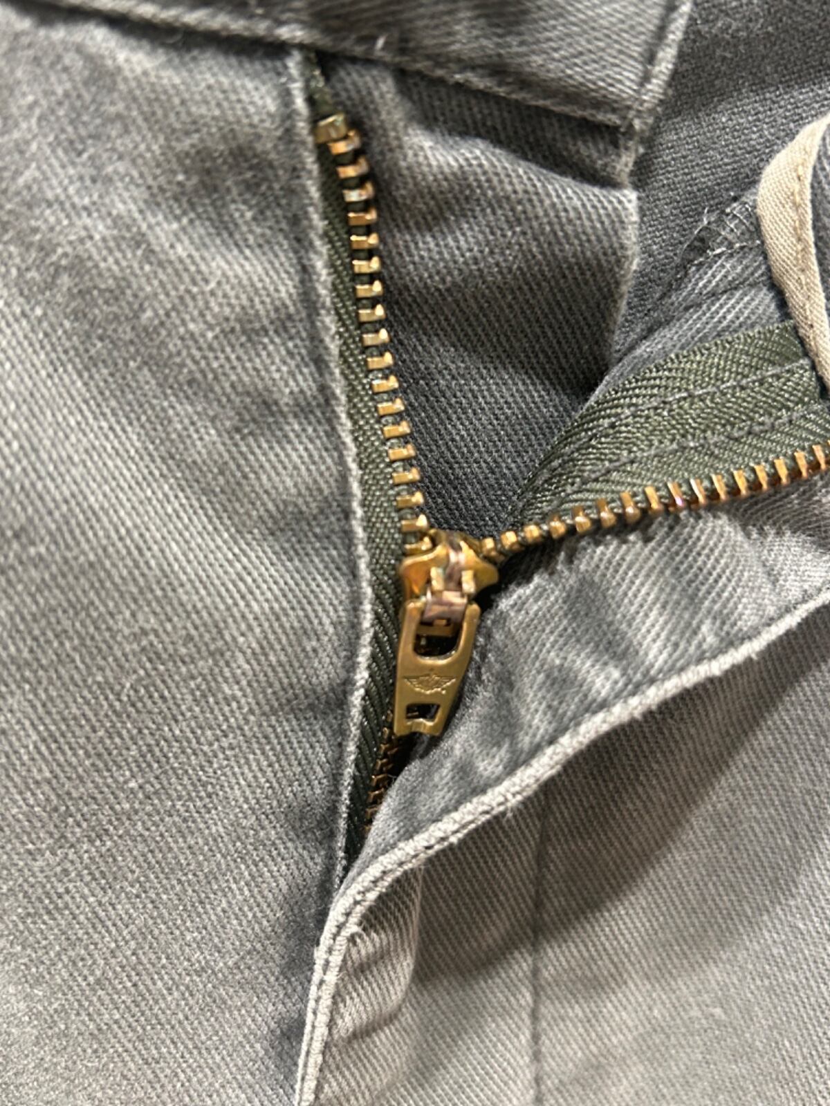 生地は中厚のコットンツイルで、全体に色あせと洗いの風合い、右腿付近に小さなダメージ、裾にほつれが見られるためユーズドの風合い強め。