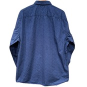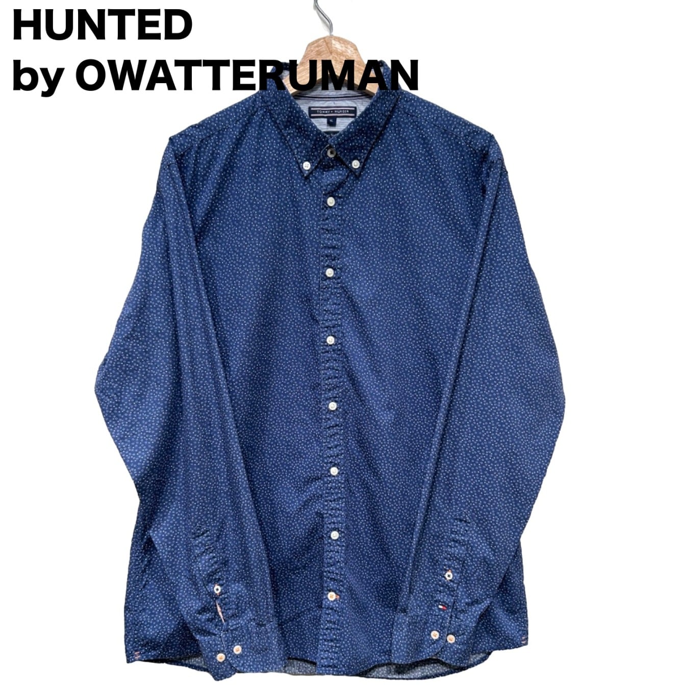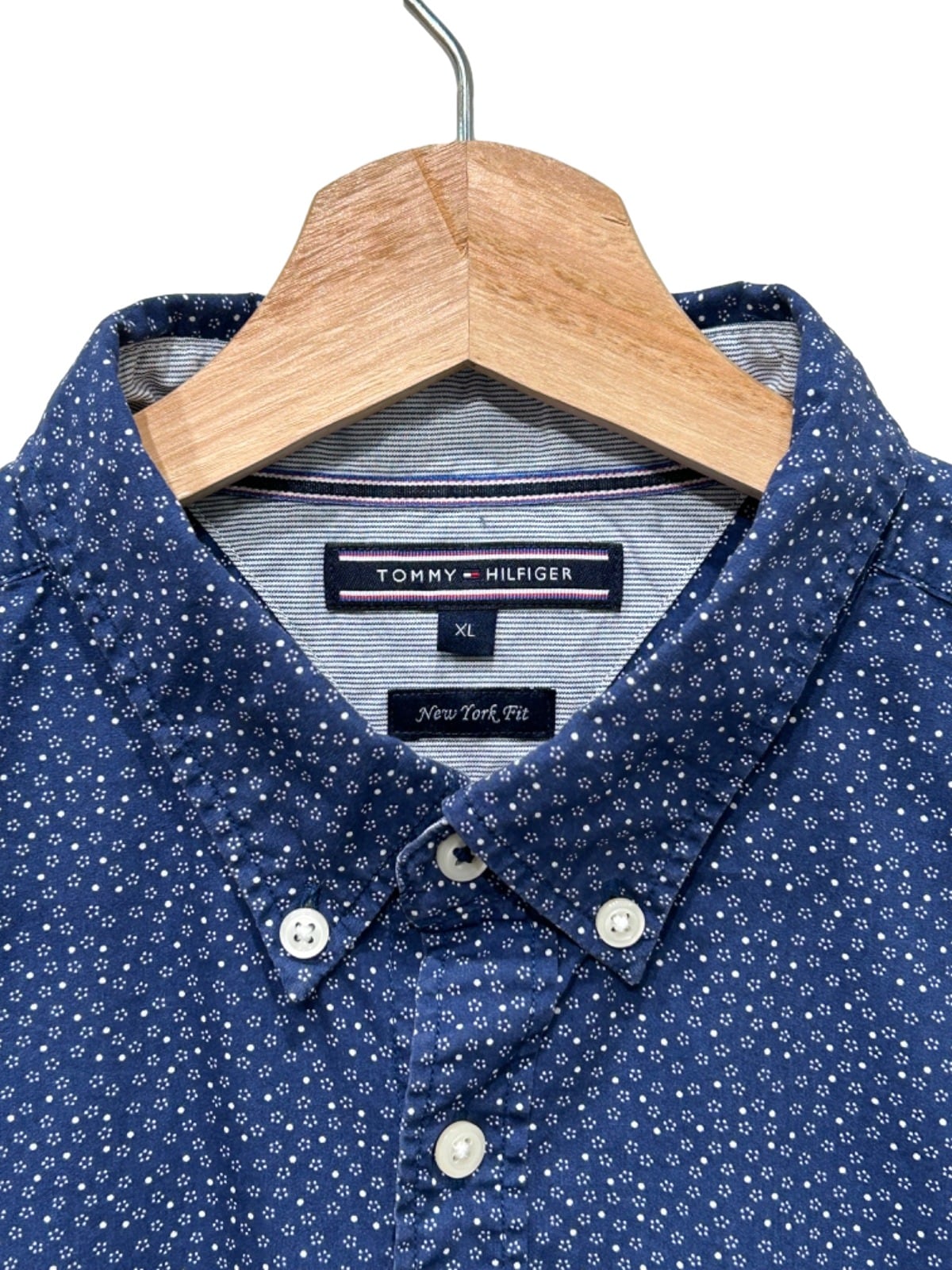 本品はネイビー地に小さな白い小花ドットが全面に入るデザインで、襟裏にストライプの見返し、襟ラベルに“TOMMY HILFIGER”の紺地織ネームと下段に“New York Fit”の表記がある点から、ブランドの比較的近年のライン(00s頃)と推定されます。袖口の小さなフラッグ刺繍など、トミーらしい小物的なブランド表現が散りばめられた一着です。
