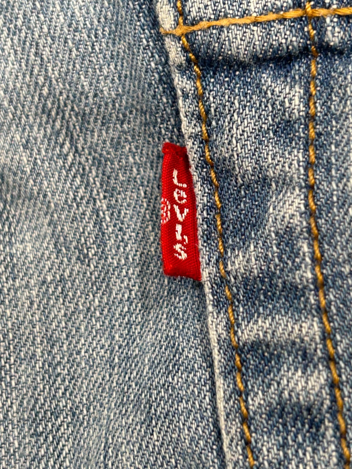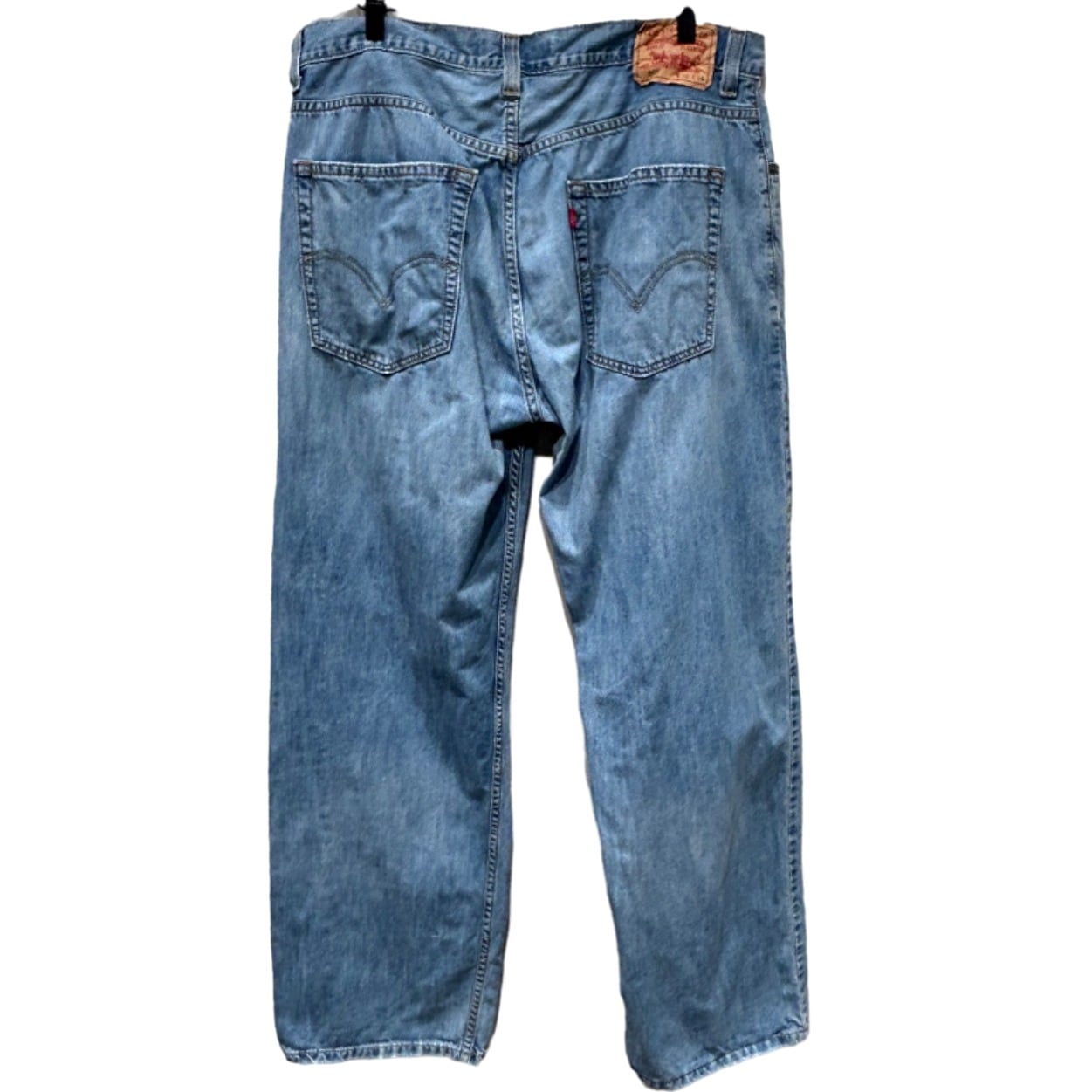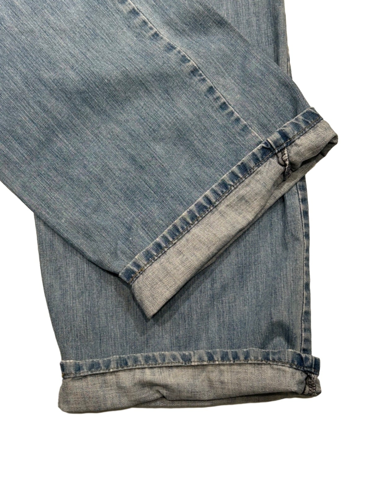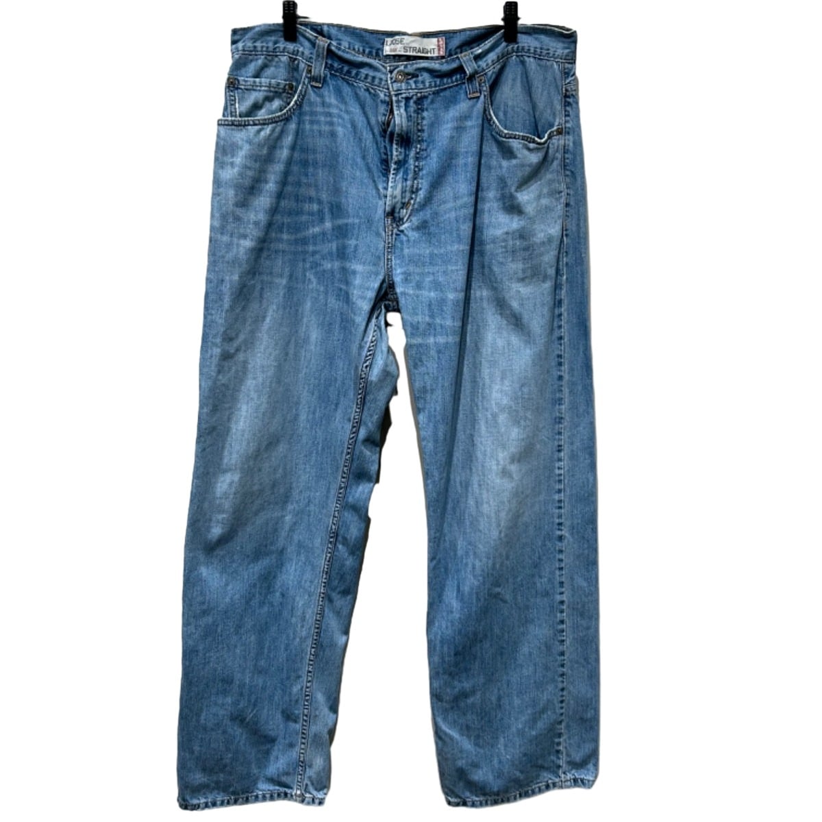 ウエスト~ワタリに余裕を持たせたルーズストレート。股上が32cmと深めで腰回りにゆとりがあり、腿から膝にかけて自然に落ちるストレートラインが特徴。生地はやや薄手~中肉のコットンデニムで、全体に均一な色落ちと薄いヒゲ・膝のアタリが出ているため、ロールアップして裾見せするスタイルやワイドめのシルエットを活かした着こなしに向く。ダメージは大きくなく普段使いで扱いやすいコンディション。