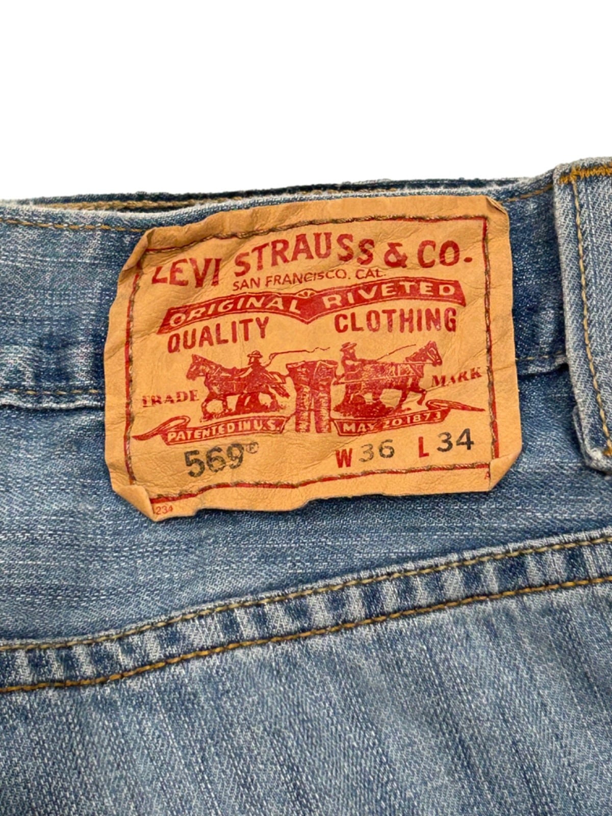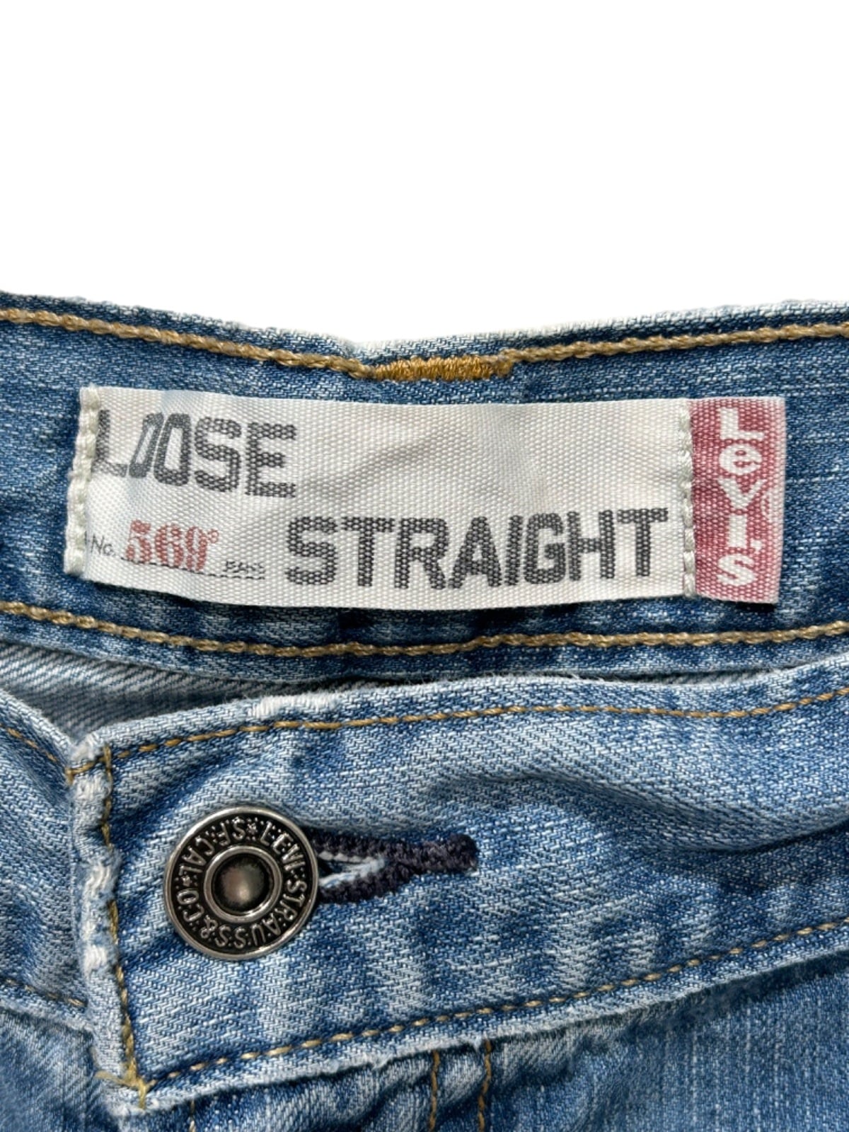 Levi'sの569はリラックスフィットを意識したルーズストレートの定番ライン。今回の個体は内側のタグに「569 LOOSE STRAIGHT」の表記と「MADE IN CAMBODIA」の記載があり、量産期の2000年代以降のモデルと推定できる(タグ表記が根拠)。ゆったりめのシルエットは90s〜00sのカジュアルワークやストリートの流れと親和性が高く、ライトインディゴの色落ちはあくまで普段使いで育てられた雰囲気。YKKジップの使用や革パッチの表記など、現行寄りの生産仕様が確認できる点も特徴。