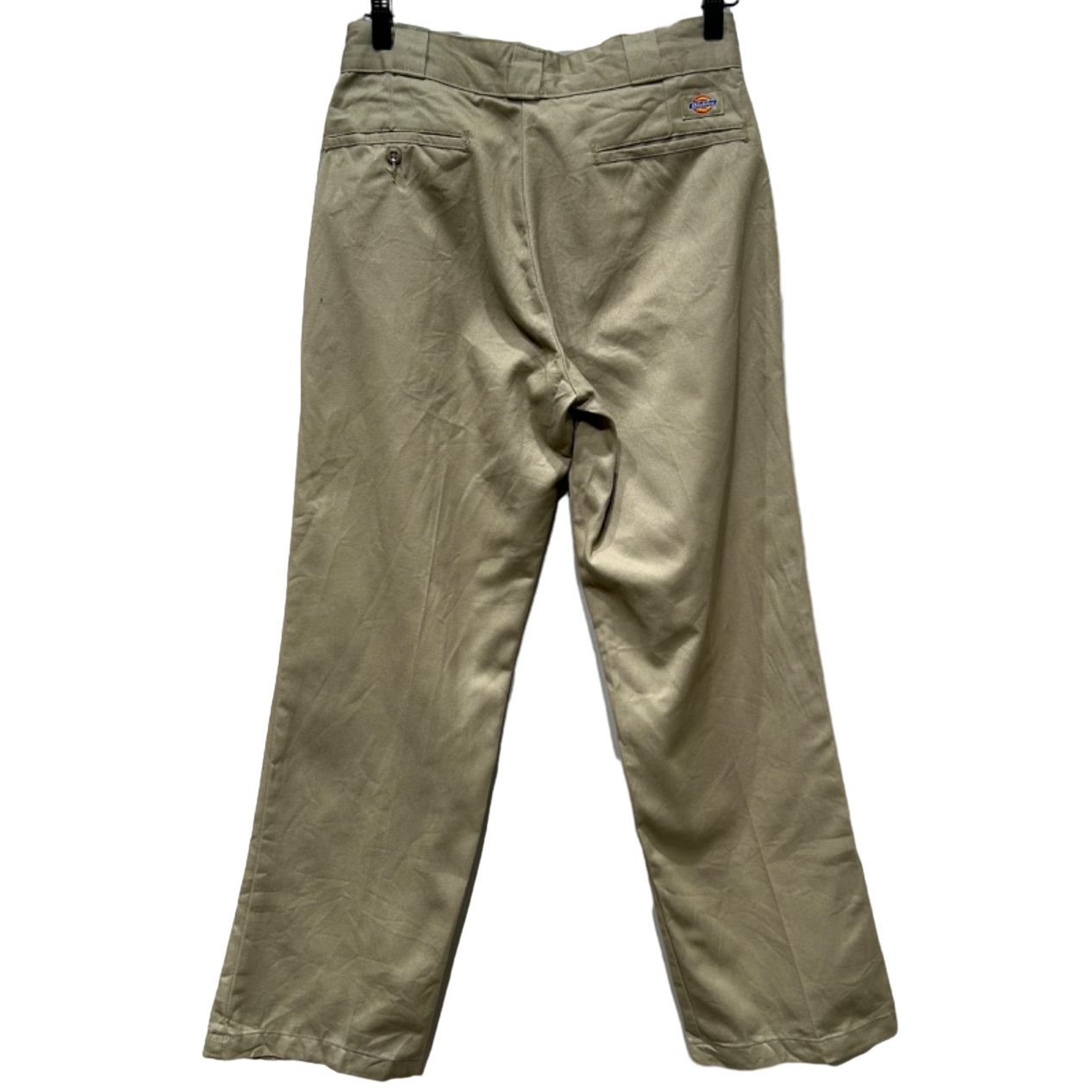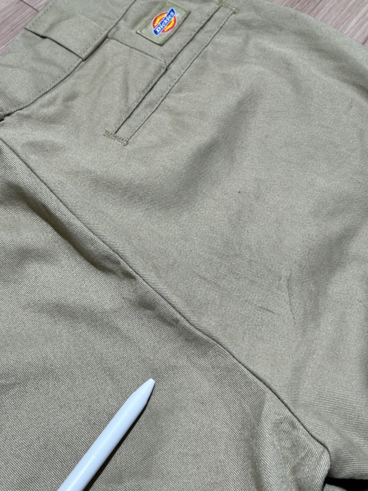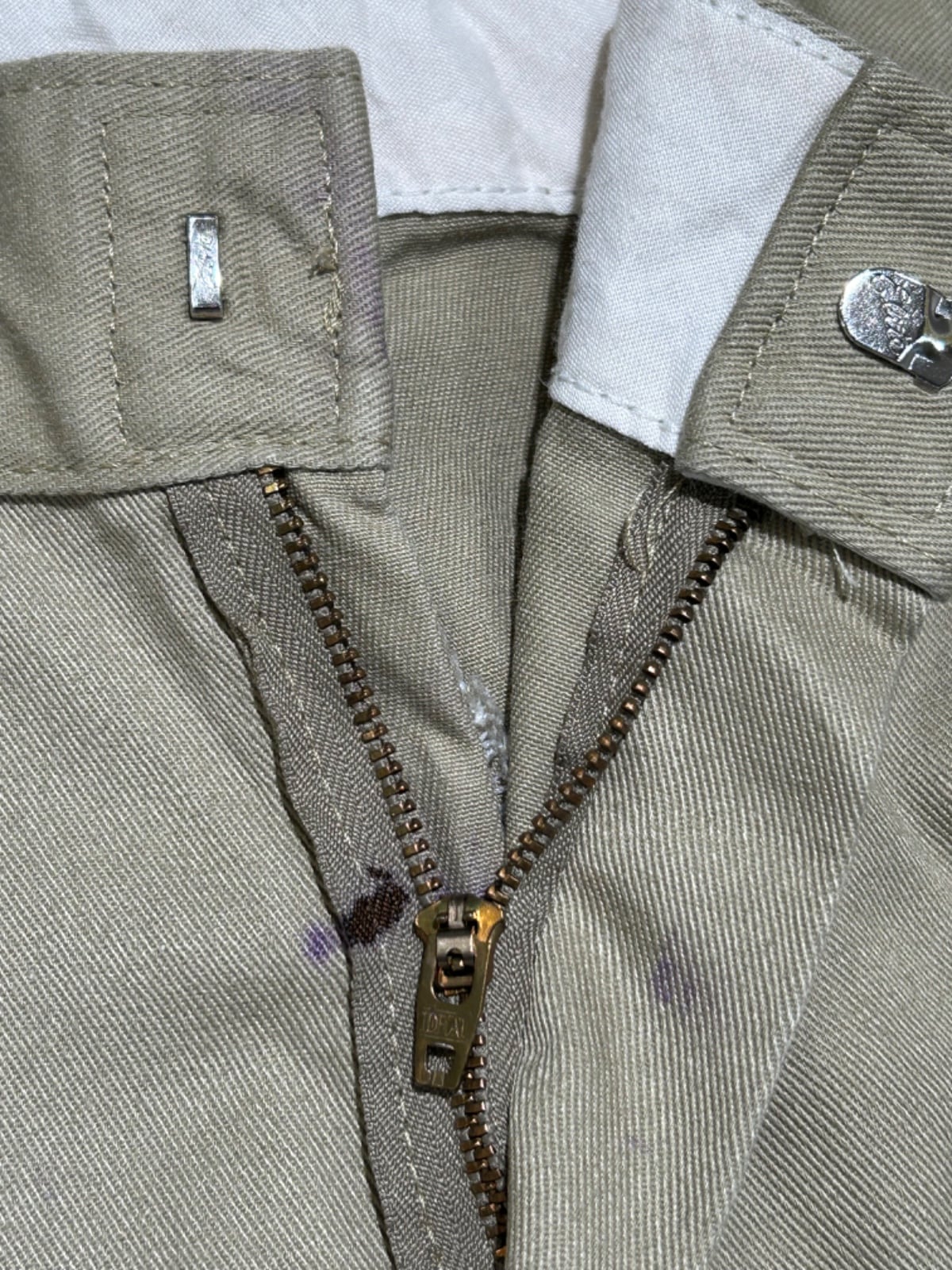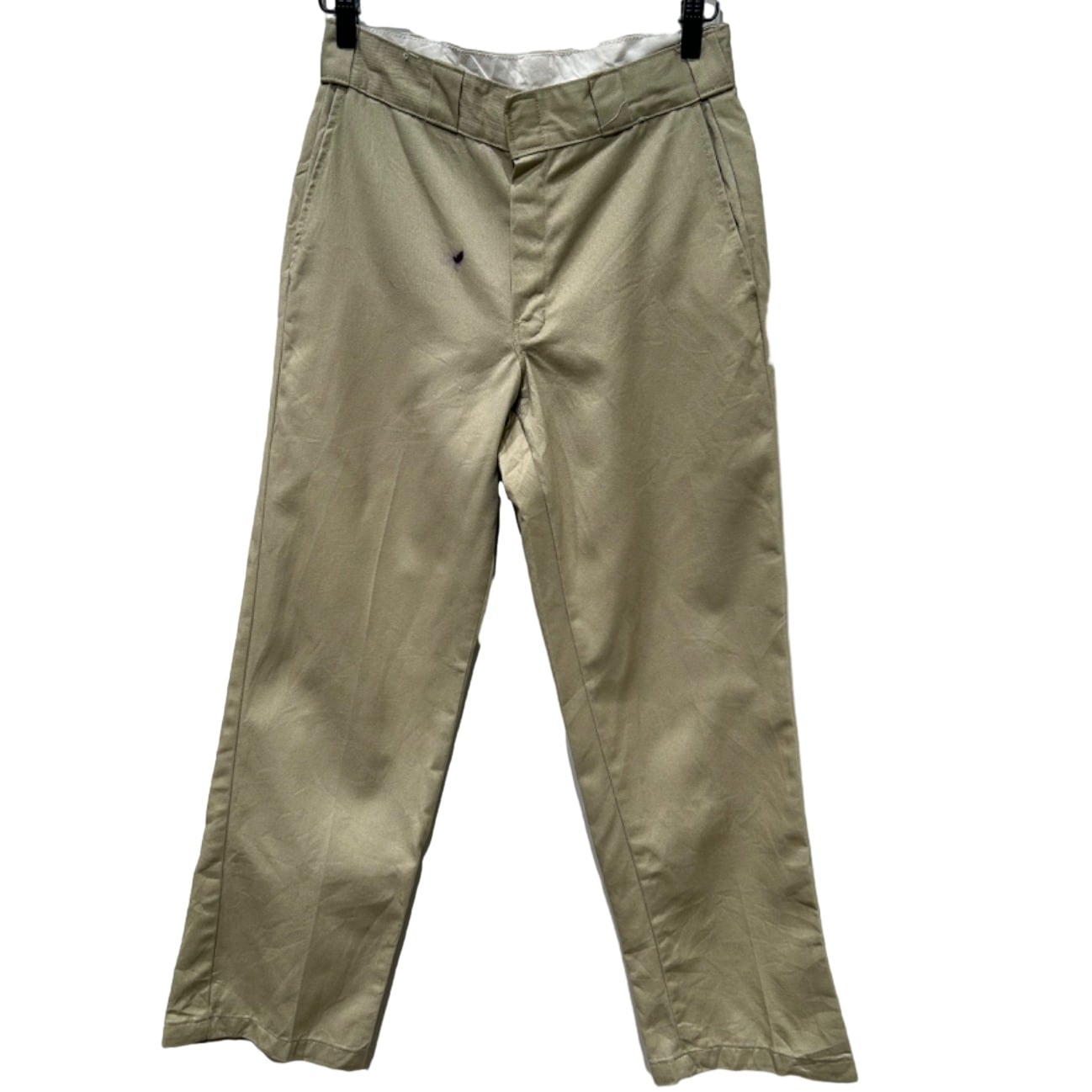 スッと落ちるストレートシルエットで、ルーズすぎない定番的なライン。ポリ混のツイルでハリがあり馴染みつつも型崩れしにくい生地感。フロントは斜めポケット、バックは薄めのウェルトポケット+上部に小さなDickiesロゴワッペンが付く仕様で、ワークらしいプレーンな見た目。ジッパーはIDEAL刻印の金属タイプで口元の開閉が堅牢。写真で確認できるように、フロント(ジッパー周り)と股〜太ももに紫色のインク染みが複数あり、使用感(シワ・薄いアタリ)も見られるが、大きな破れや生地欠損は確認できない個体です。