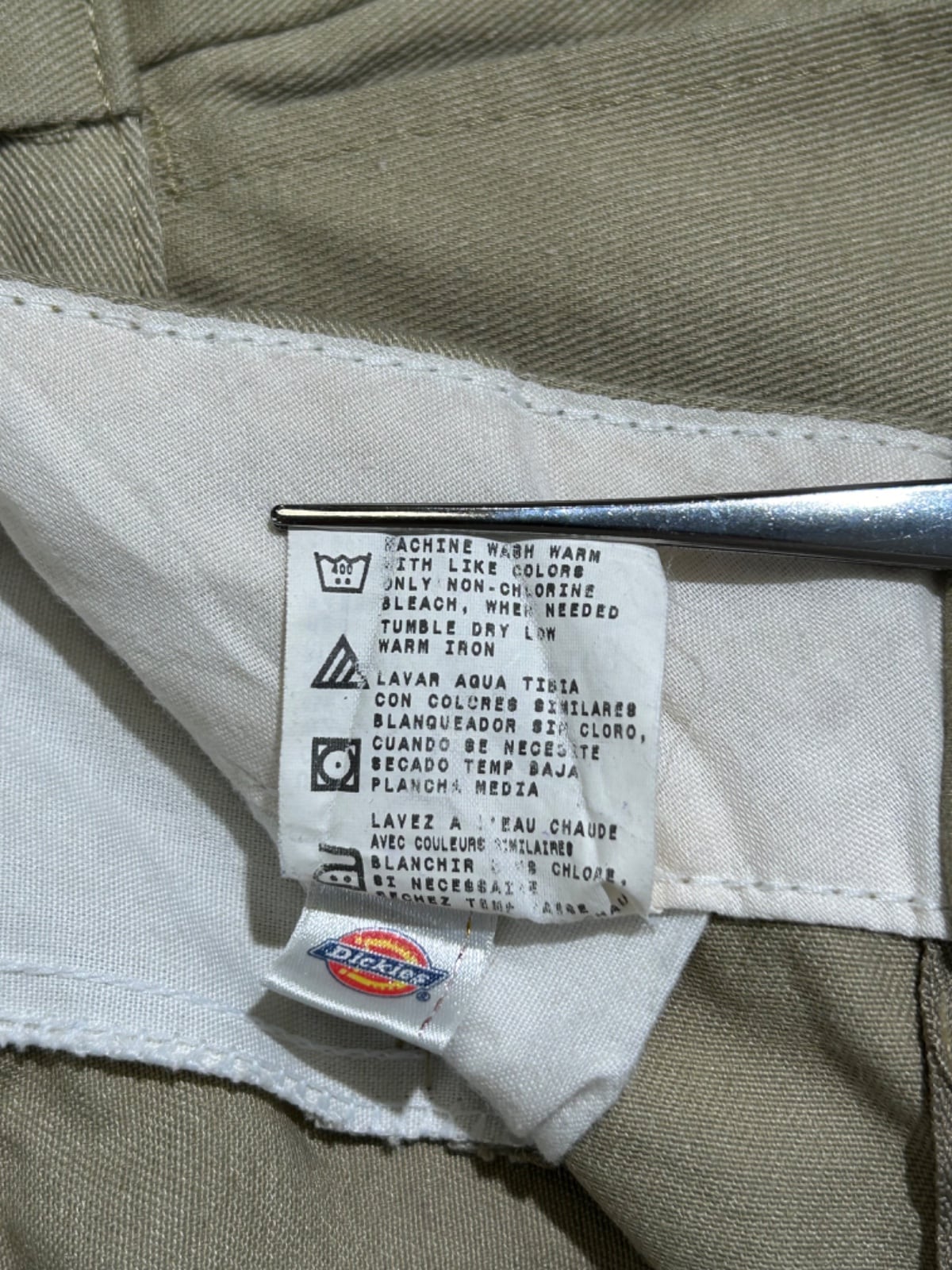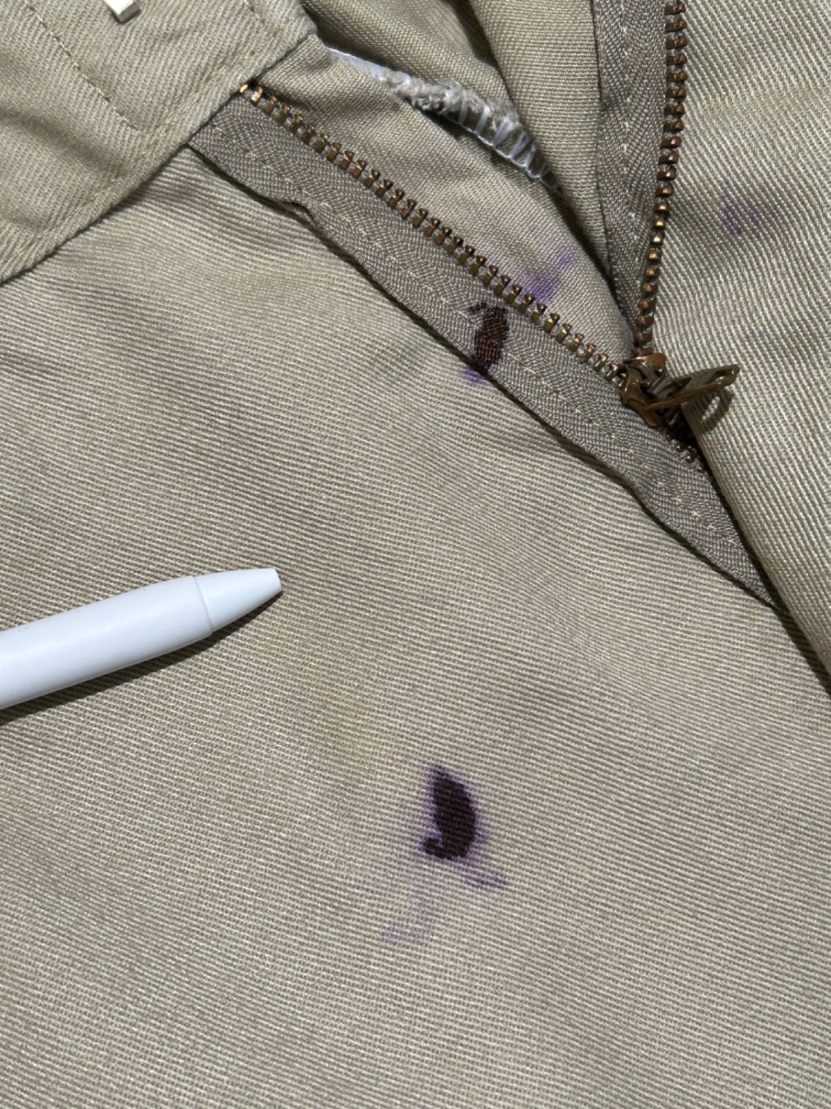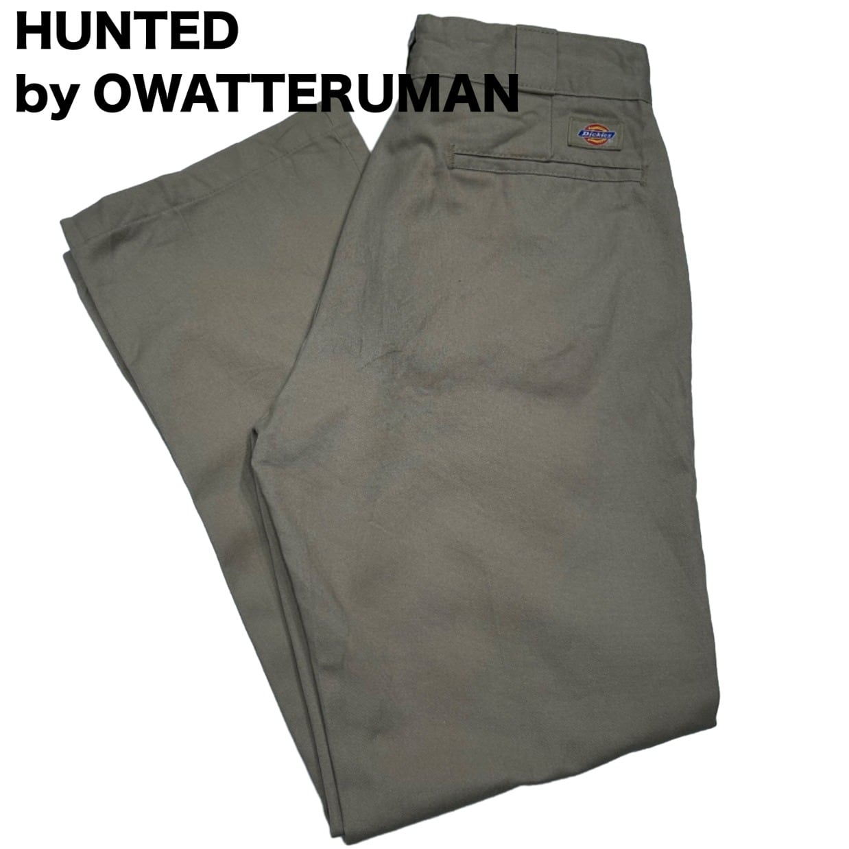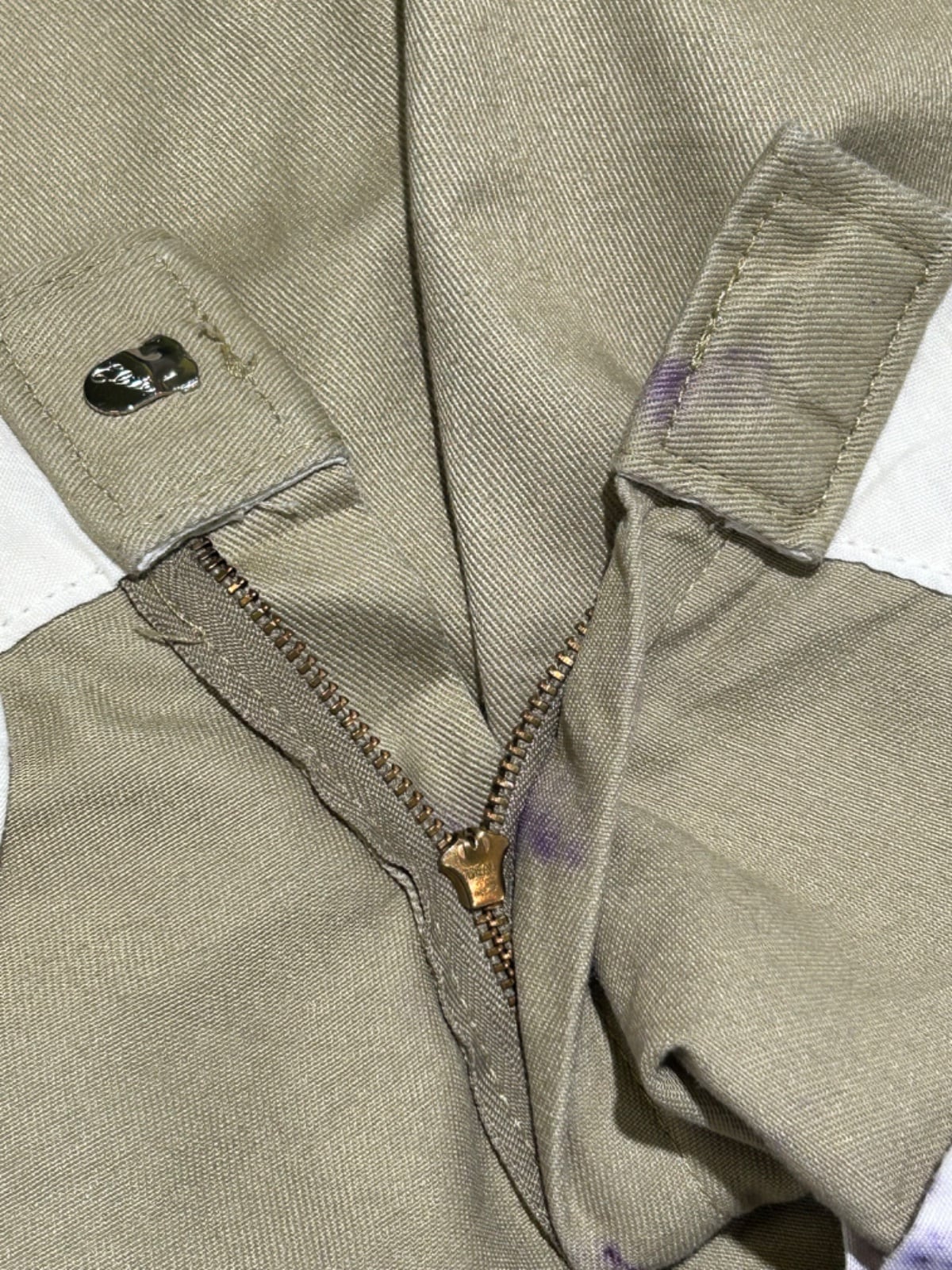 スッと落ちるストレートシルエットで、ルーズすぎない定番的なライン。ポリ混のツイルでハリがあり馴染みつつも型崩れしにくい生地感。フロントは斜めポケット、バックは薄めのウェルトポケット+上部に小さなDickiesロゴワッペンが付く仕様で、ワークらしいプレーンな見た目。ジッパーはIDEAL刻印の金属タイプで口元の開閉が堅牢。写真で確認できるように、フロント(ジッパー周り)と股〜太ももに紫色のインク染みが複数あり、使用感(シワ・薄いアタリ)も見られるが、大きな破れや生地欠損は確認できない個体です。