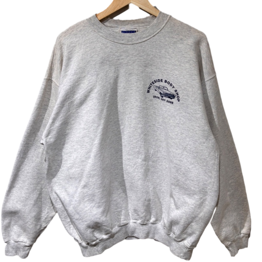 左胸に入る「WHITESIDE BODY SHOP」の小さなロゴは、ローカルの自動車整備店やボディショップが配布していたプロモーショナルアイテムを想起させるデザインです。