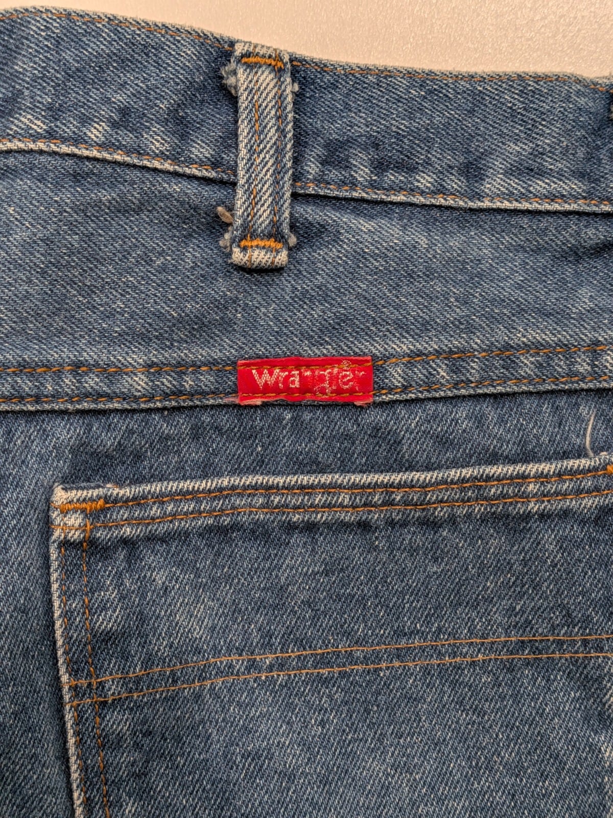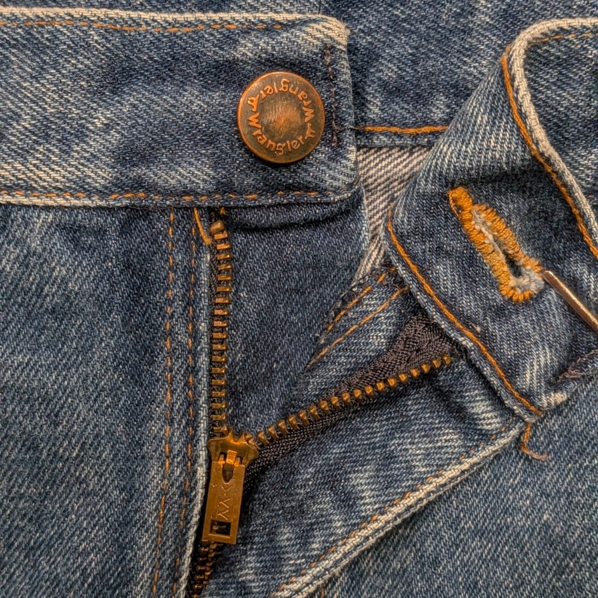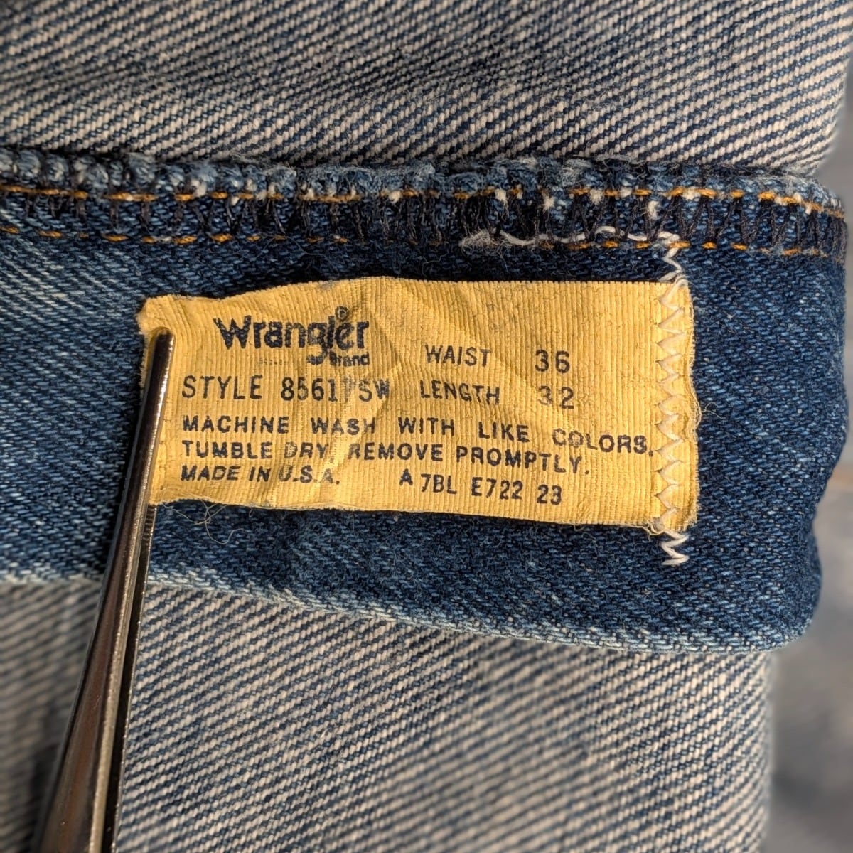 Wranglerの定番的なジーンズモデルで、バックポケットの赤タブと内側のスタイルタグにMade in U.S.A.表記が残る個体です。