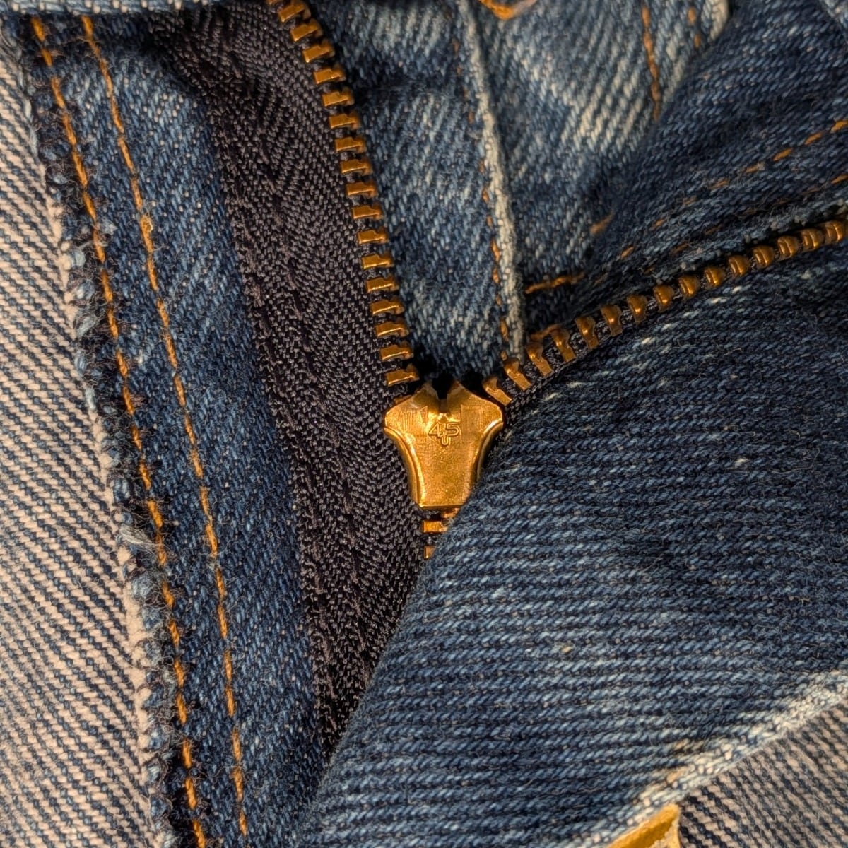 シンプルな5ポケット構造と赤タブ、メタルボタン・ジッパーの組み合わせでワーク感のある見た目にまとまっています。