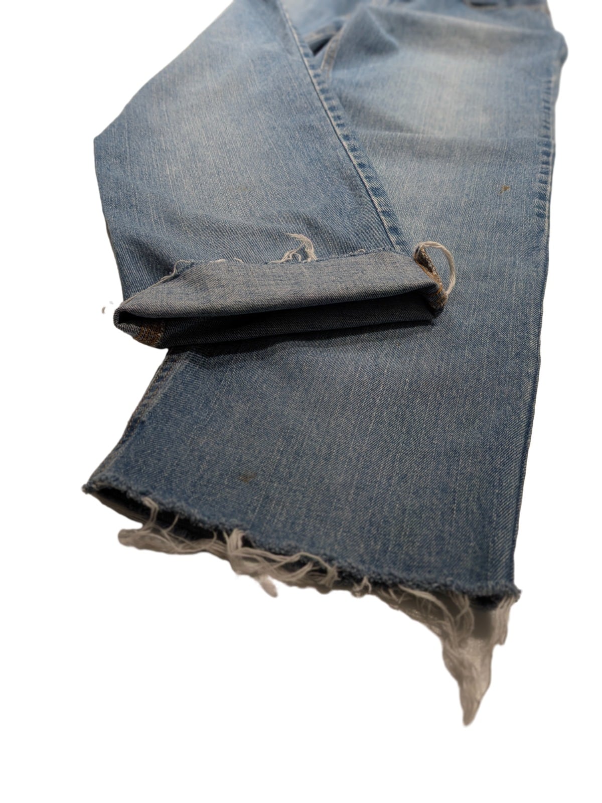 裾はカットオフのフリンジ仕上げでラフな雰囲気が強く、ロールアップやそのまま履くスタイルどちらも対応可能。