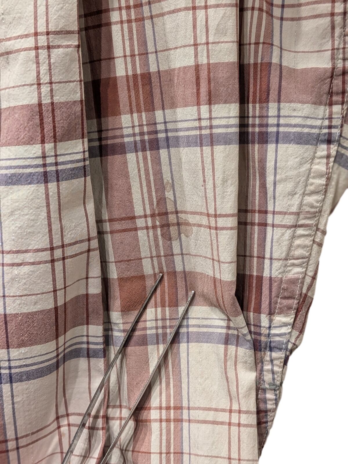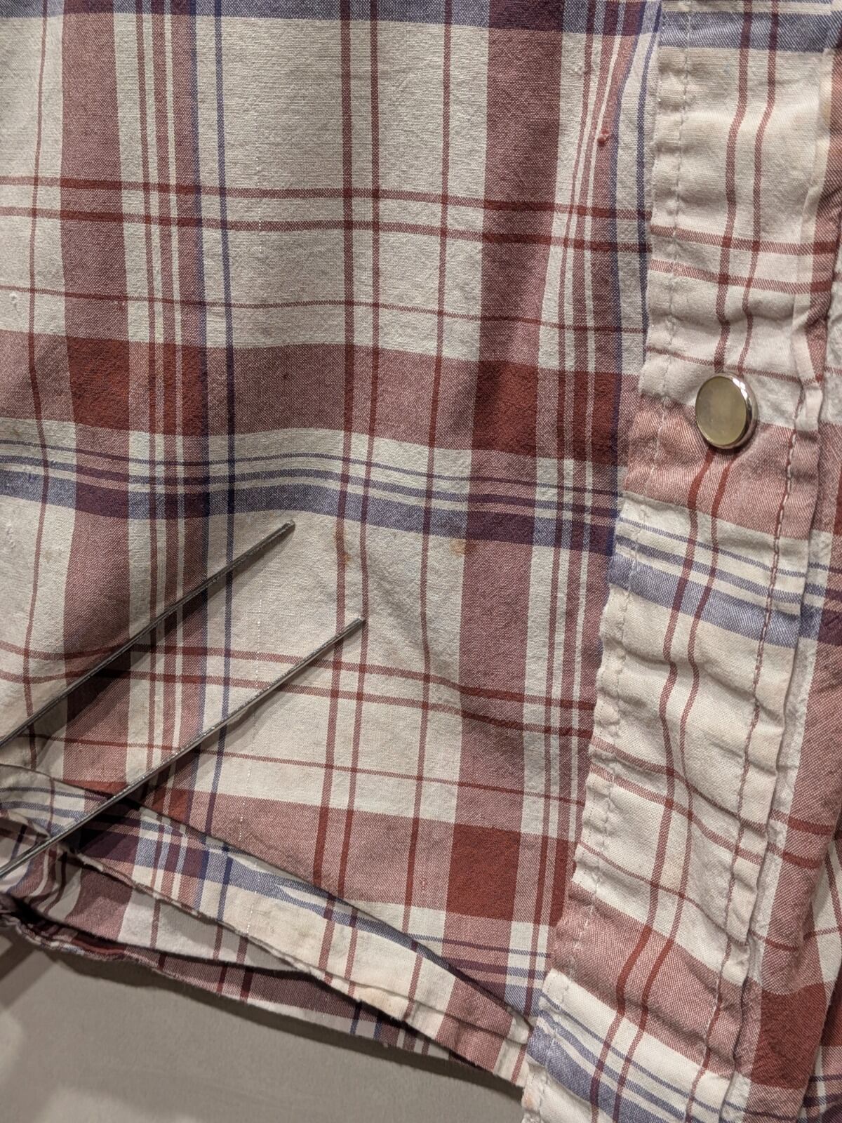 胸周りや袖先に薄いシミが見られるが、縫製やボタン類は良好で長く使える状態。