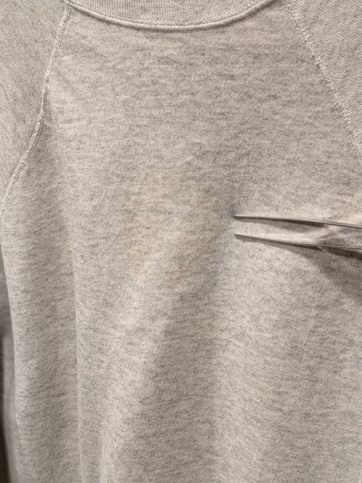 左袖付近と袖リブに薄い黄ばみ・使用感が見られる点を確認済み。