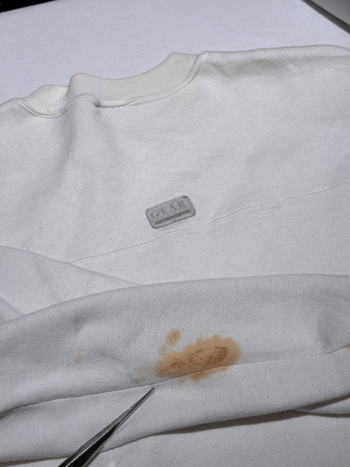 右袖に目立つ茶色のシミがあり、フロントプリント周辺に小さなピンホールと薄い色抜けが見られるのが現状の状態です。