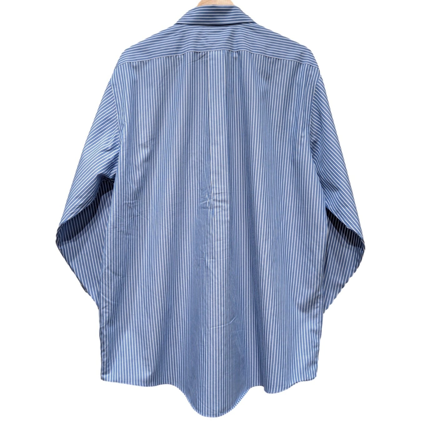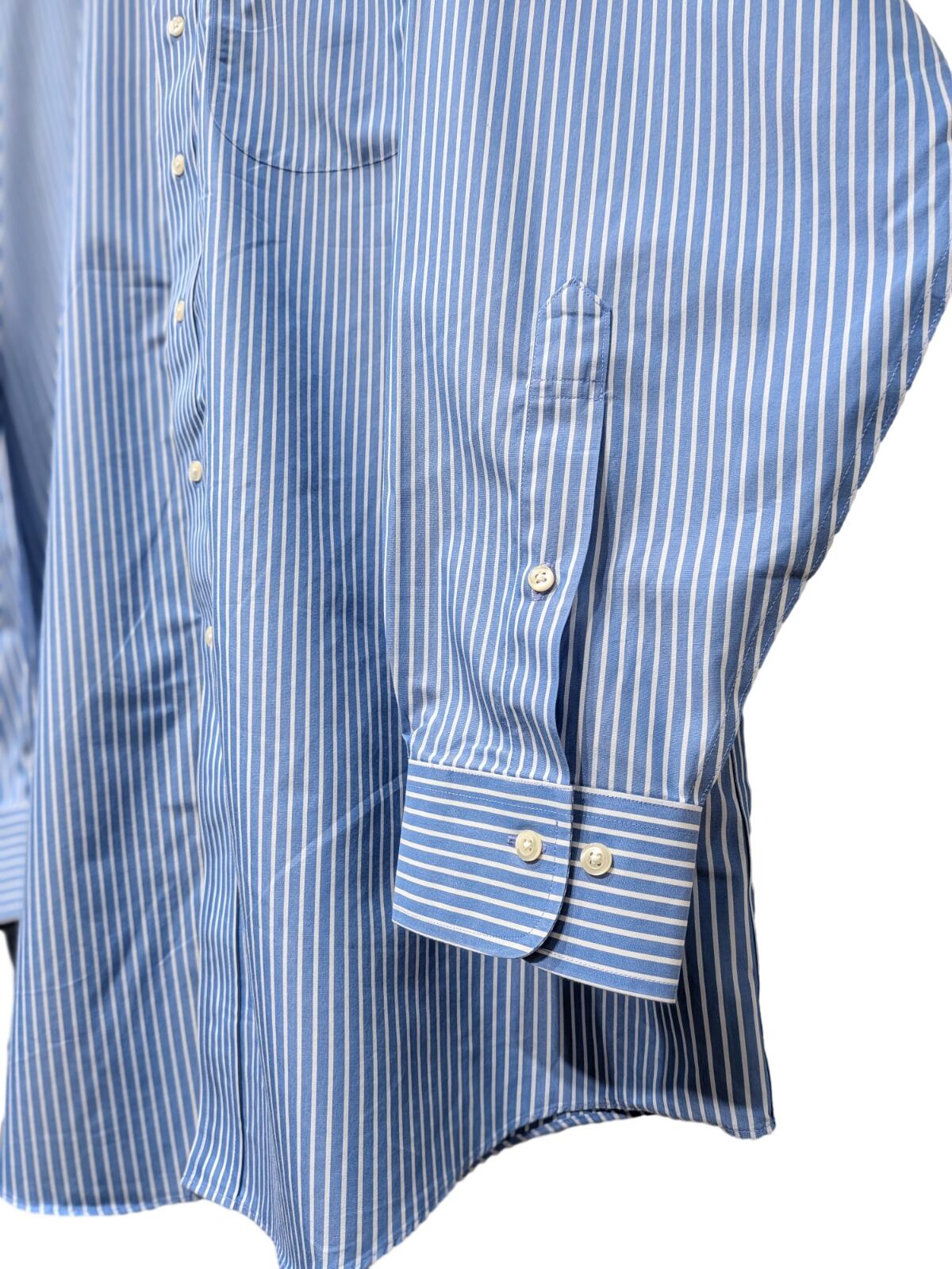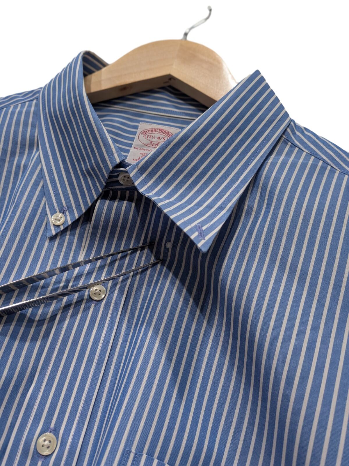 ボタンダウンカラーと細ストライプはブロード系ドレスシャツの定番ディテールで、ビジネスからカジュアルまで幅広く使われてきたアイテムです。