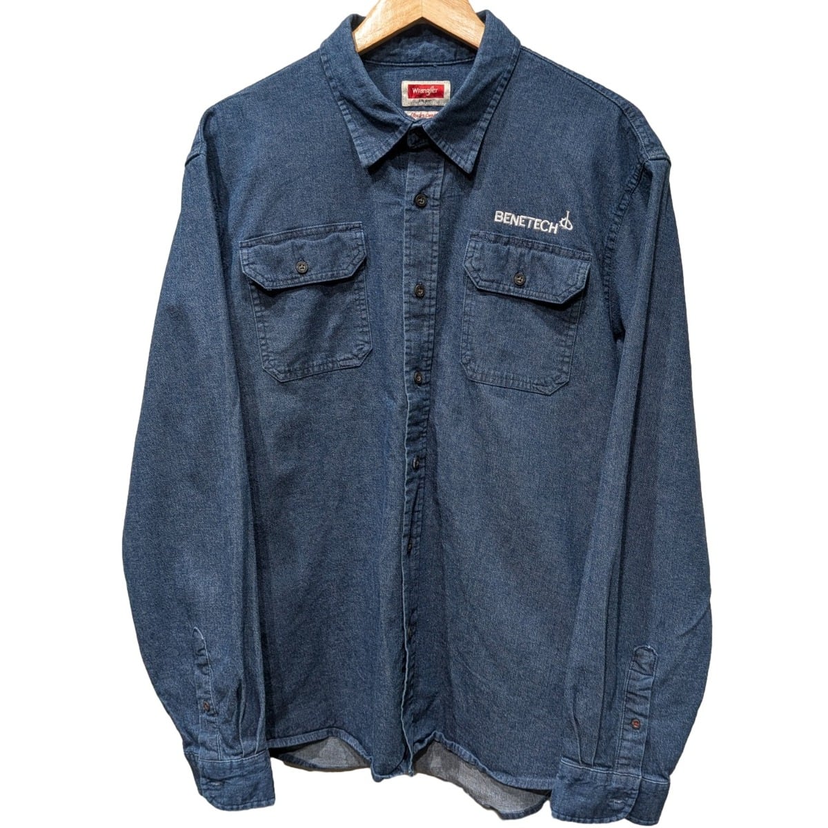 ワークウェア由来のディテールを持つデニムシャツで、企業ロゴ刺繍が入るユーティリティアイテムです。