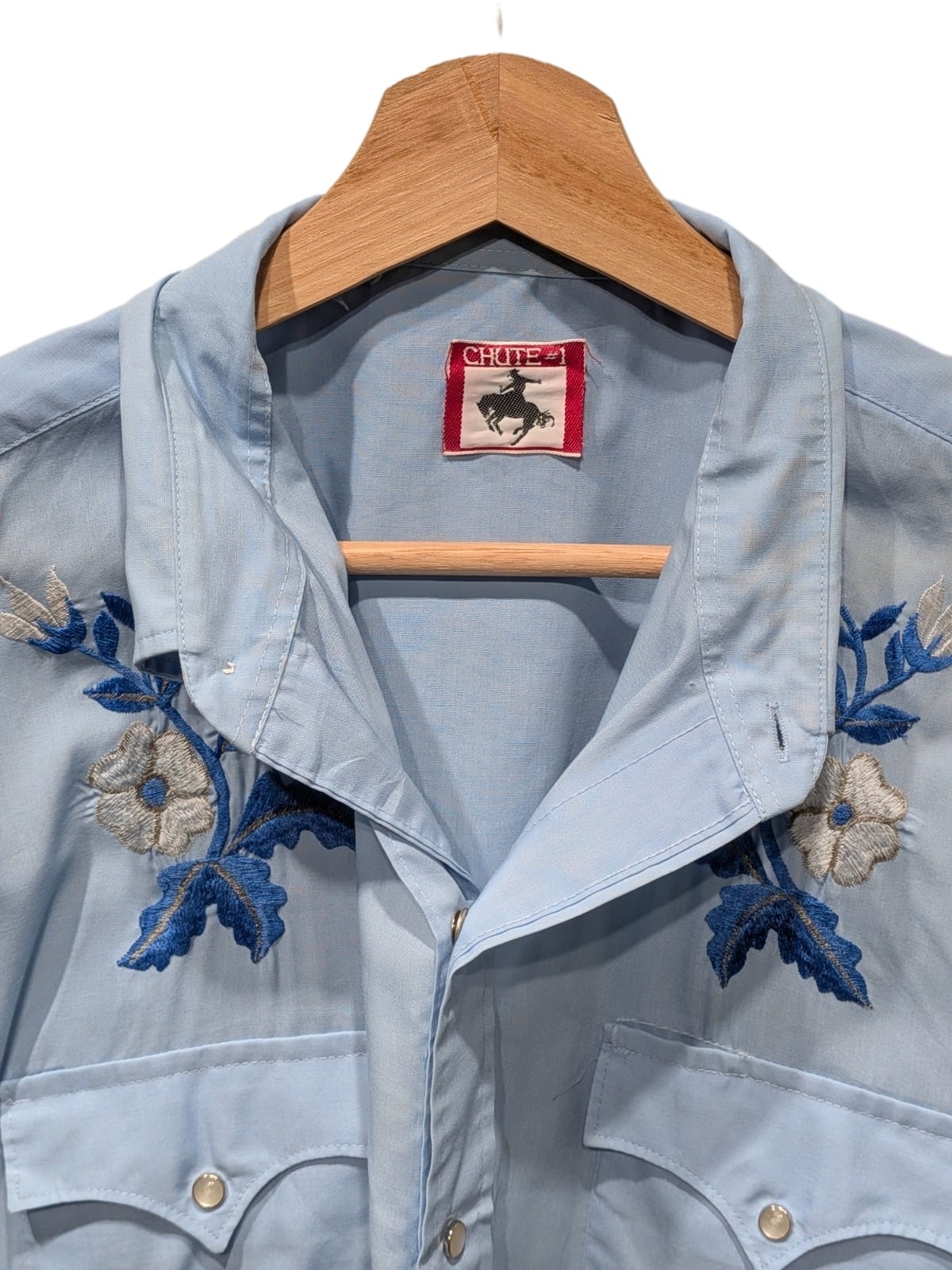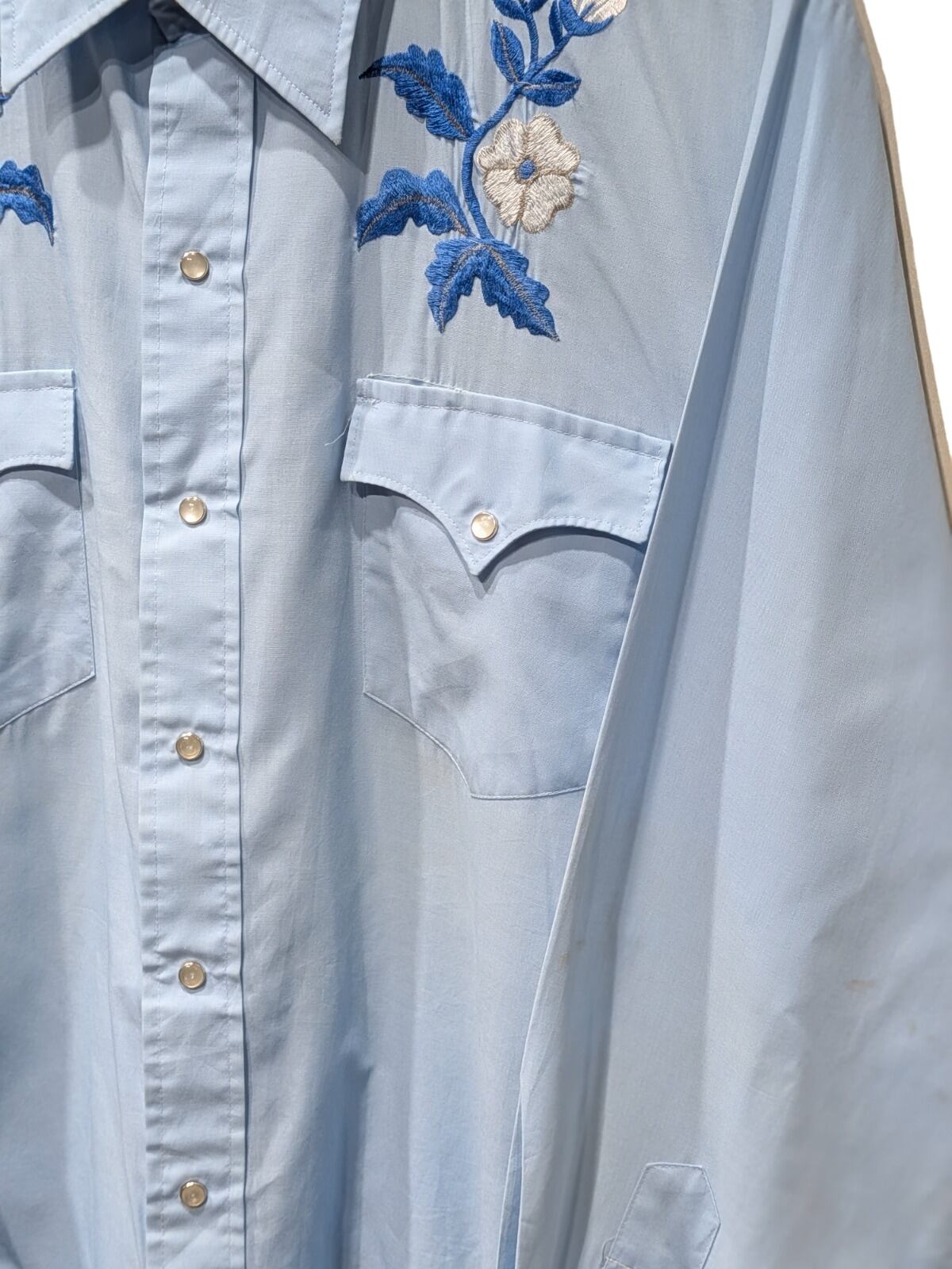 肩〜胸にかけてのブルー系刺繍は左右対称に配されており、シャープなヨークラインと組み合わせてウエスタンらしい表情を作っている。