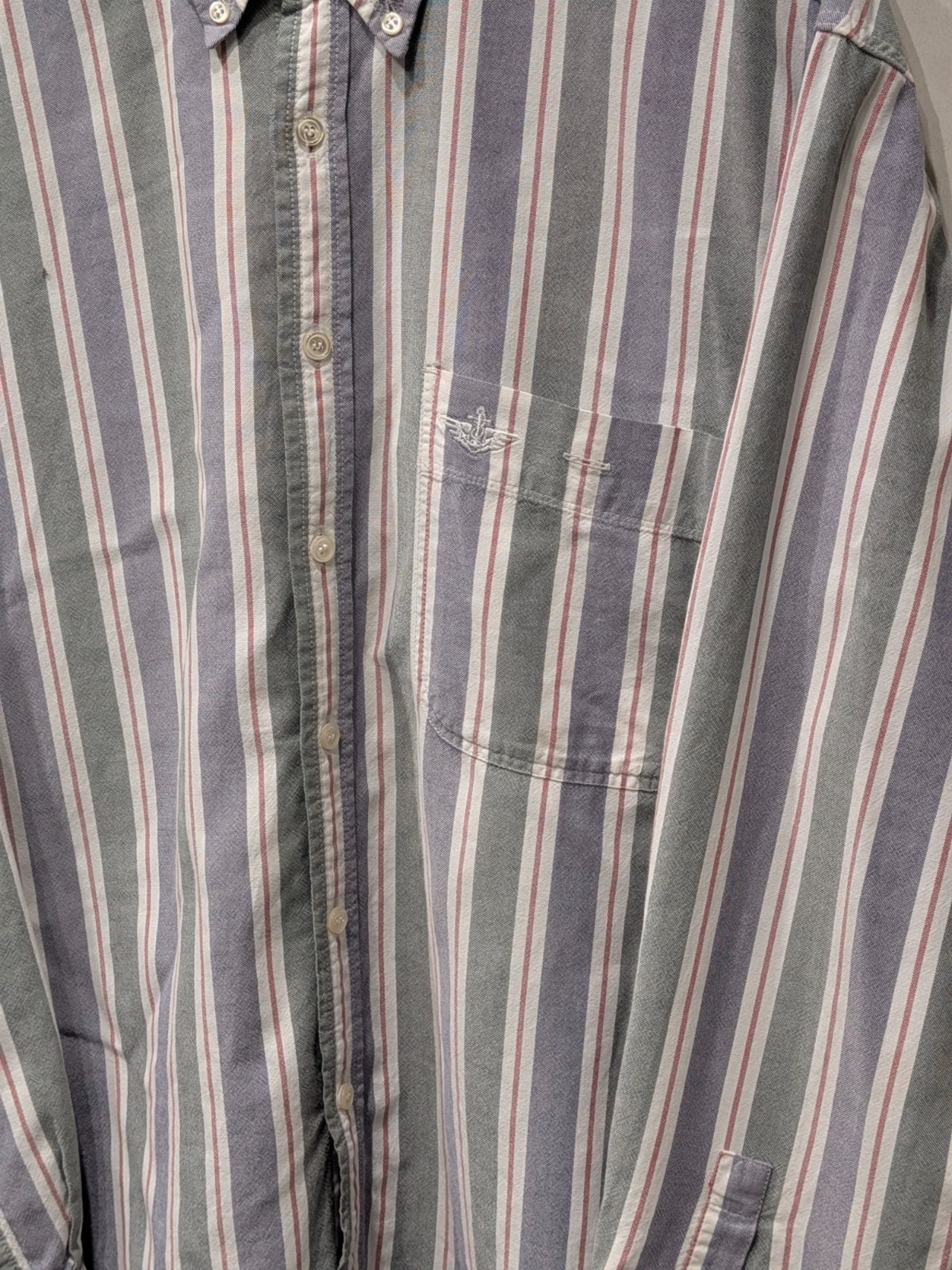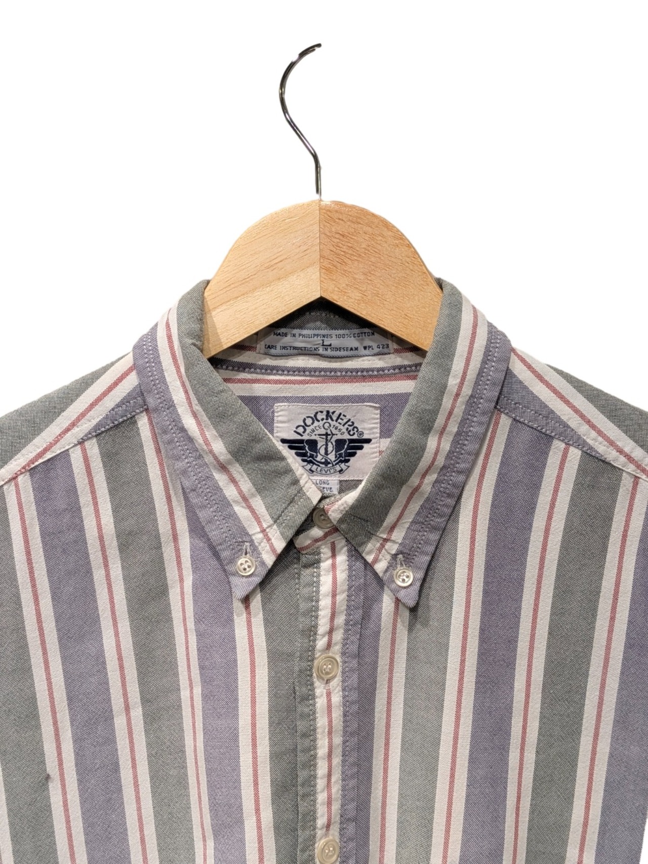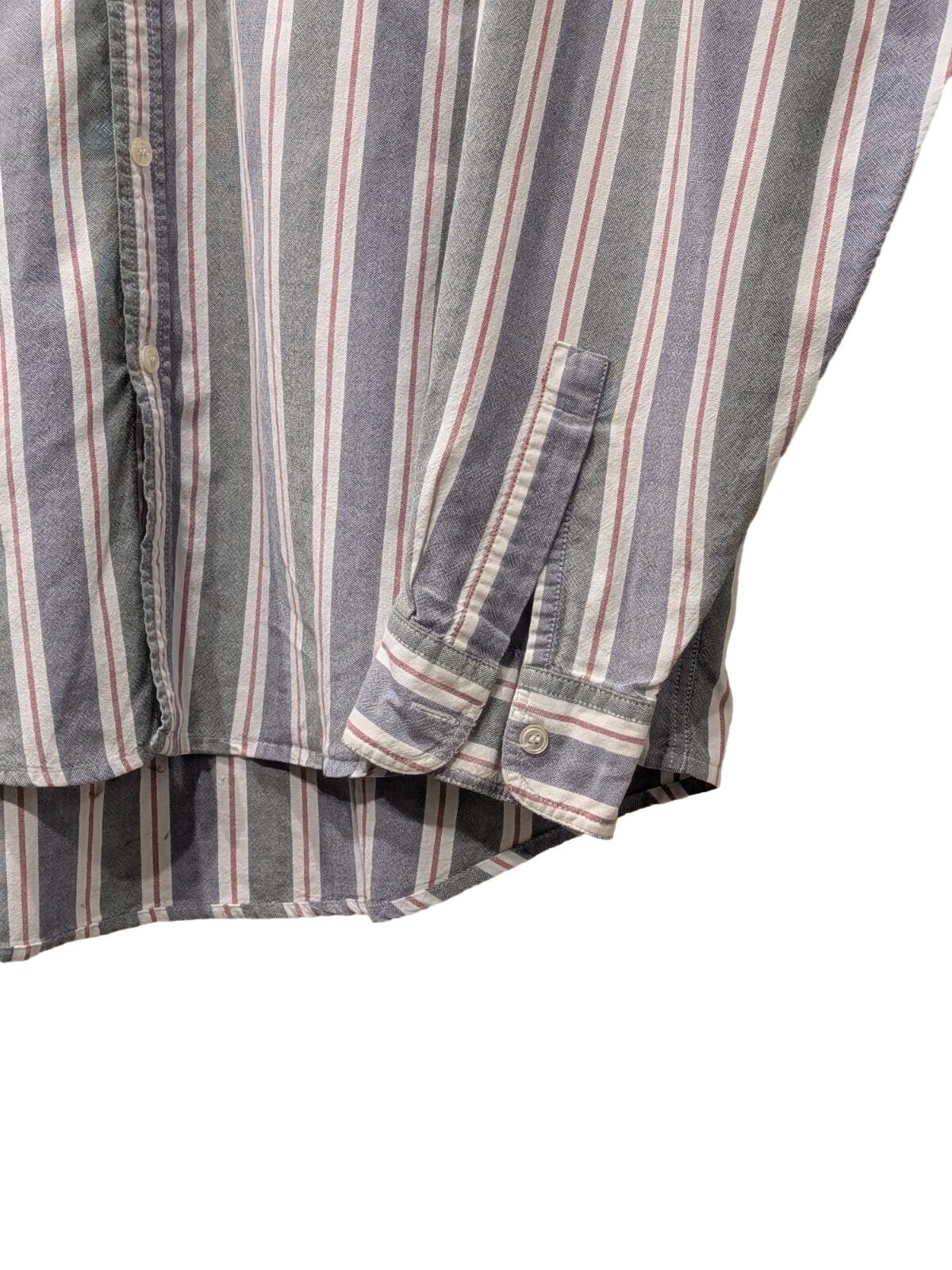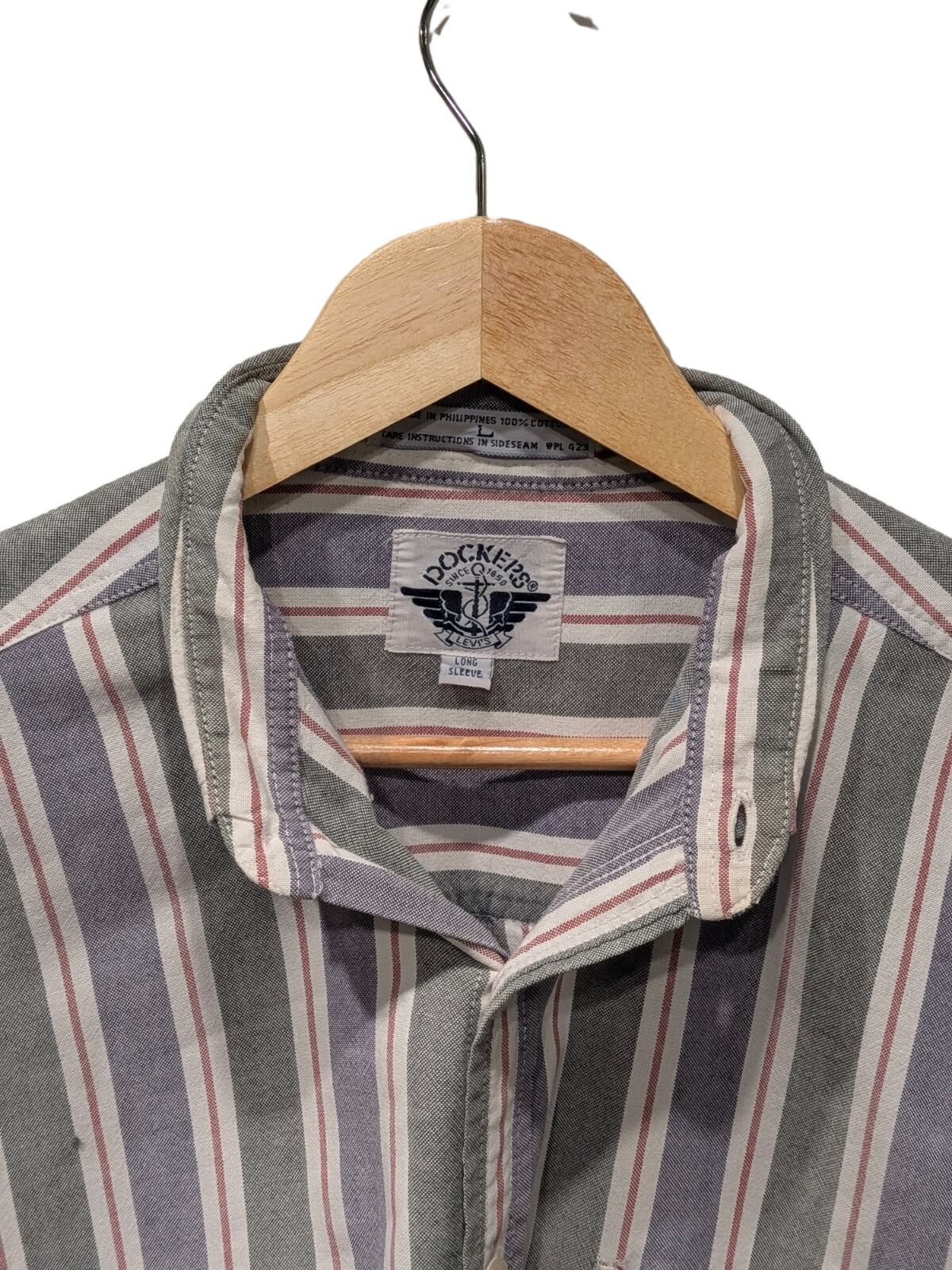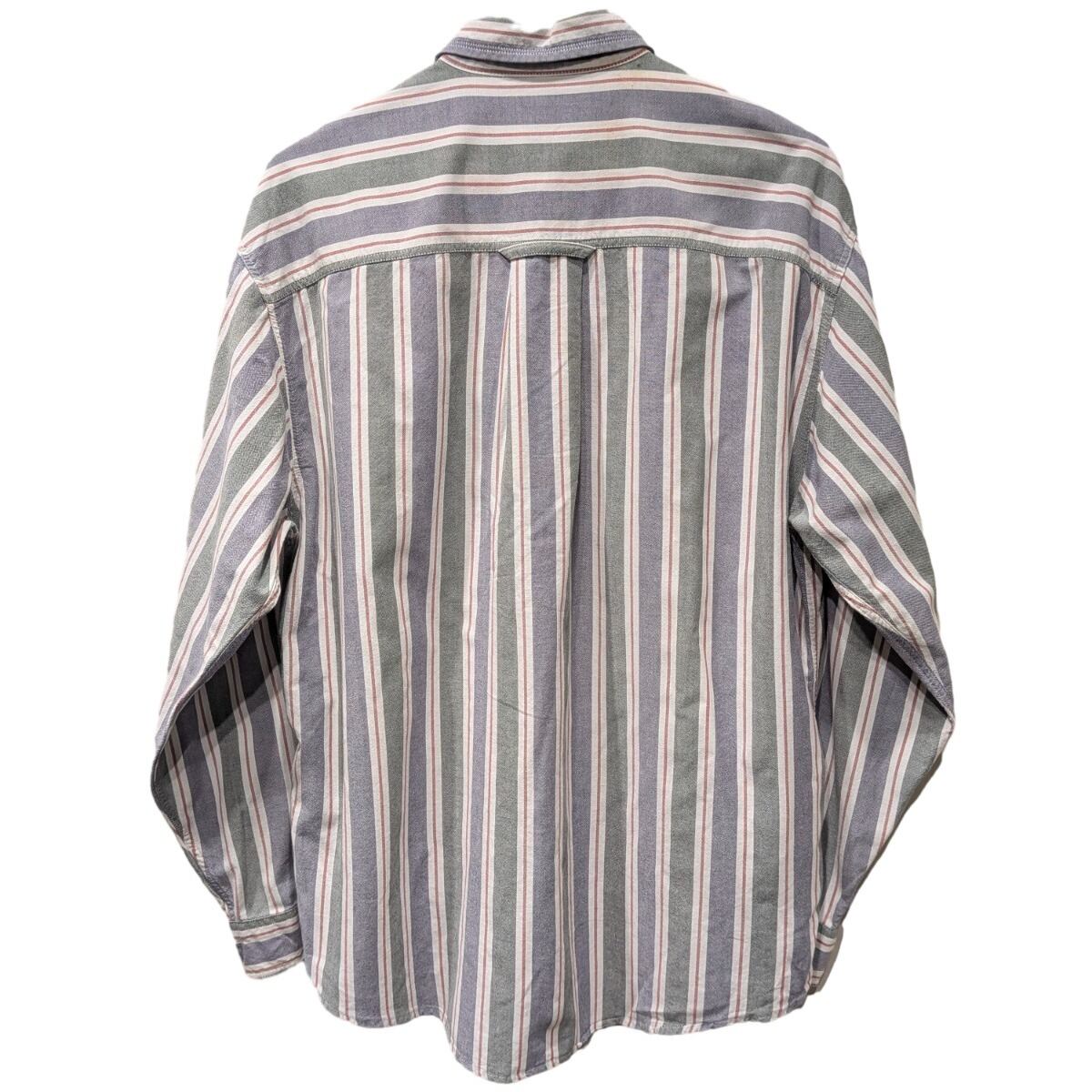 ボタンダウン仕様のストライプ長袖シャツで、カジュアルからワーク寄りの着こなしに馴染む定番アイテム。