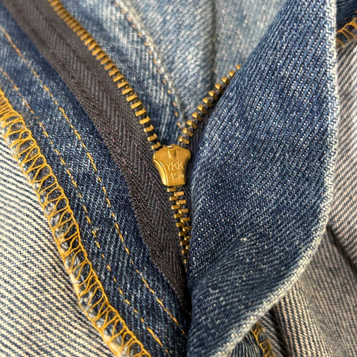 バックポケットに赤タブとアーキュエイトステッチ、フロントはYKKジッパー仕様の5ポケット構造。