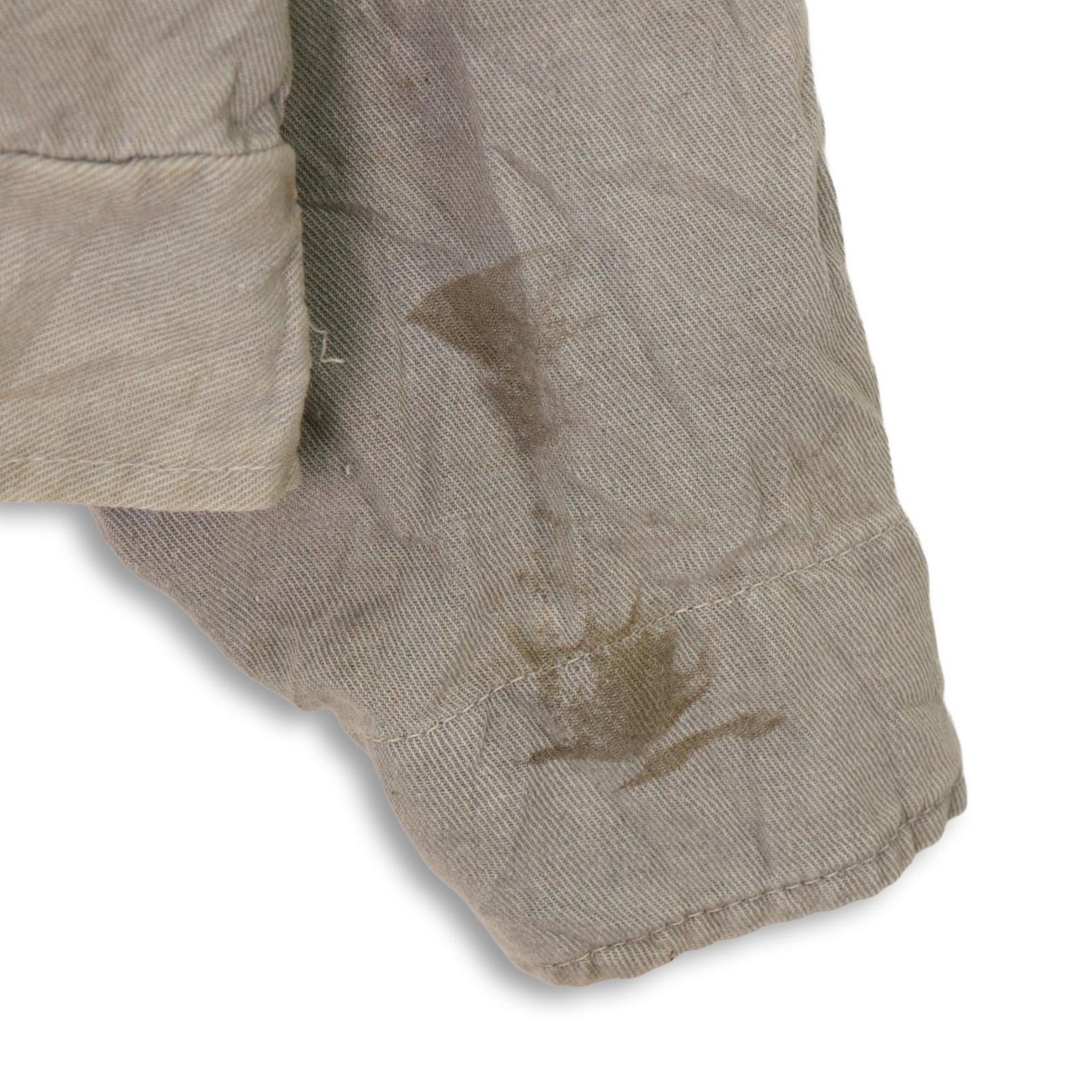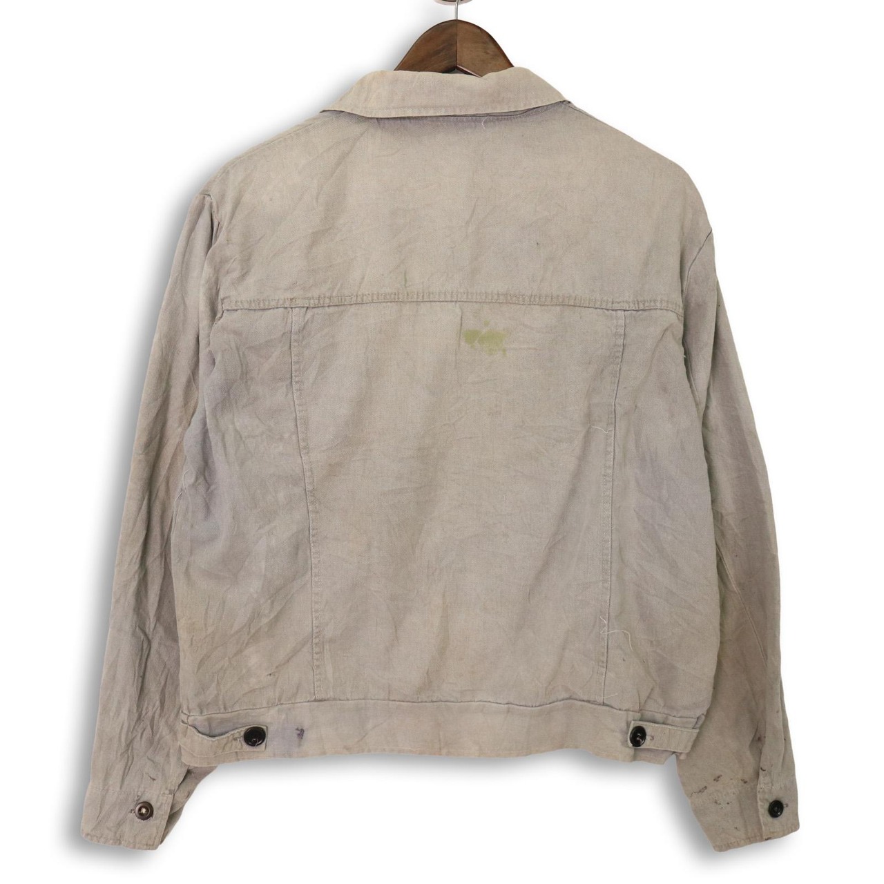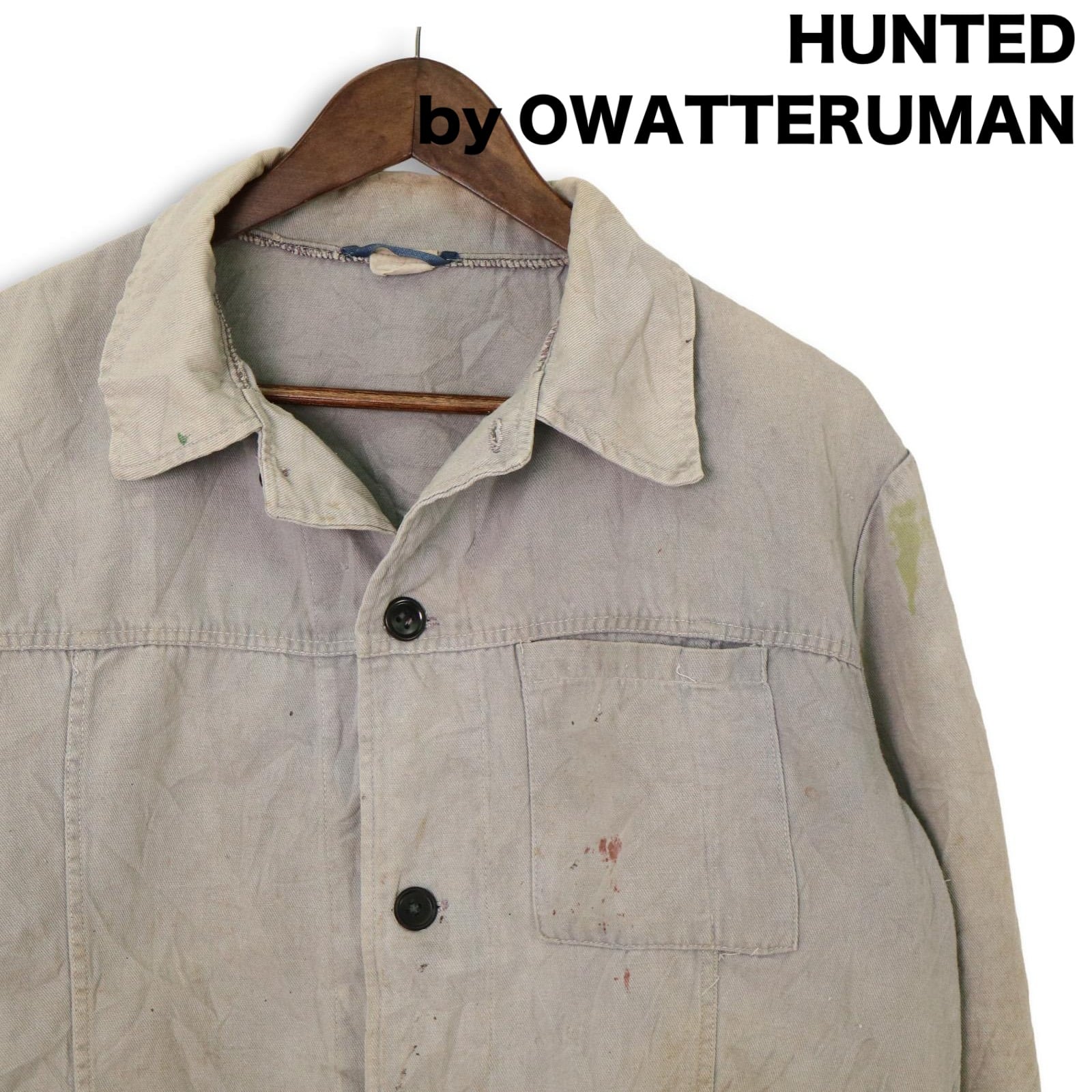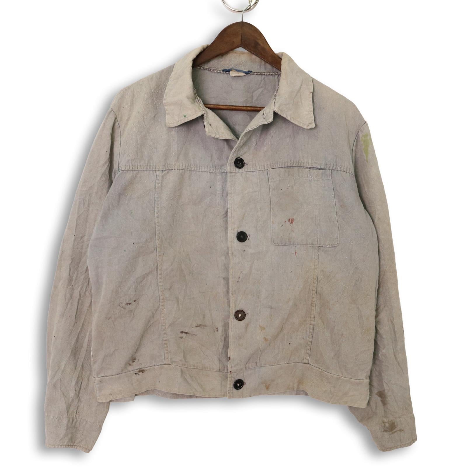 袖口や身頃にペンキ飛びや染み、補修跡が複数見られる点は現状のコンディションとしてご確認ください。