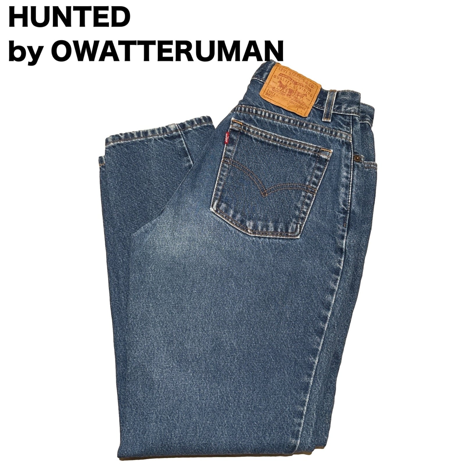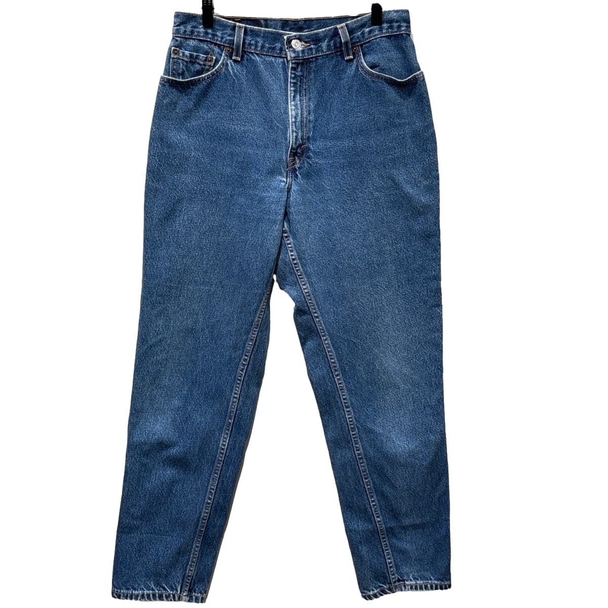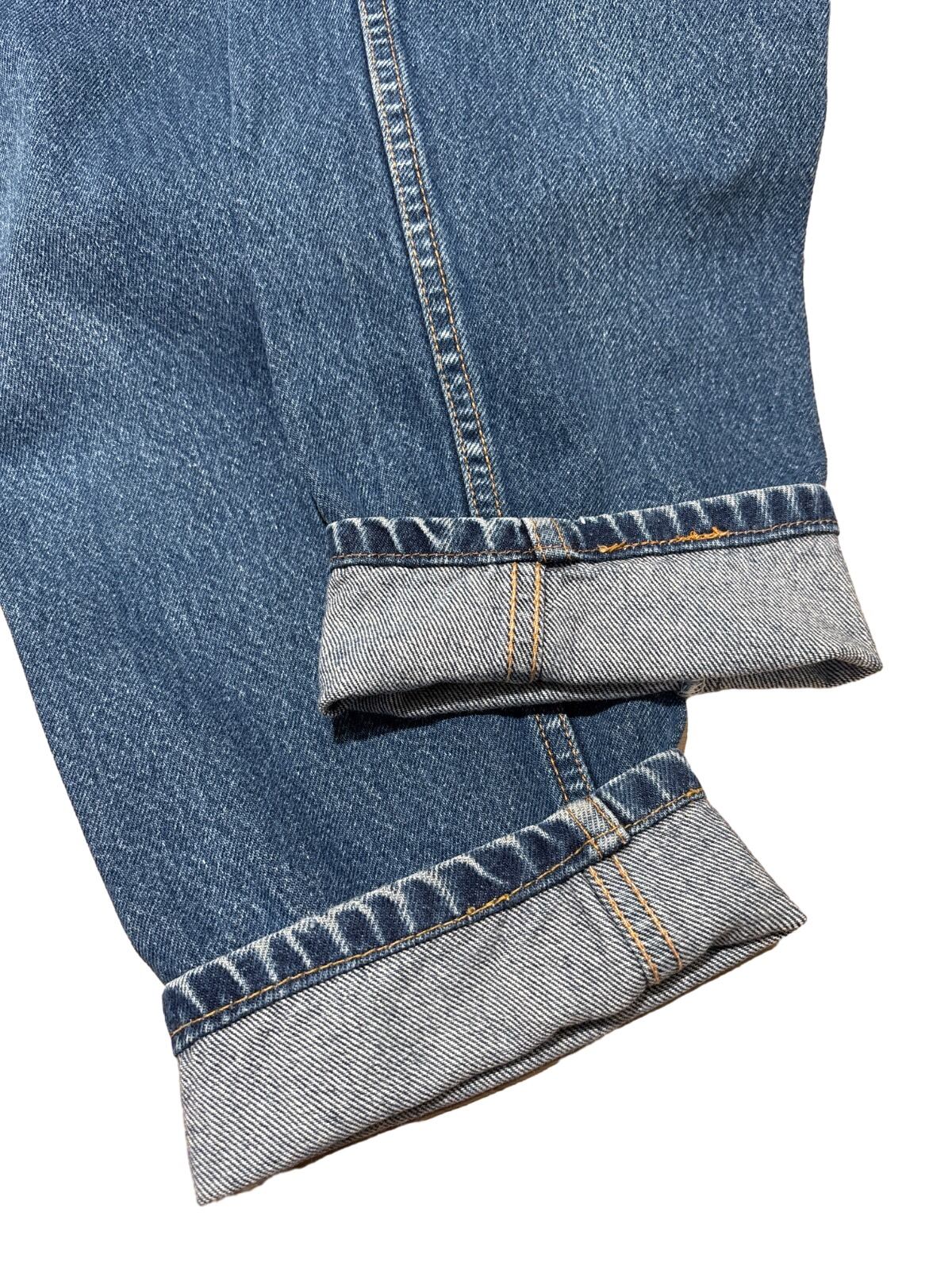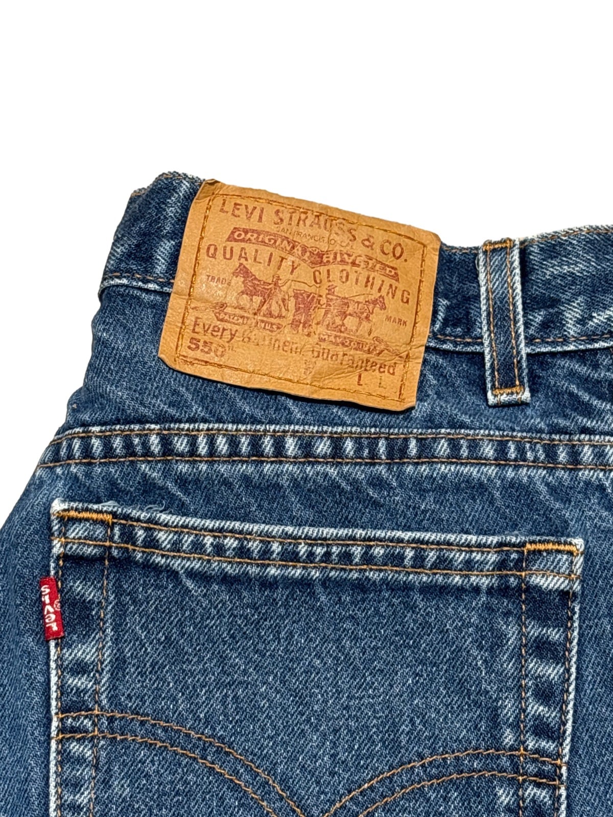 Levi's 550はリラックスフィットにテーパードを掛け合わせた、90sに広く流通したモデルです。内タグの「550」「RELAXED FIT TAPERED LEG」表記と「Made in U.S.A.」表記から、90s期のUSA製ラインの個体と推定しています。ゆったりした腰まわりと裾に向けて細くなるシルエットは、ストリート〜アメカジまで汎用性の高い定番構成です。