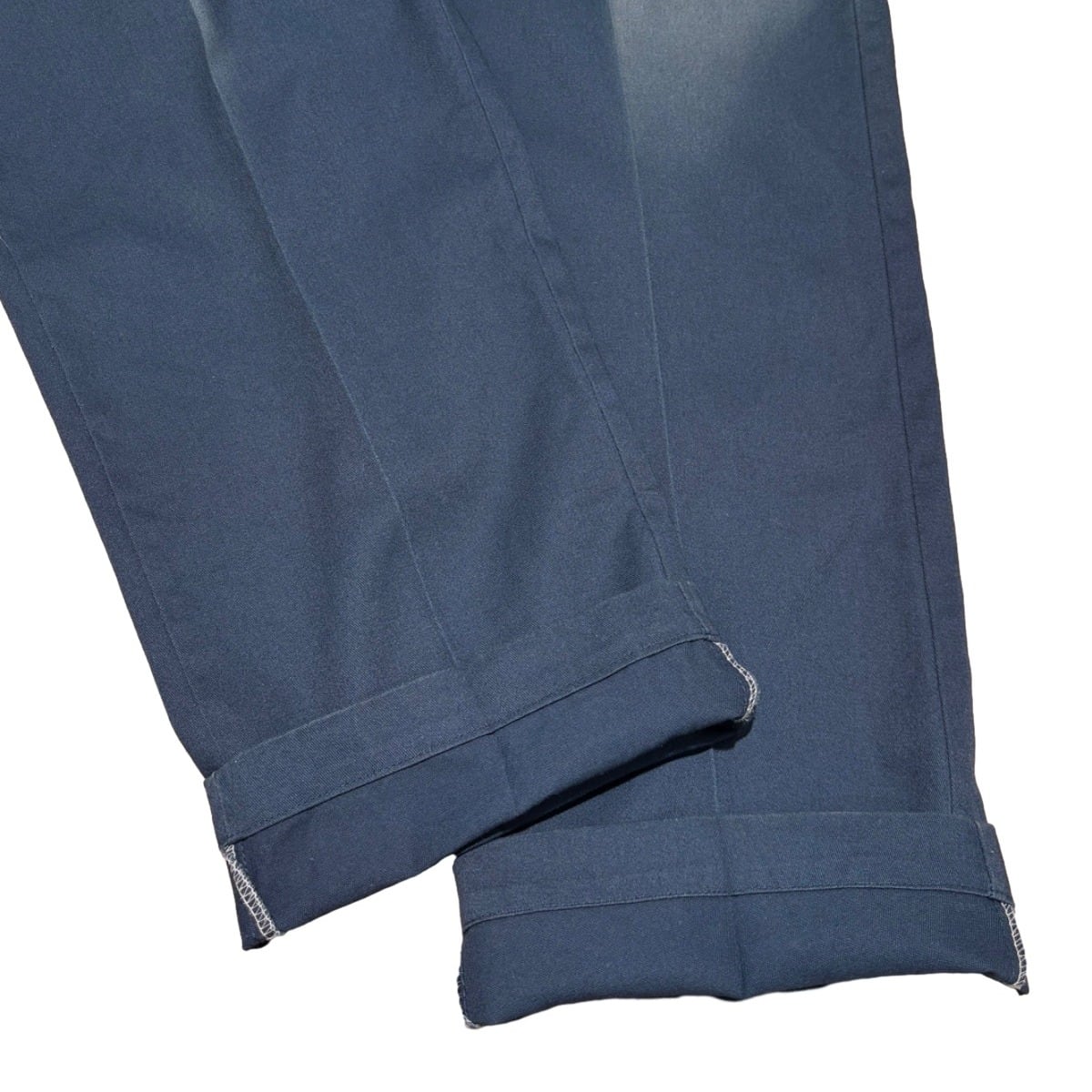 Dickiesのワークパンツは、作業着としての機能性を軸に街着へと取り込まれてきた定番アイテム。バックポケット上の小さなブランドパッチや片側ポケットのボタン、丈夫なツイル生地感、センタークリース仕様といったディテールは、量産期のワークスラックスに共通する要素で、ワーク/ストリートの文脈で長く使われ続けるモデル群につながる。本品はこれらの仕様から現行〜00s以降の作りと推定される。具体的には作業性重視の設計がストリートユースに落とし込まれたタイプの一本。