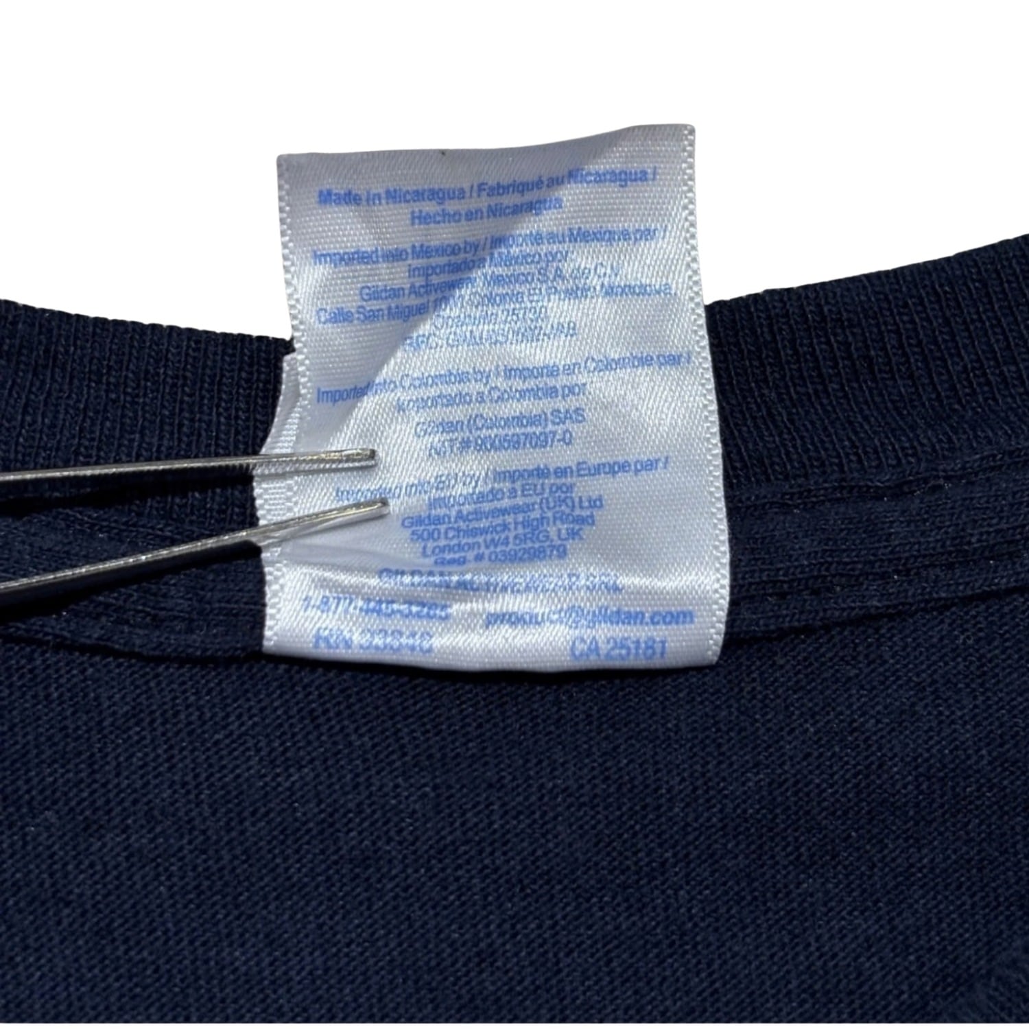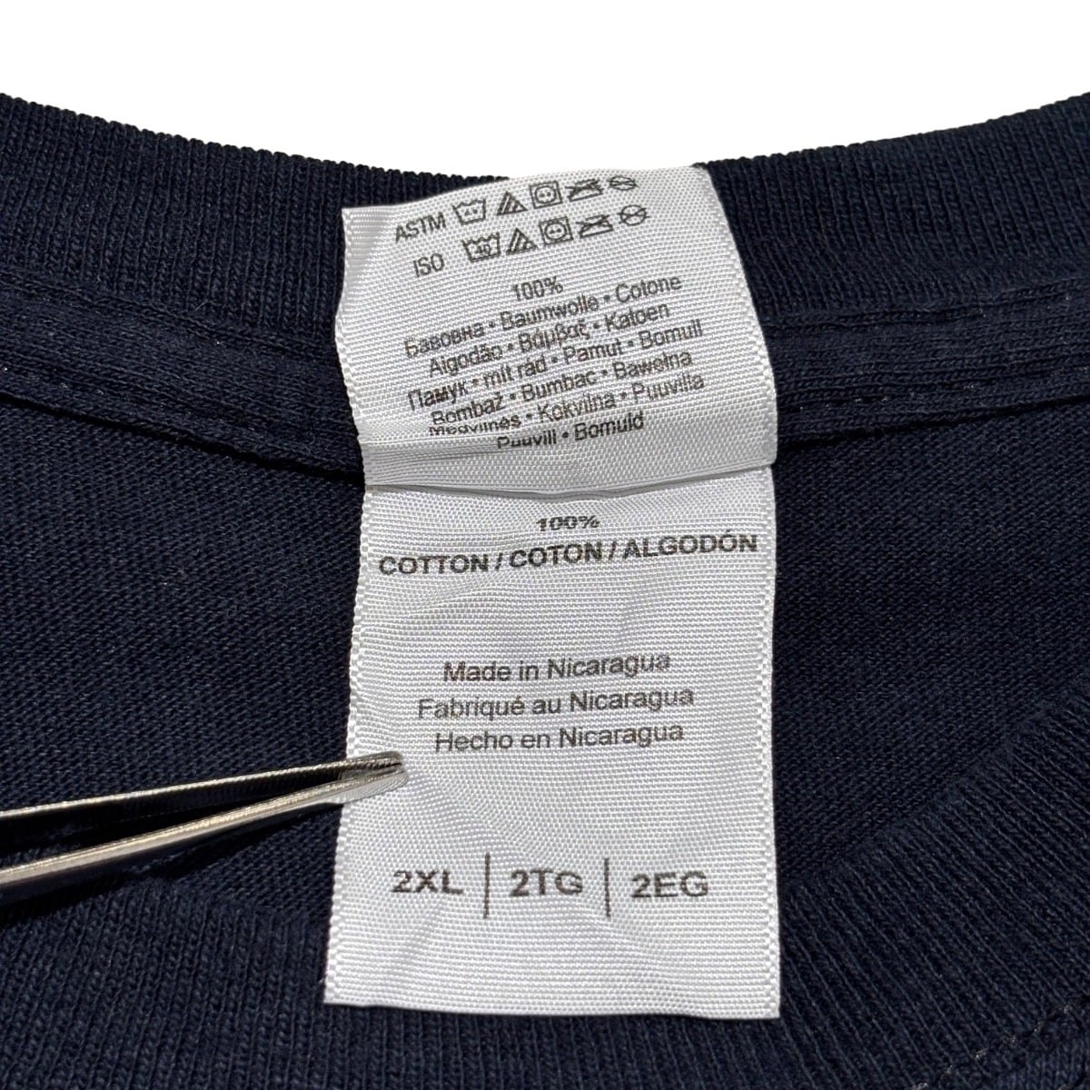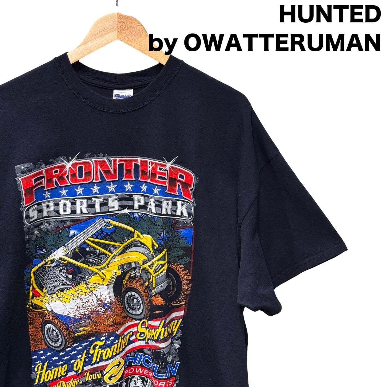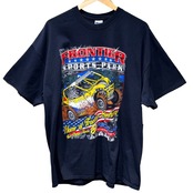 FRONTIER SPORTS PARKのロゴと大判のオフロードバギーを主体にしたグラフィックは、モーターカルチャー系のイベントやサーキット/ローカルスピードウェイで配られる、いわゆるイベントTやサーキット土産の文脈に近い表現です。GILDANの"Ultra Cotton"タグ、Made in Nicaragua表記、コットン100%の素材表記からは量産向けの定番ボディが使用されていることが読み取れ、これらの点を根拠に00s頃の制作と判断しています。