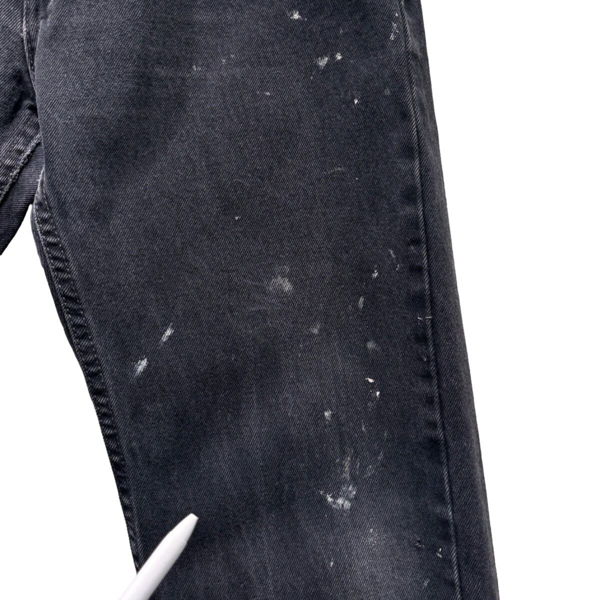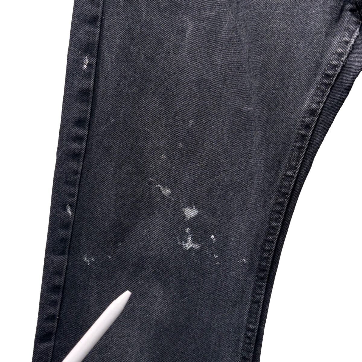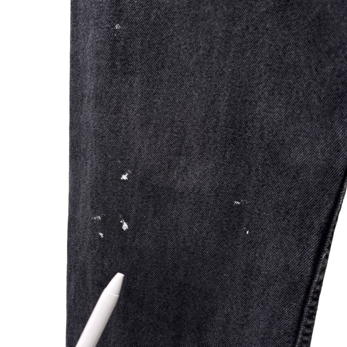 股上は30cmとやや深めで腰位置にゆとりが出るミッド〜ハイライズ寄りの作り。ワタリはゆったりめで裾にかけて程よく落ちるレギュラーストレートシルエットのため、スニーカーからブーツまで幅広く合わせやすい。生地はしっかりした厚手デニムで、全体に白いペイント飛びが点在し、コインポケット付近に軽い擦れもありますが、大きな破れは無く日常使いで味を出せるコンディションです。