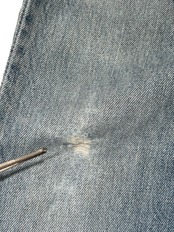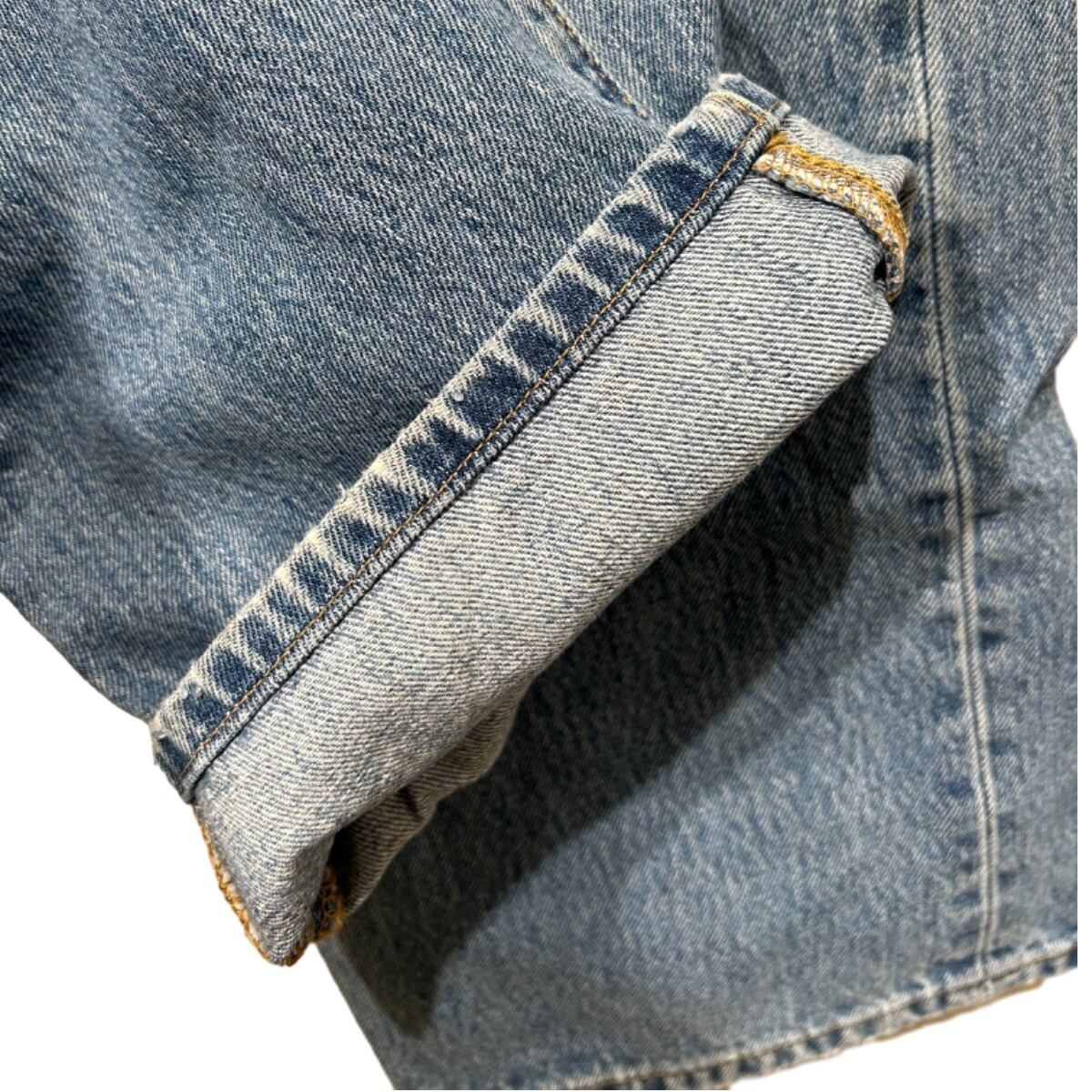 股上は29cmとやや深めのレギュラーハイライズ寄りで、ワタリ35cm・裾幅22cmのバランスは太すぎない定番のストレートシルエット。ボタンフライ仕様で本来の501らしさを残し、中肉厚のコットンデニムは経年で柔らかく馴染んでいます。腿〜膝にかけての自然な色落ちと、前腿に小さなリペア(ダーニング)あり。裾はオリジナルの仕上げが残っており、ざっくりとしたカジュアルな着こなしに合います。