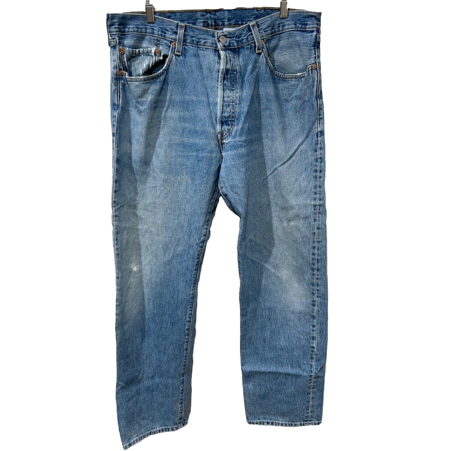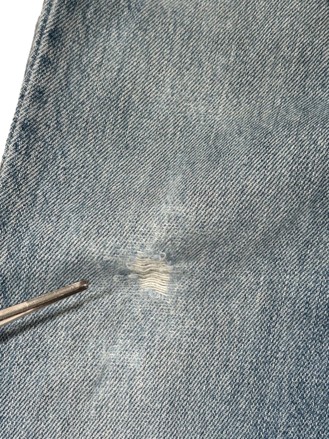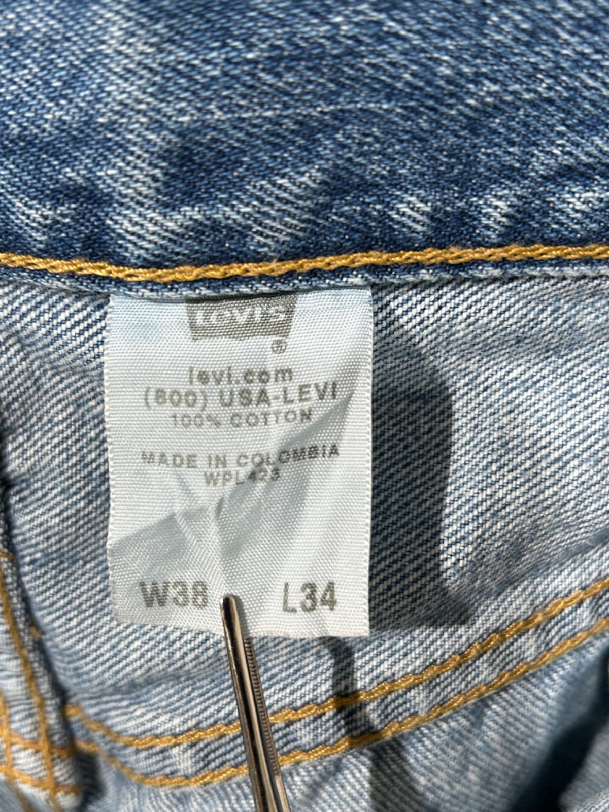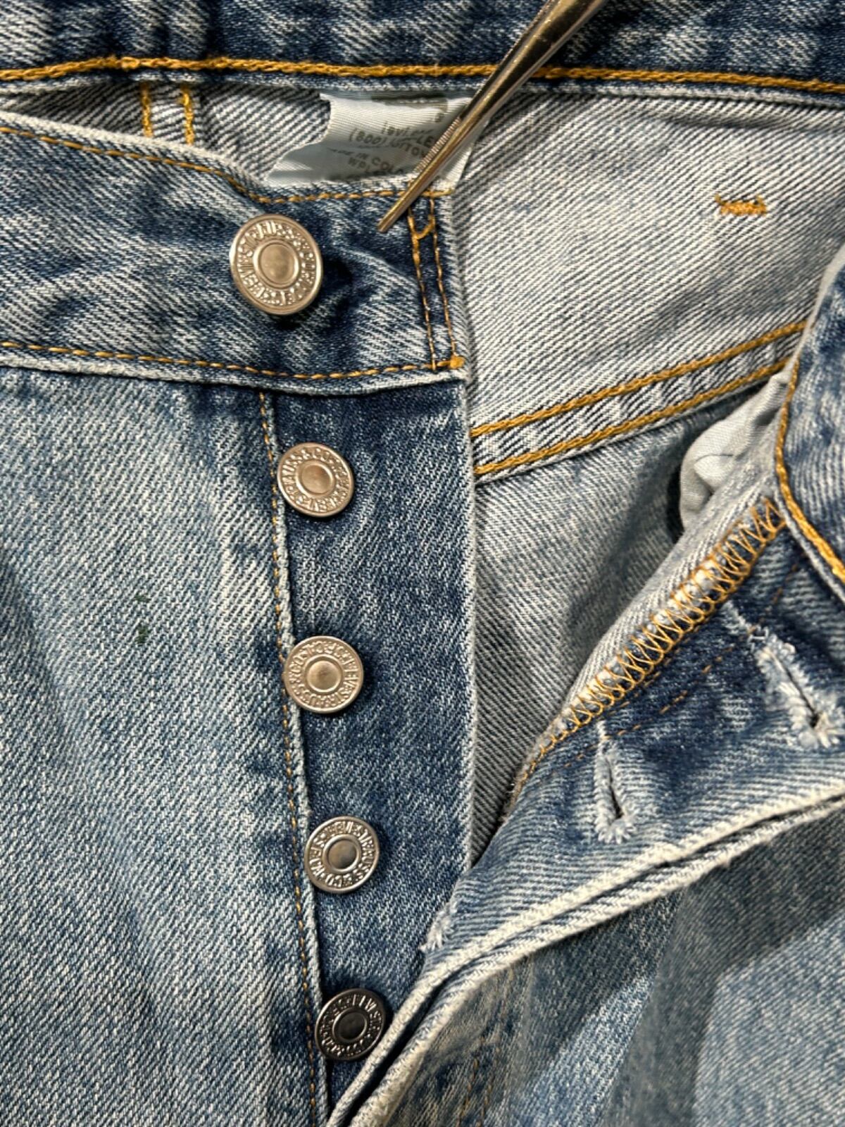Levi'sの定番モデルである501はワークウェア起源の基本形で、ボタンフライやパッチ表記でその系譜がわかります。今回の個体はボタンフライ/パッチに501表記、素材タグに100% COTTONと製造国の表記(Made in Colombia)がある仕様で、こうしたタグ構成と生産国から90sの量産期に作られた個体と推定されます。長年の着用で育った自然なフェードと部分的なリペアが入った“穿き込まれた一本”です。